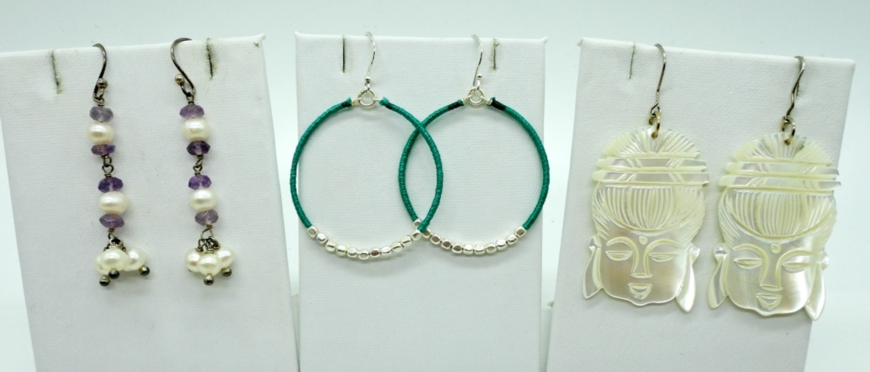 Japanese Face Mother of Pearl Pierced Earrings, 2.5″. Freshwater Pearl & Amethyst Beaded Earrings, 2″. Green Thread & Silver Tone Bead Earrings.