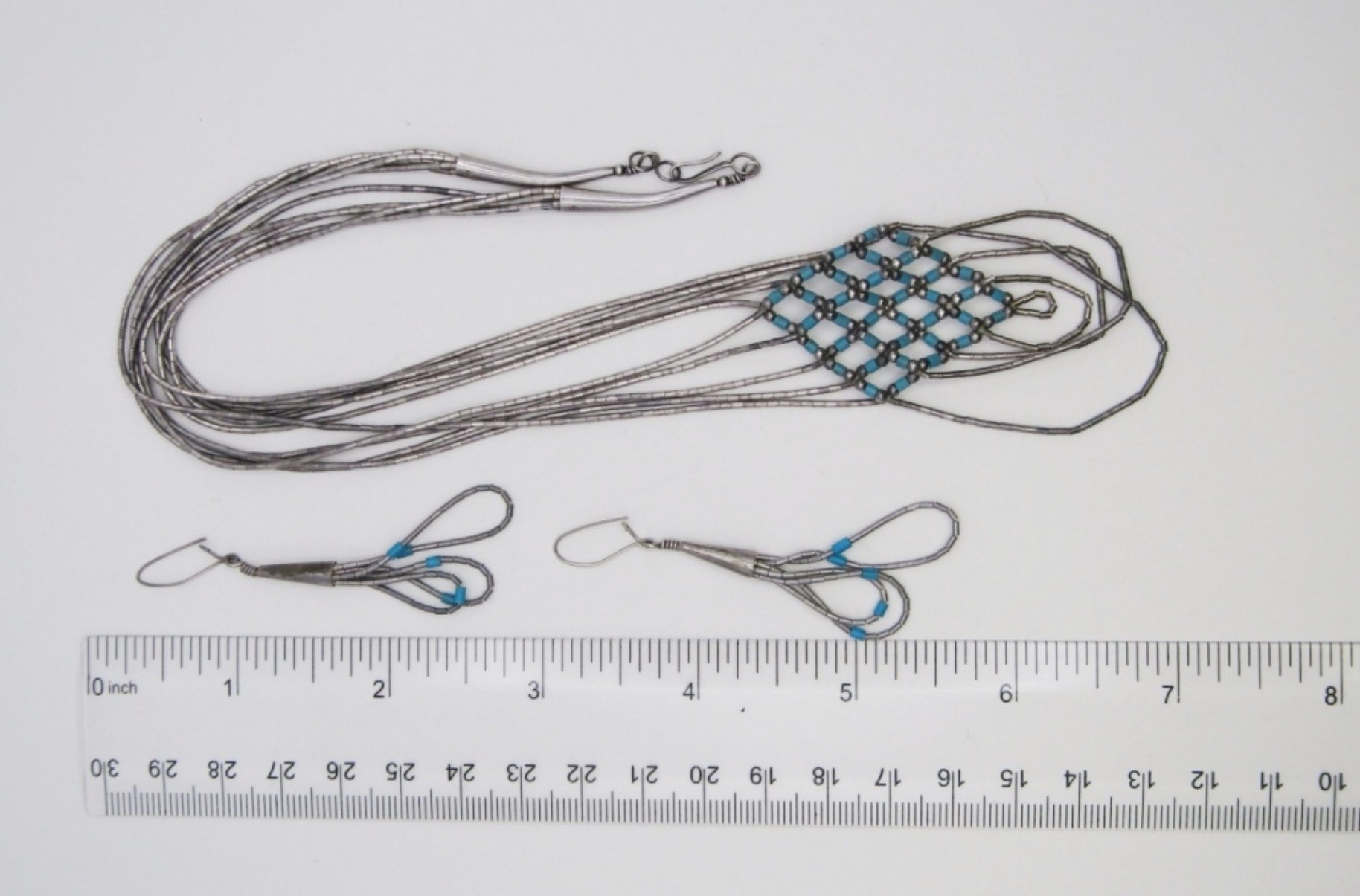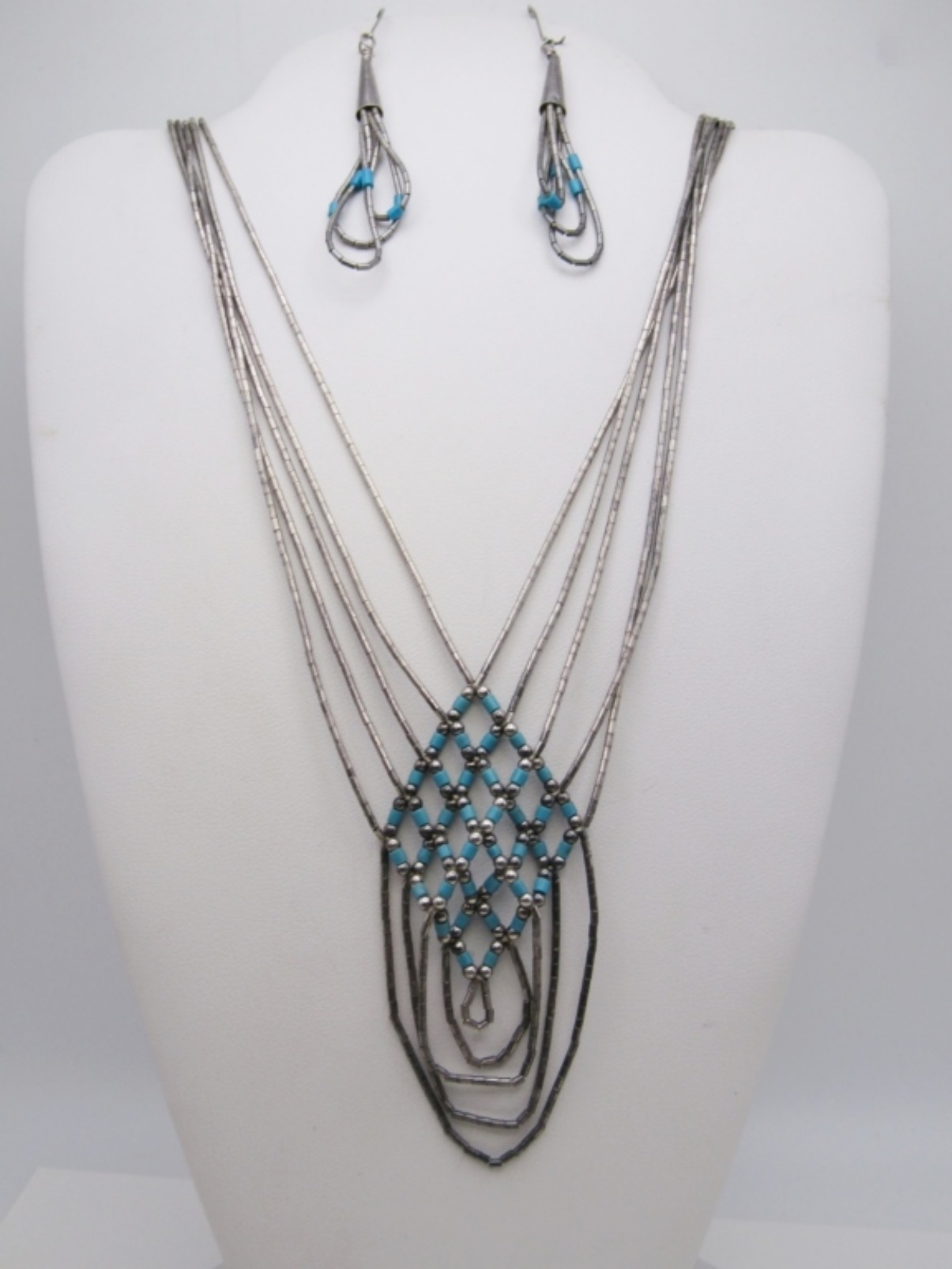 13 DWT. MATCHING 16″ NECKLACE & 2″ DANGLE PIERCED EARRINGS. WITH TURQUOISE ACCENT BEADS. ALL STAMPED STERLING.