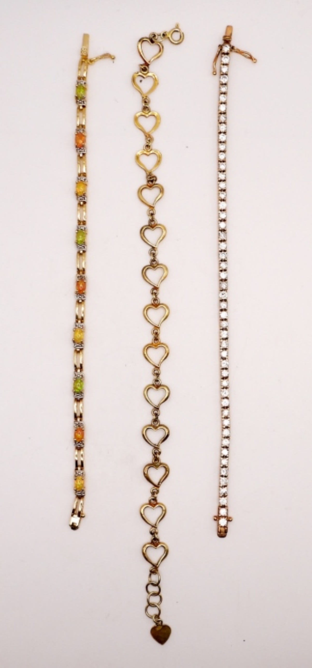 (1) white rhinestone 7″ bracelet, (1) opalite 7″ bracelet, and (1) heart 9-10″ anklet. (DWT 19.9)