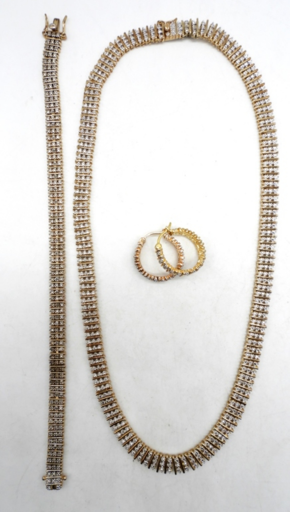 45DWT, CLEAR STONES ALL LONG EACH, 18 1/2″ LONG NECKLACE AND 8 1/2″LONG BRACELET, PIERCED MATCHING EARRINGS ALL STAMPED 925 CHINA