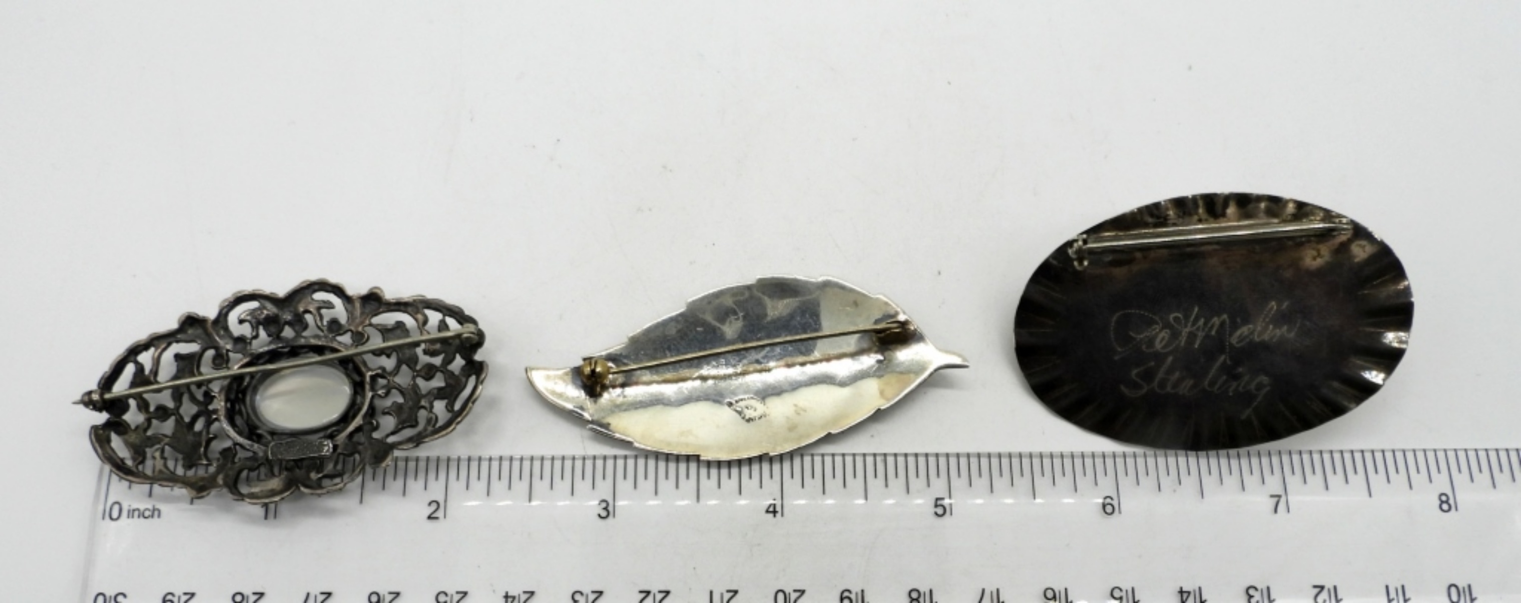 24.6 DWT, ALL NEAR 2 1/2″ LONG, 1 SIAM (STAMPED ON BACK BUT HARD TO READ), 1 OVAL WITH BLUE STONE ETCHED STERLING ON BACK, 1- STAMPED STERLING