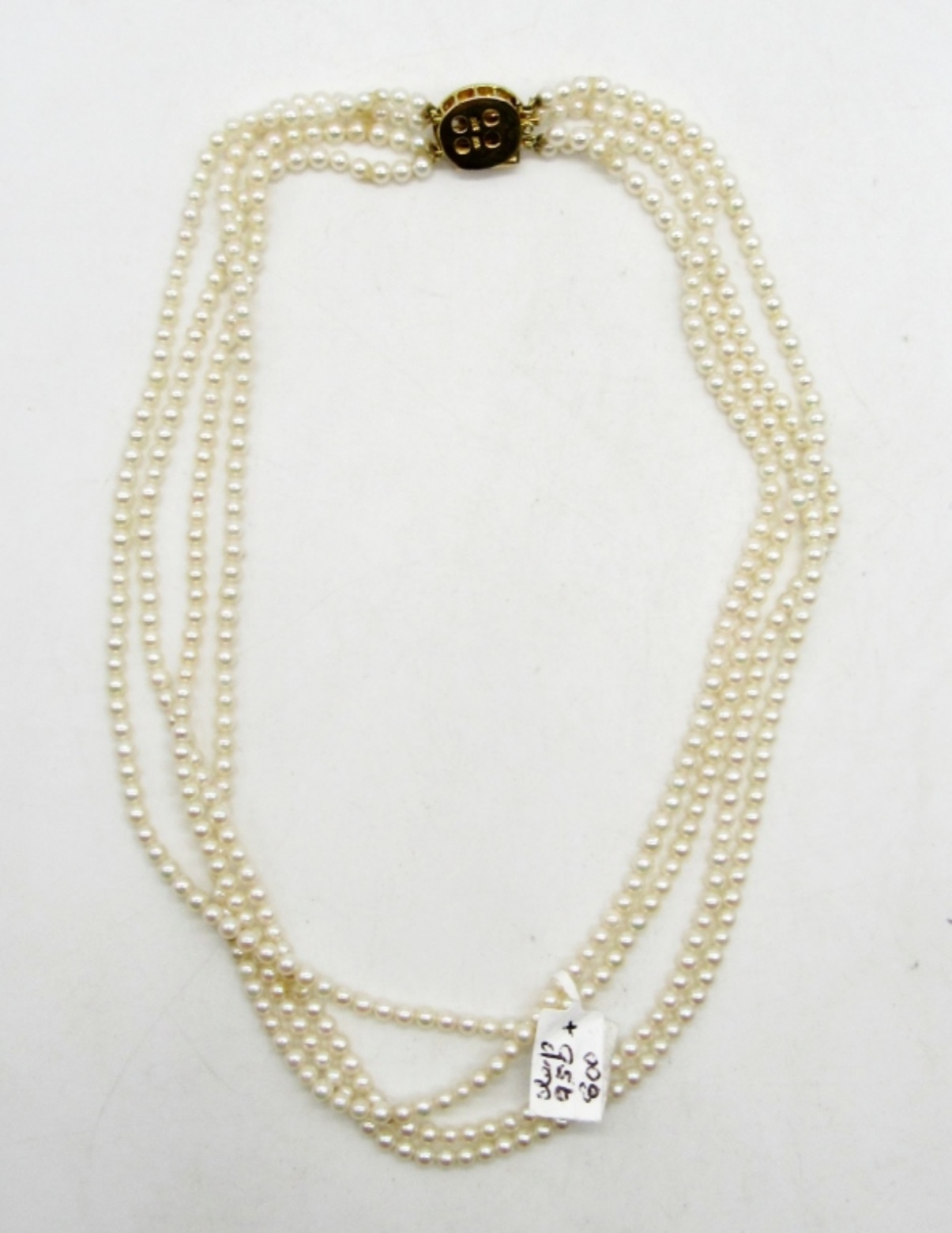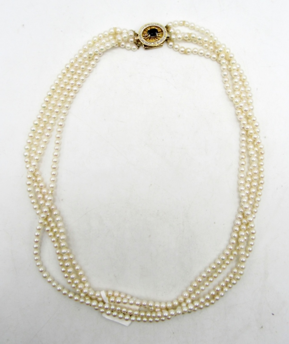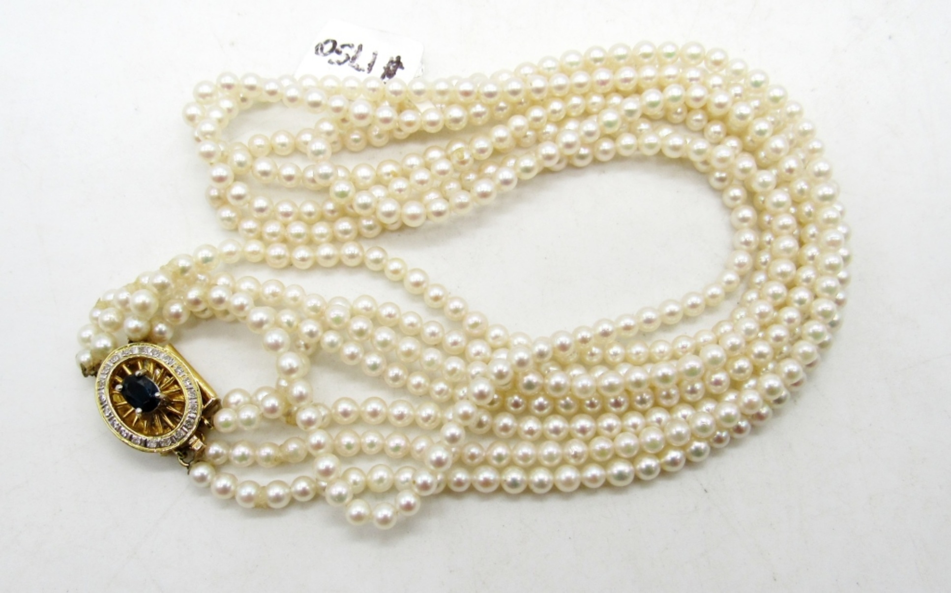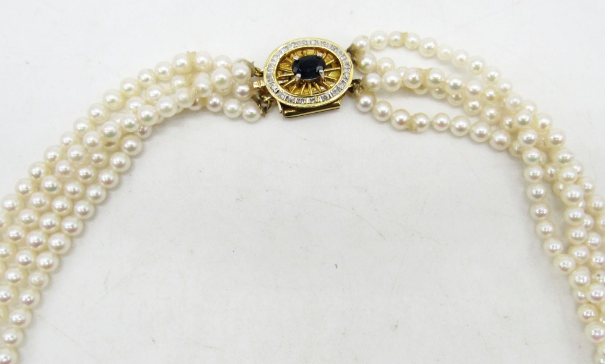 15″ choker pearl necklace with stunning 14K 585 clasp with sapphire stone and halo of moissanite diamonds. (DWT 4.3)