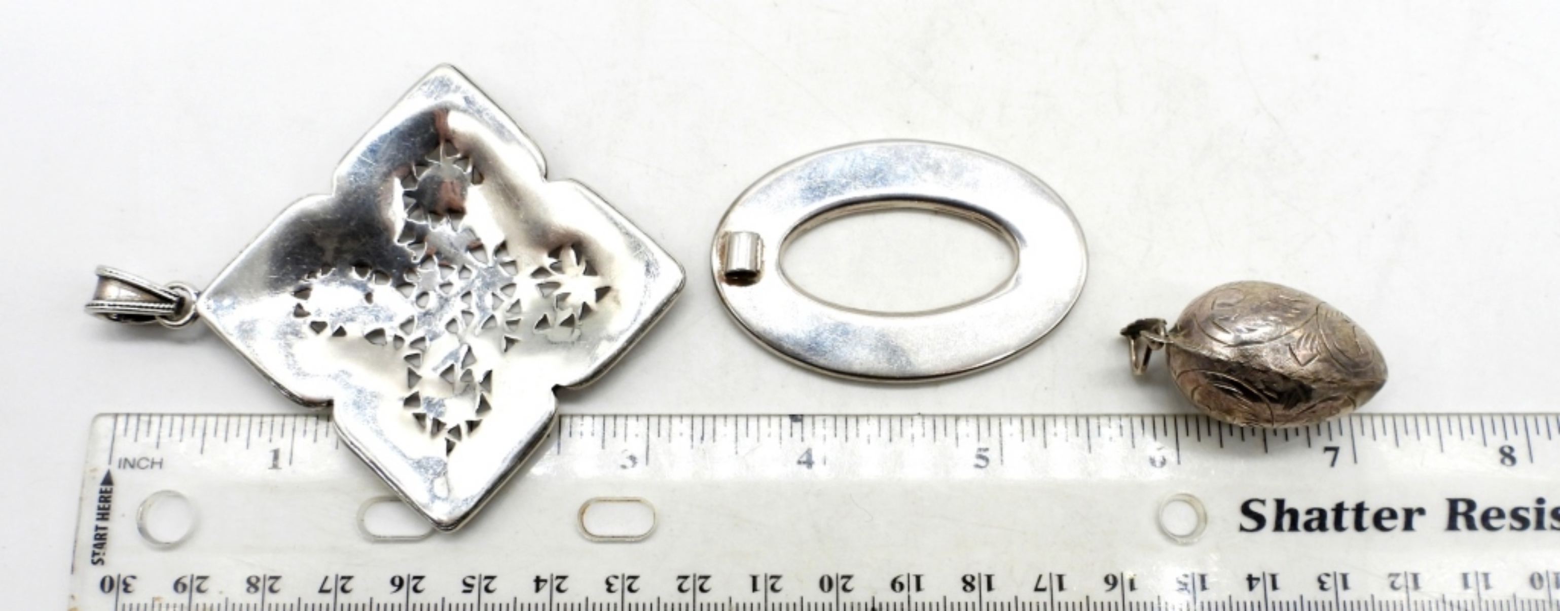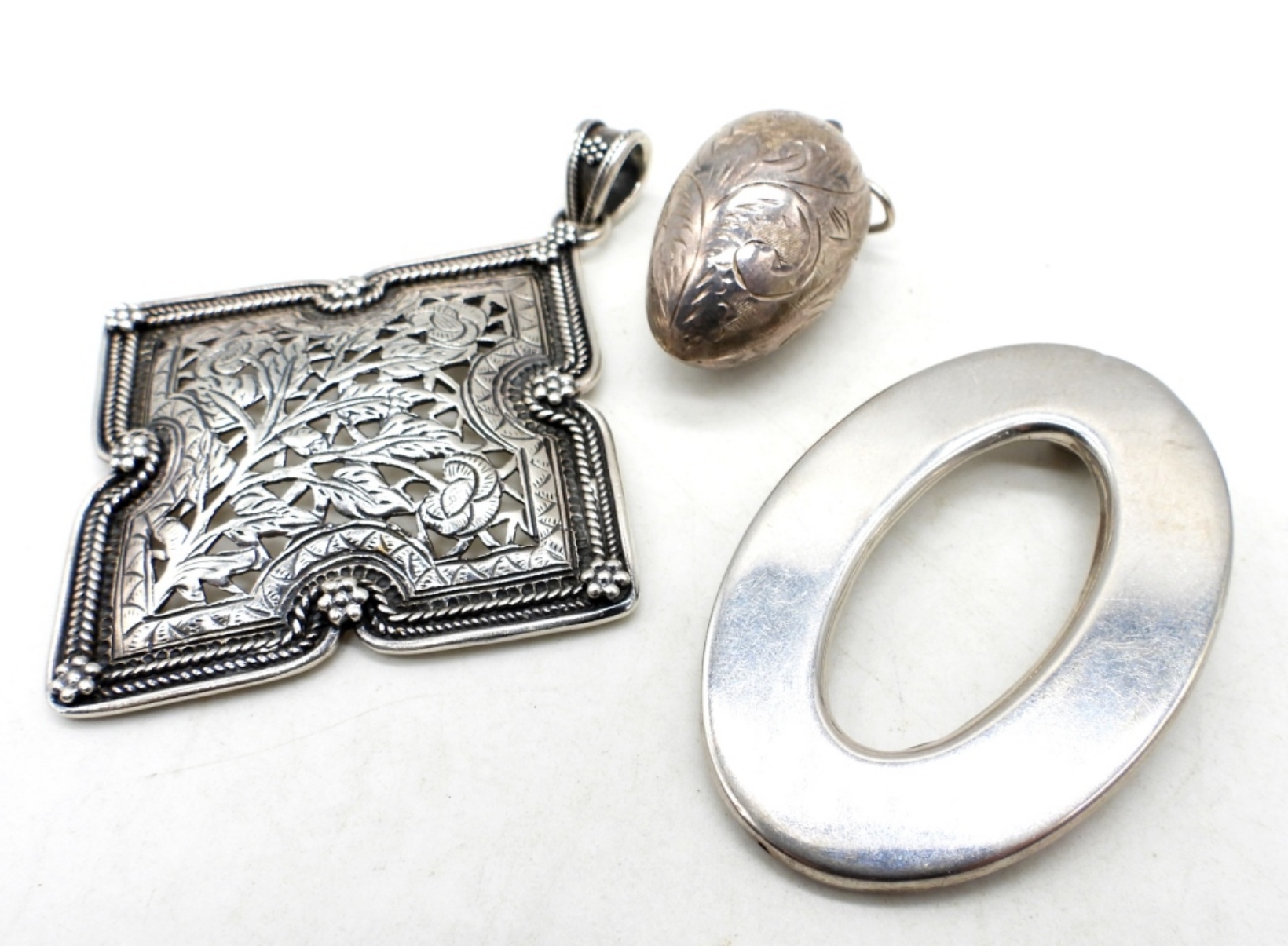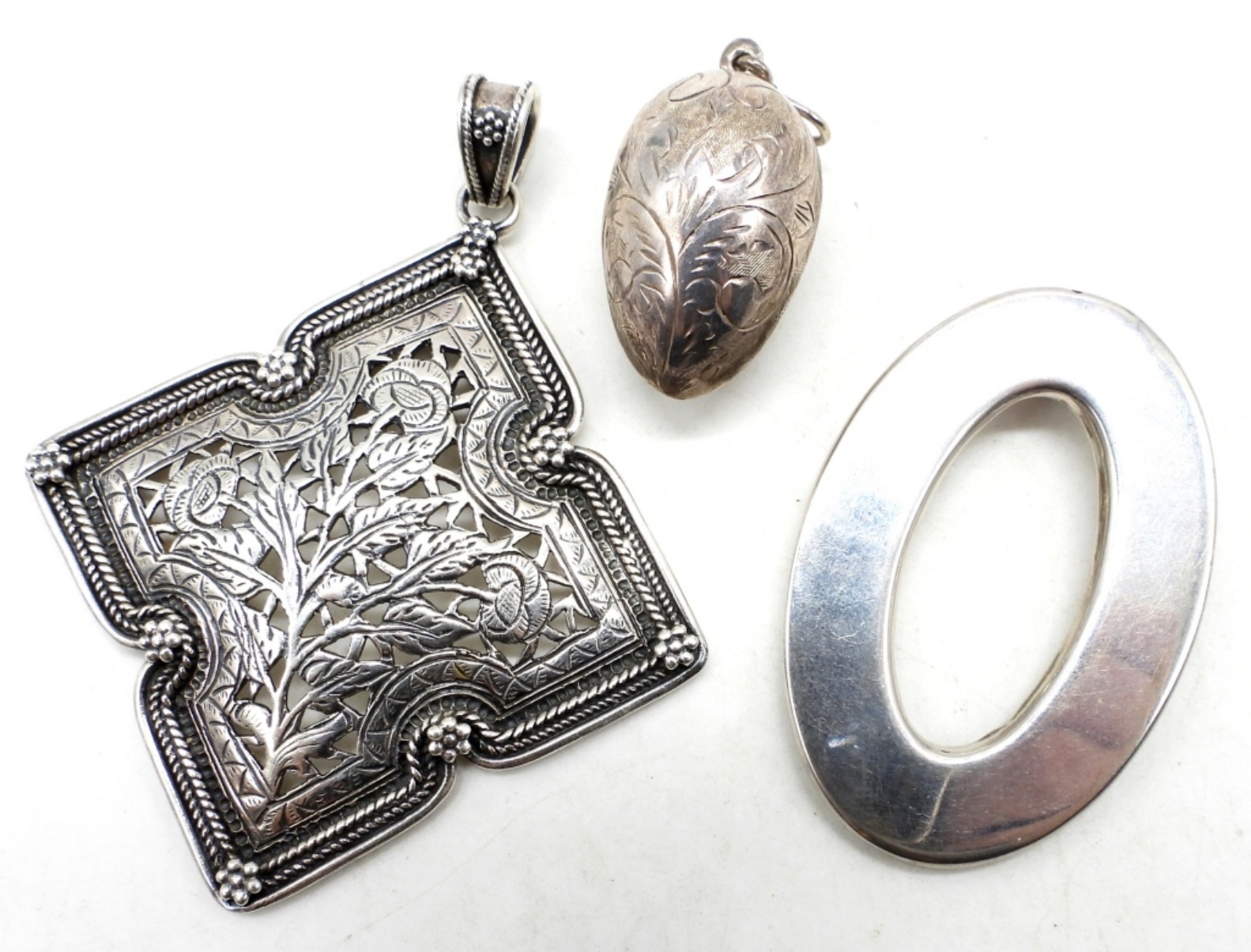 29DWT, ALL STAMPED 925, ETCHED EGG 1 1/2″ LONG, 1 OVAL 2″ LONG, 1 FLOWER PENDANT 3″ LONG