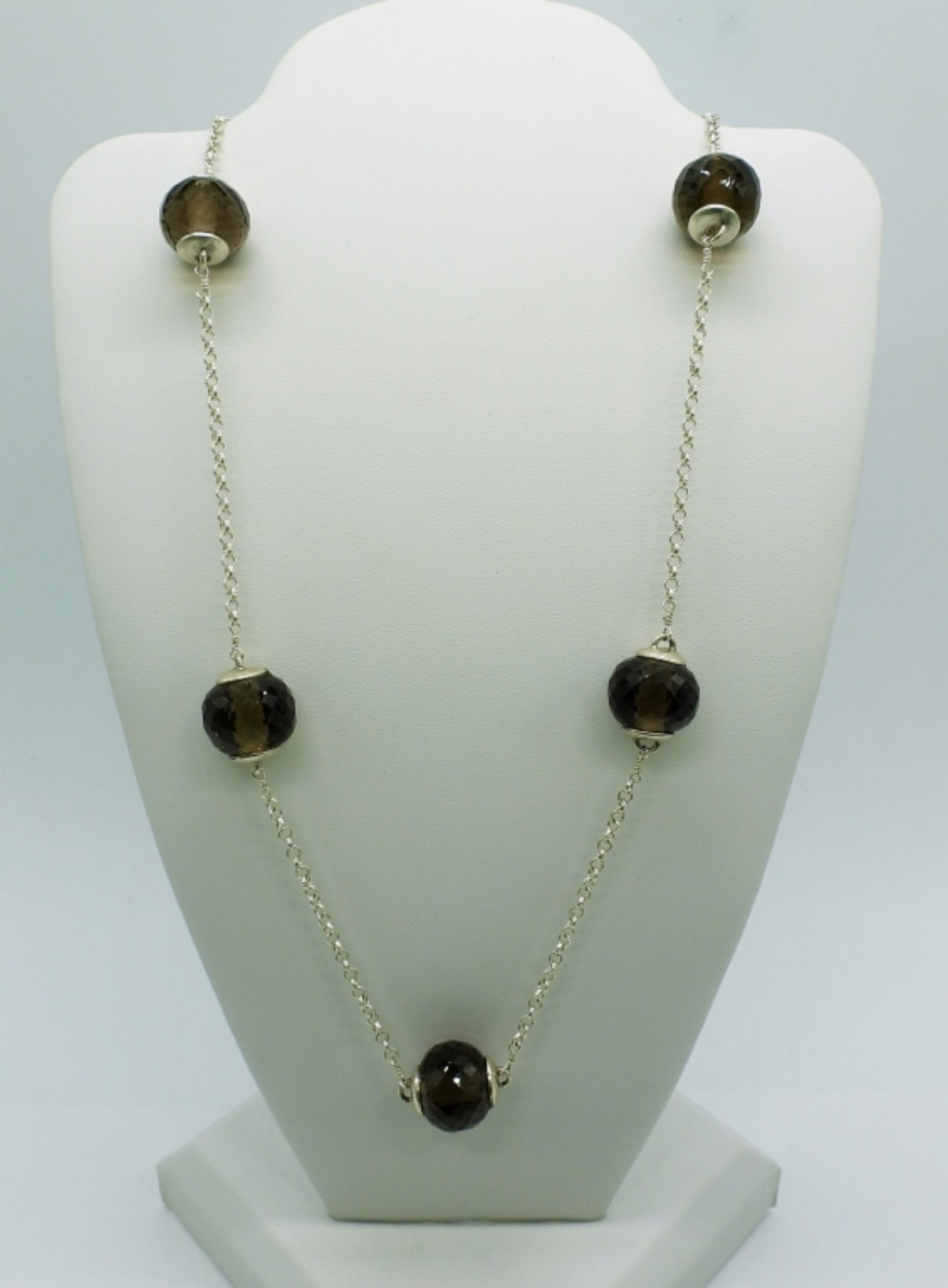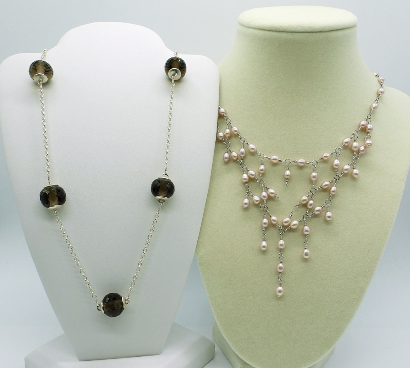 16-22 inches long. One has faceted smoky quartz beads. The other is pink pearl and needs very minor repair. (DWT 30.3)