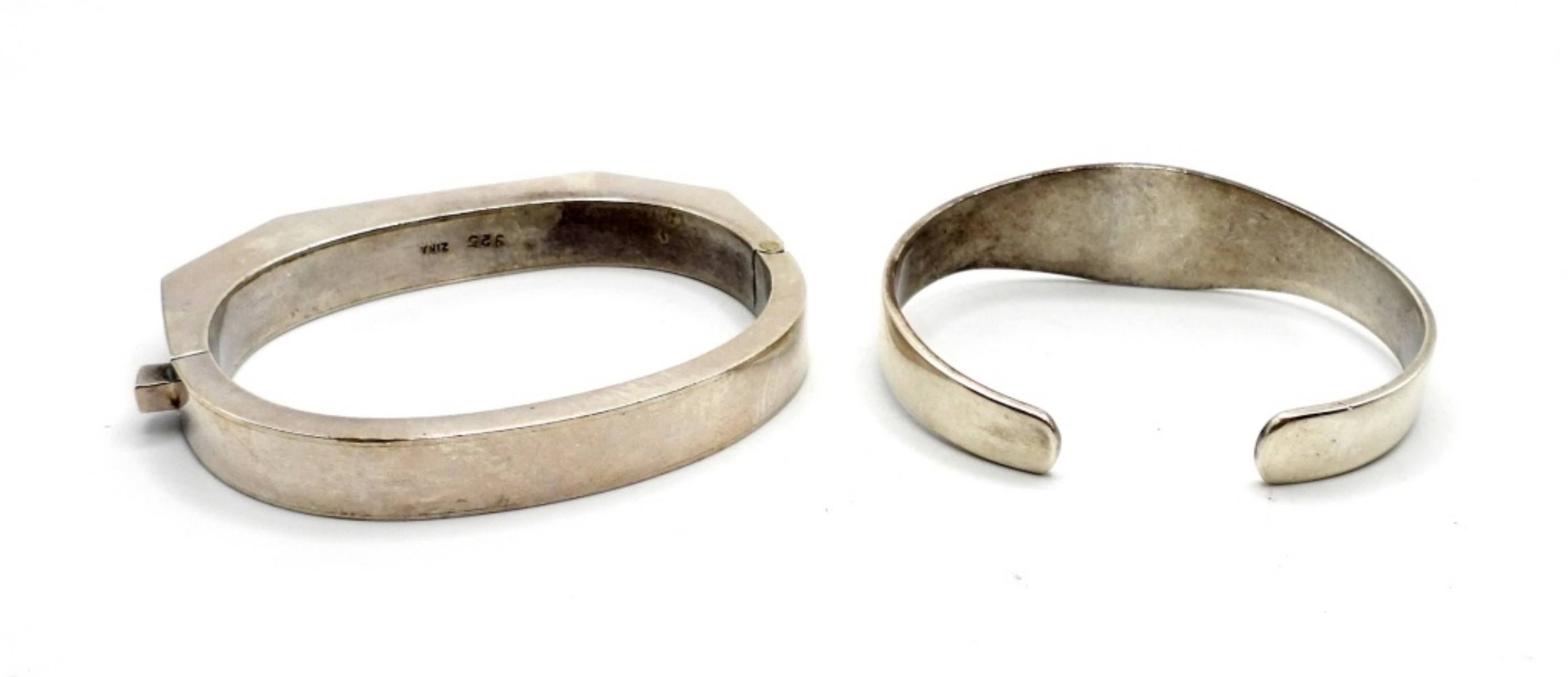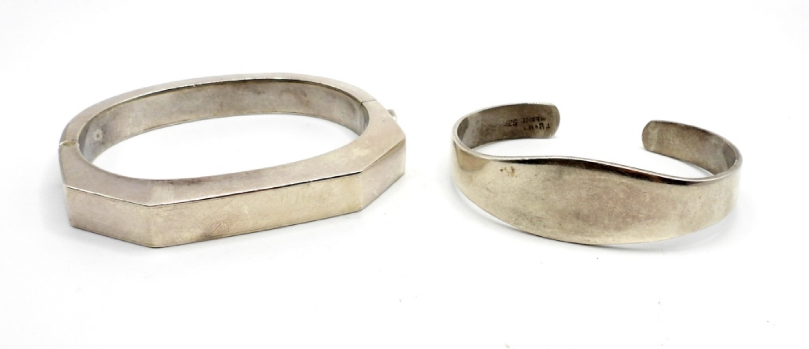 One Victoria Taxco Mexico bangle bracelet with working clasp, 7 inches, and one TB-41 Sterling cuff bracelet, 6 inches. Both in good condition. (41.7 DWT)