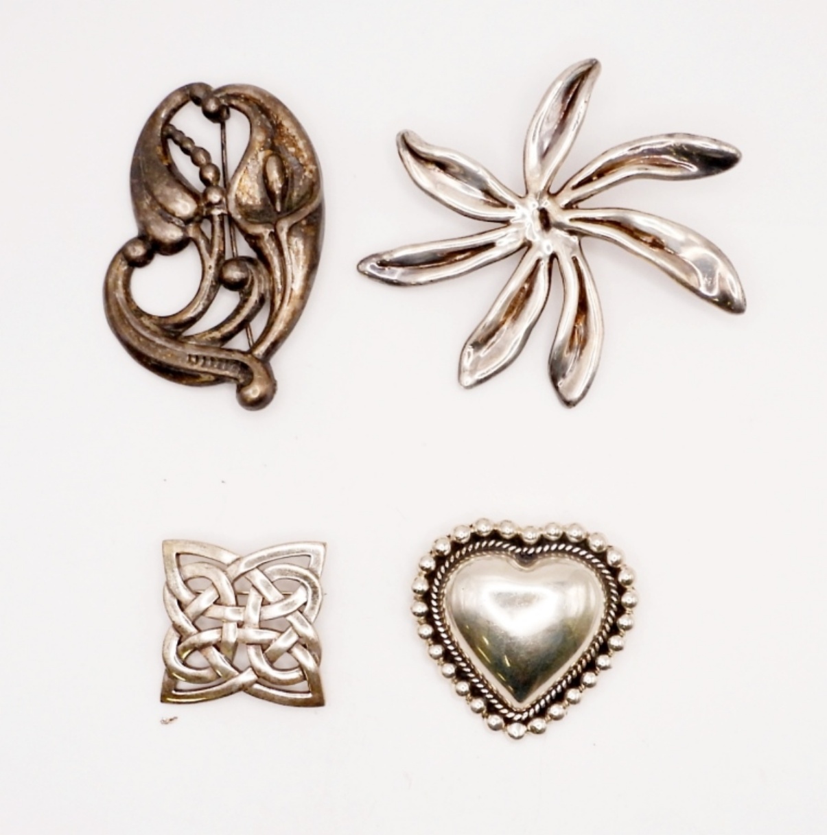 Flower, heart, and more. Four pins in various sizes 1-2.5 inches (DWT 40.8)