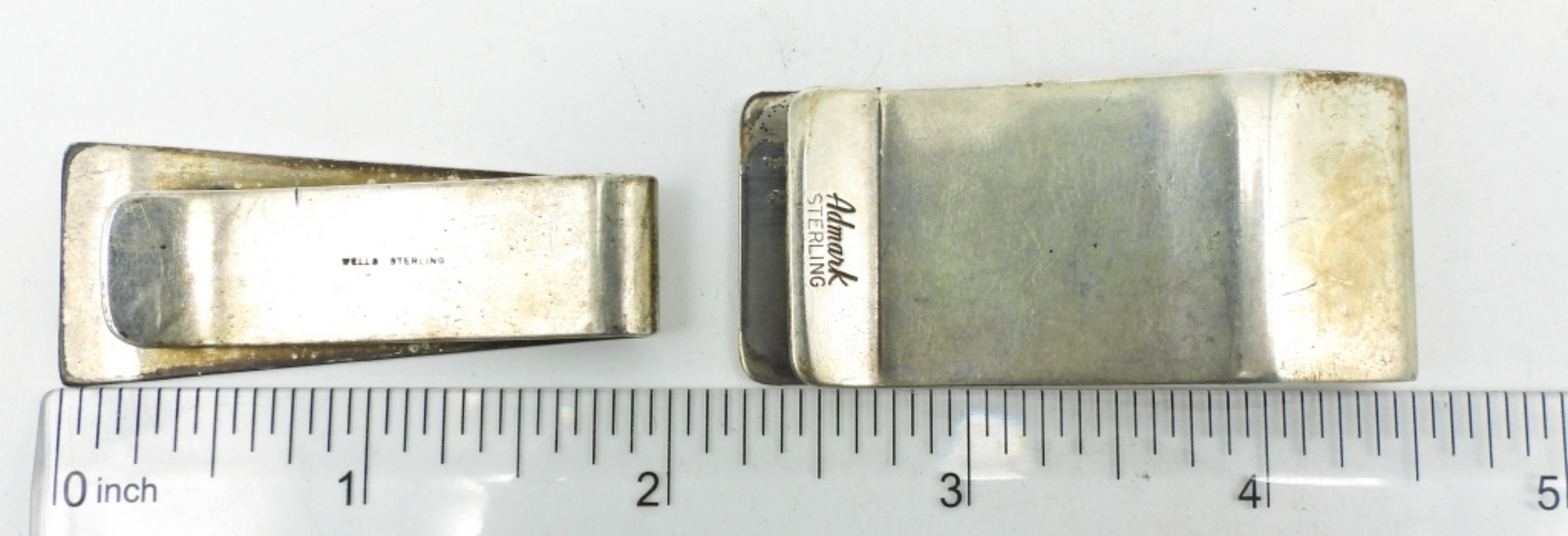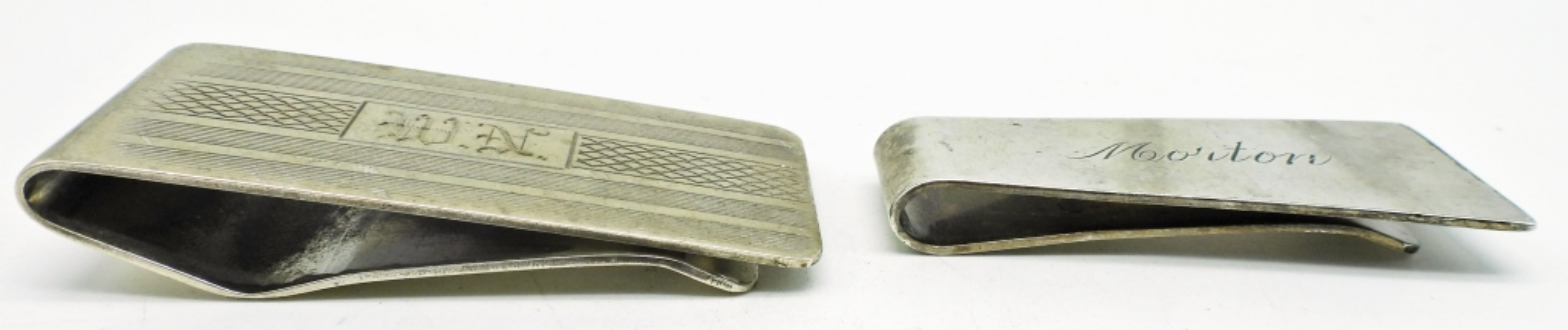 29DWT, 1- 2″ LONG, ENGRAVED MORTON, STAMPED WELLS STERLING ON THE BACK, 1- LITTLE OVER 2″ LONG ETCHED DESIGN ENGRAVED M.N. STAMPED ON THE BACK ADMARK STERLING