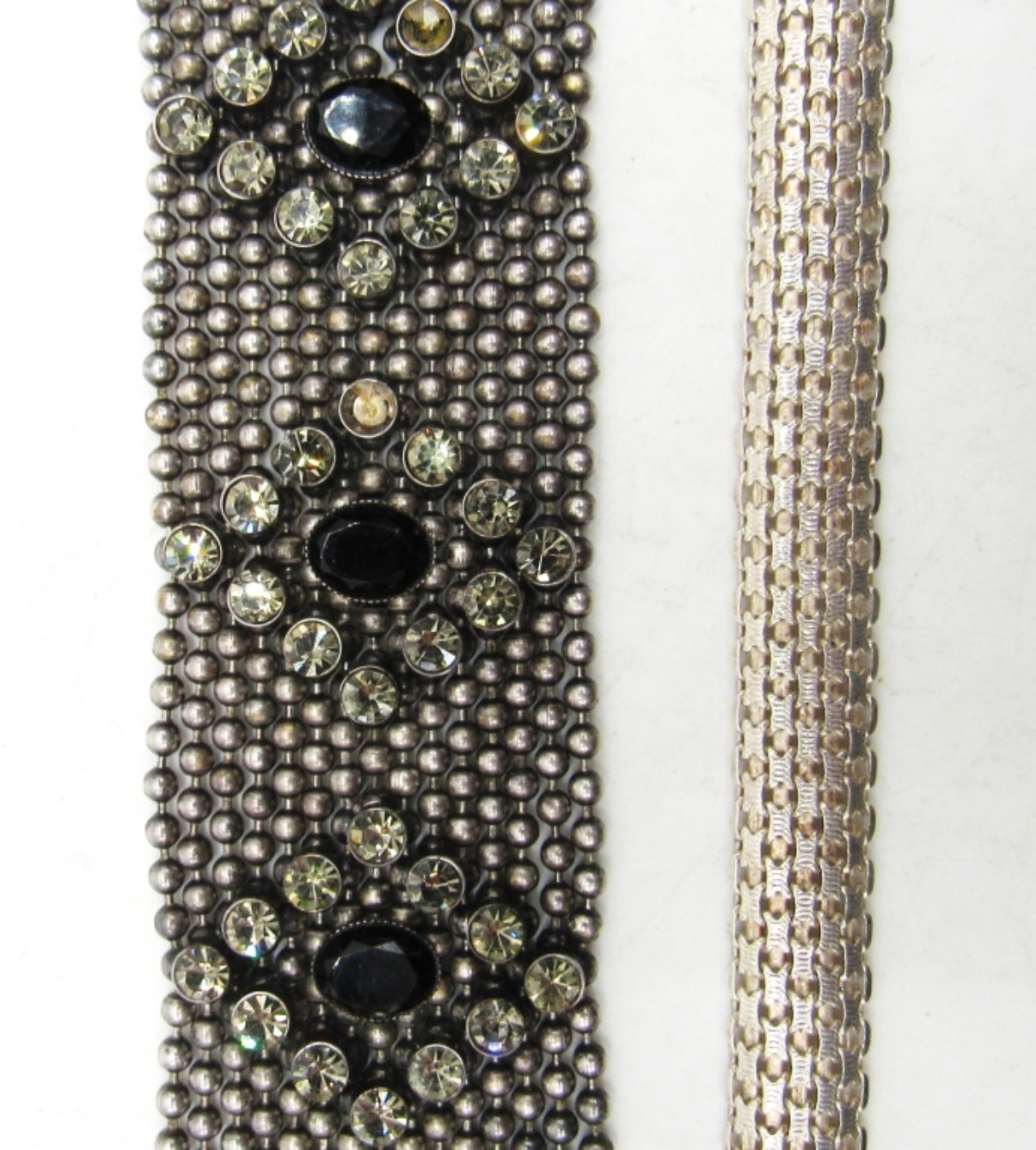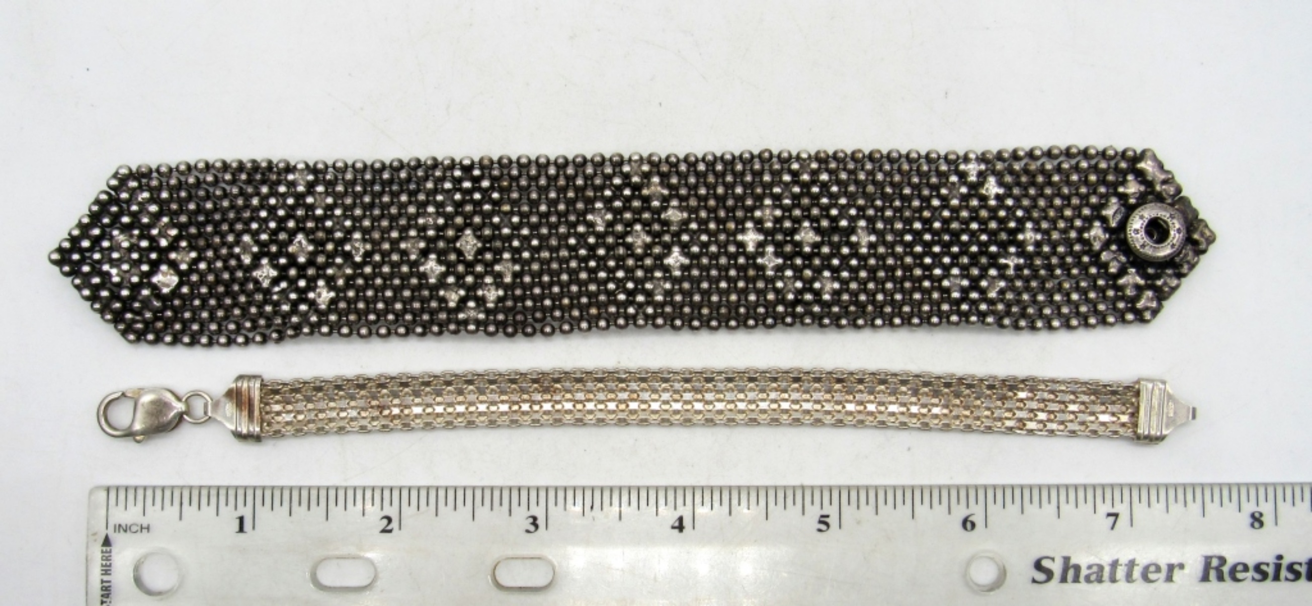 One rhinestone snap closure bracelet 7.5 inches (missing two stones). One flat braided chain bracelet measures 7 inches. (DWT 50.8)