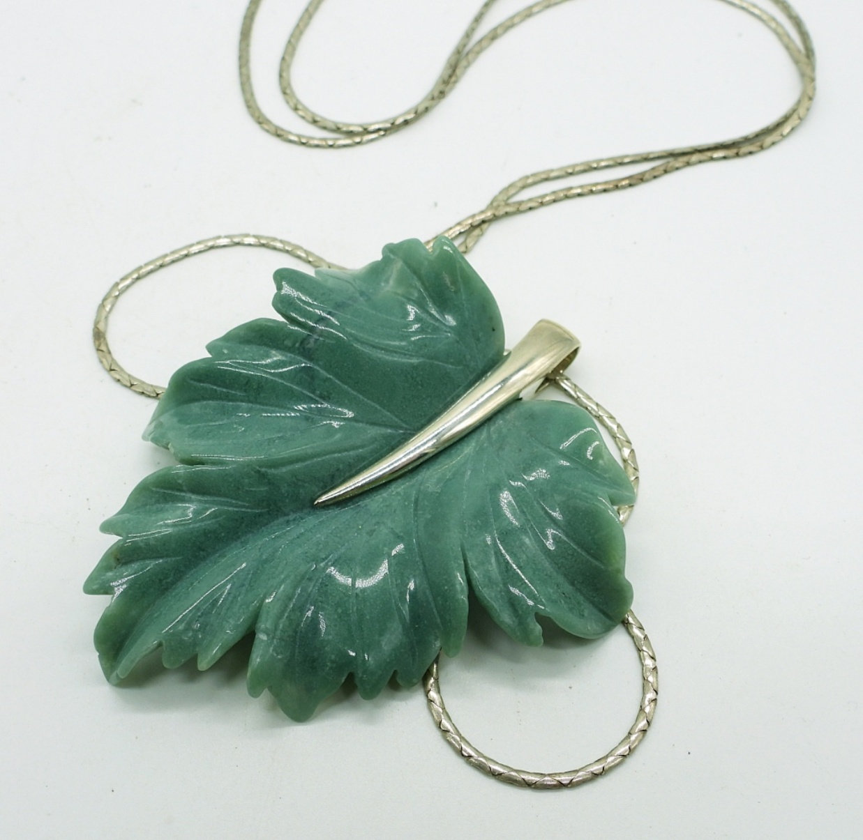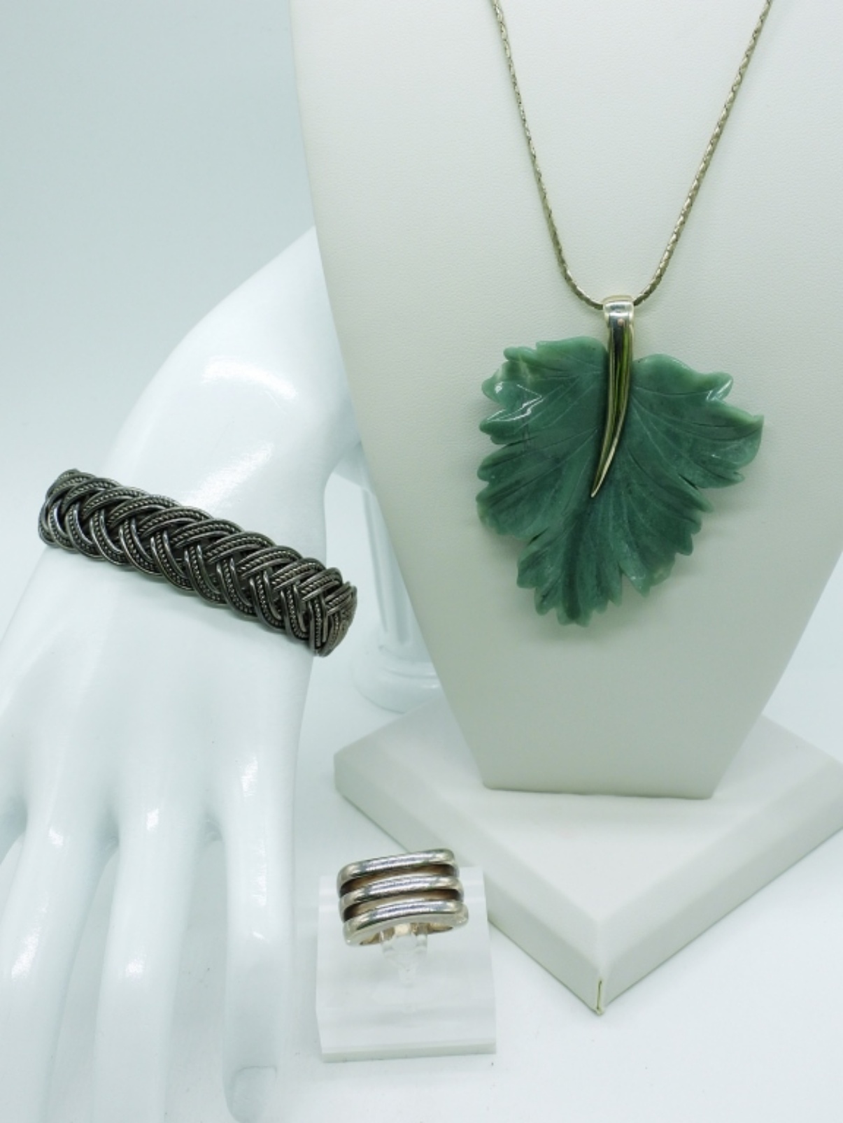 Turquoise colored carved stone leaf pendant measures 2.75 inches on a 24 inch flat chain. Braided cuff bracelet. Ring is size 8. Very nice set! (DWT 56.9)