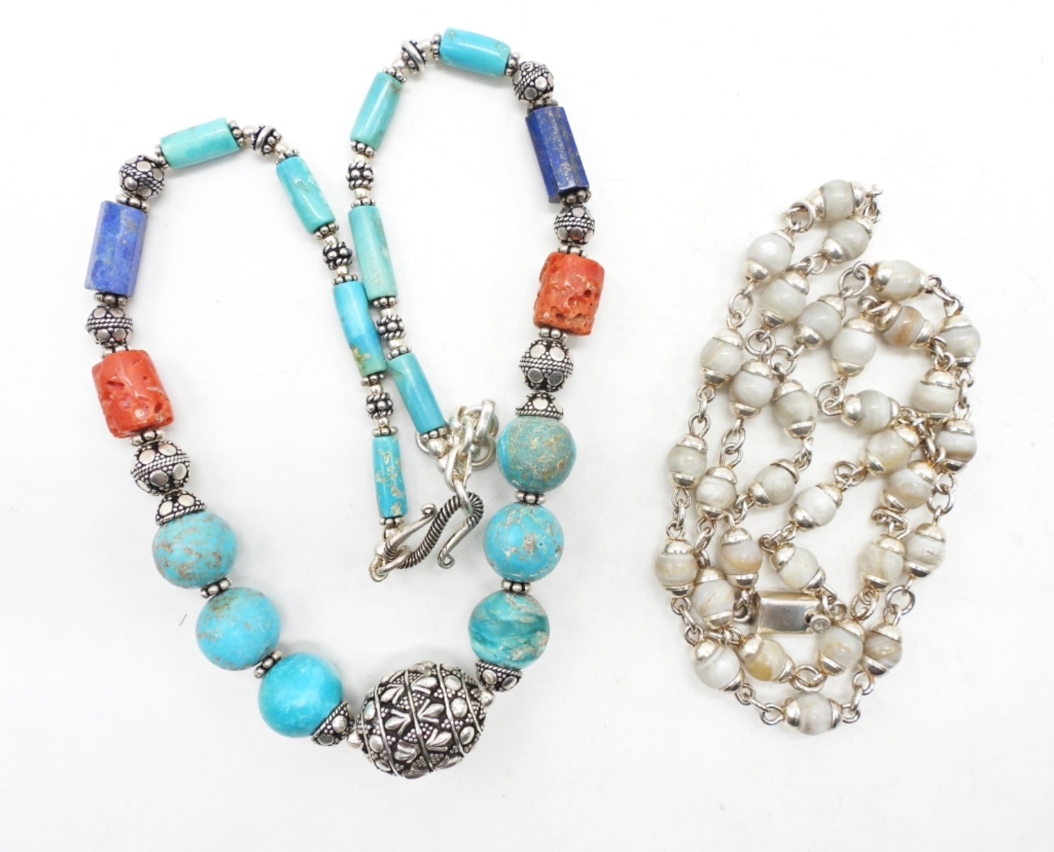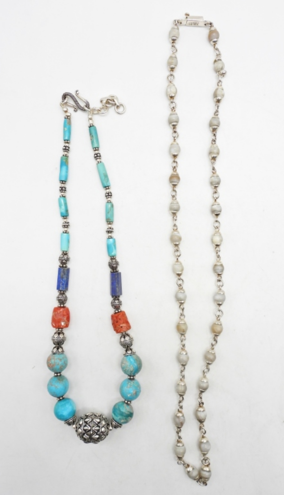 Two necklaces 16 & 20 inches long with turquoise colored stones, and shell beads with other natural stone beads. (DWT 50.6)