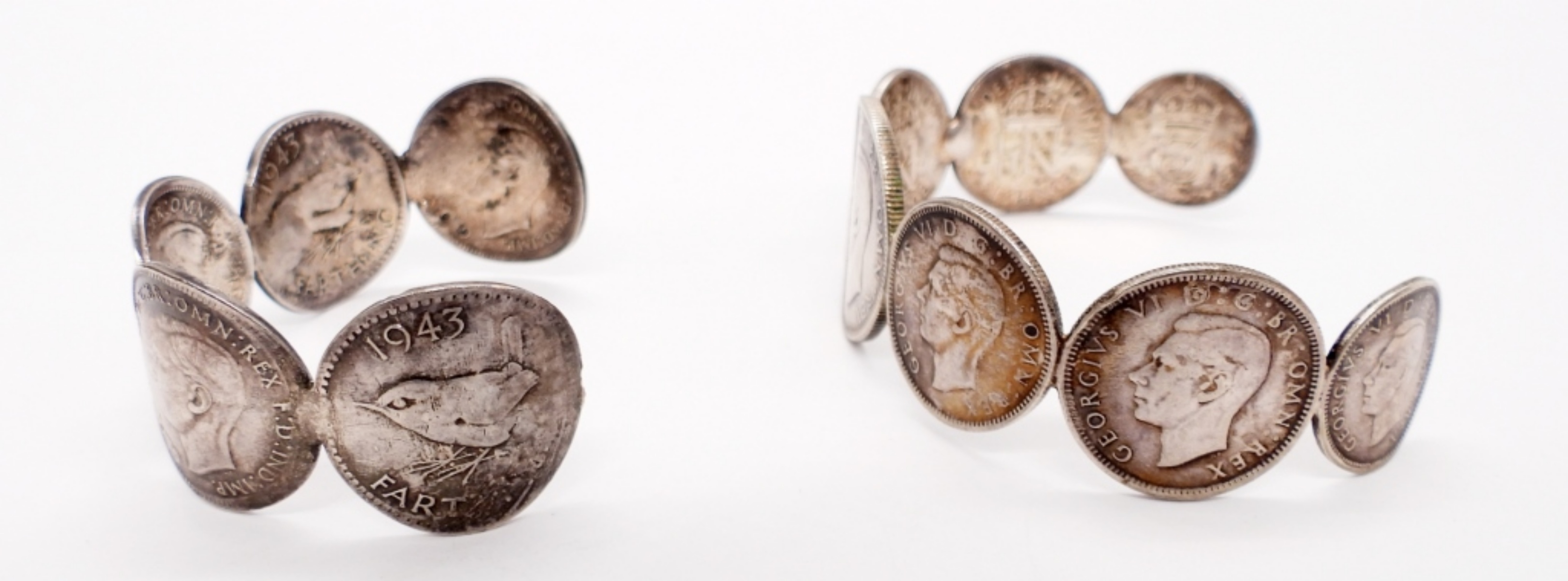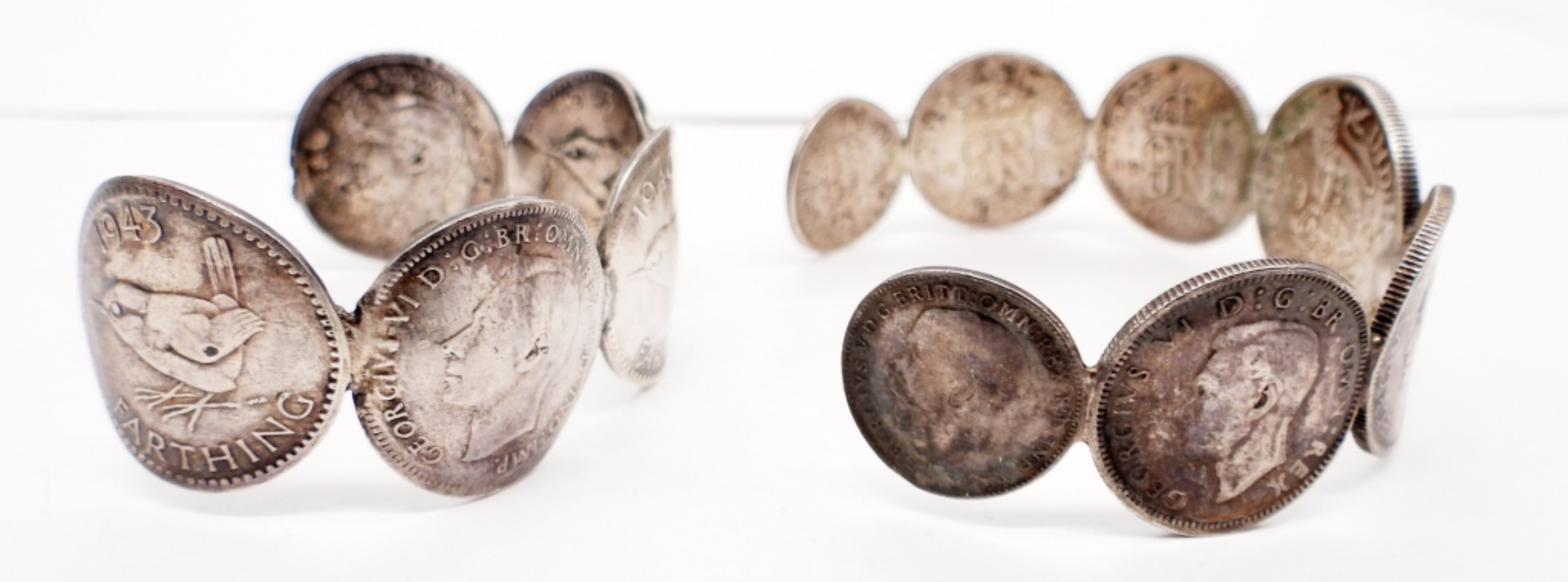 Two Sterling Great Britian Coin Cuff Bracelets. Both Bracelets are made solely of Coins. 4″ & 5″. (22.6 DWT)