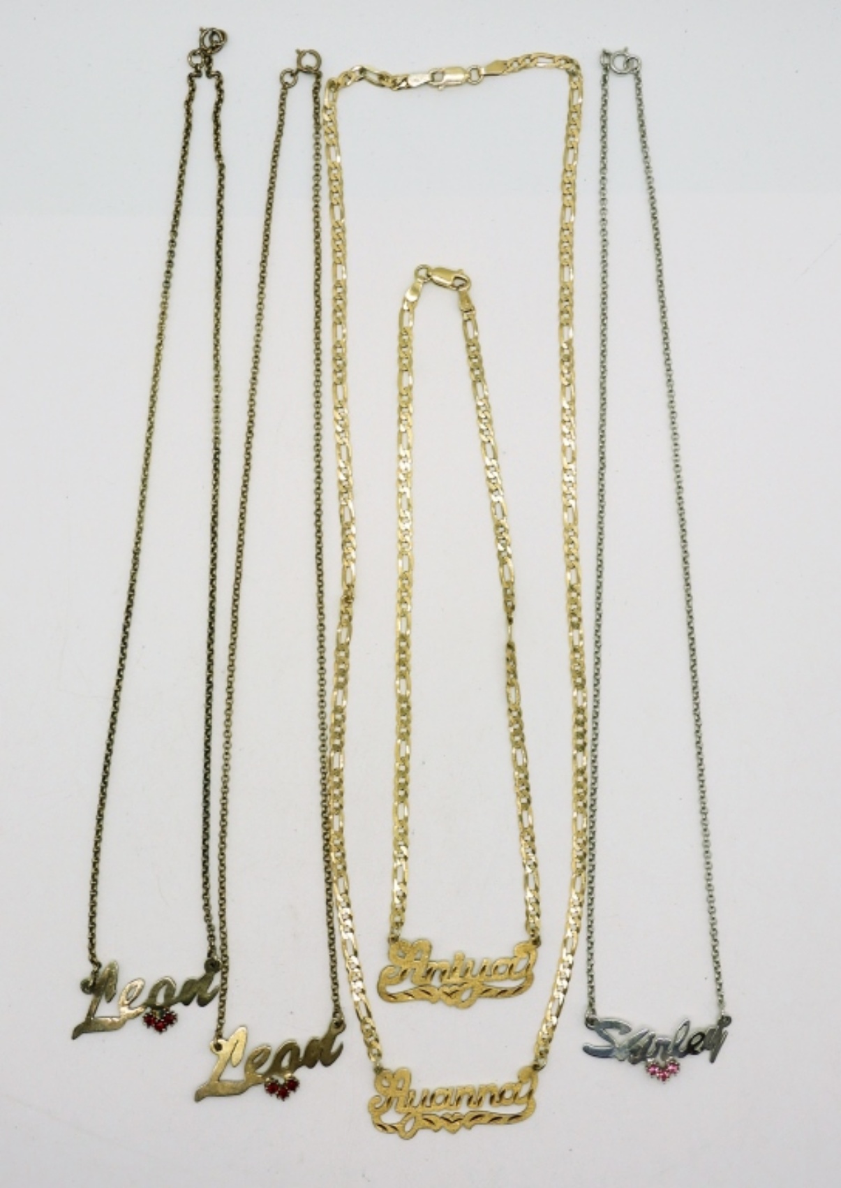 Five Sterling Name Necklaces in Gold Tone & Silver Tone. Names are: Ayanna, Aniya, Lean & Shirley. 18.5DWT