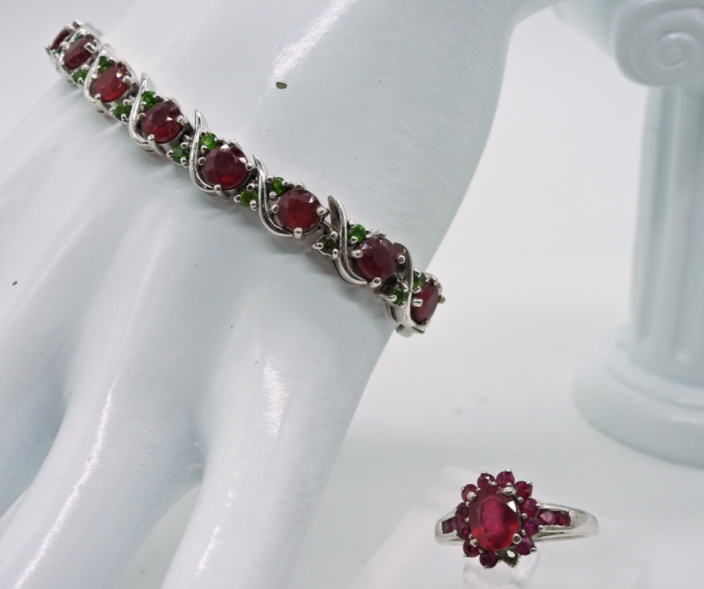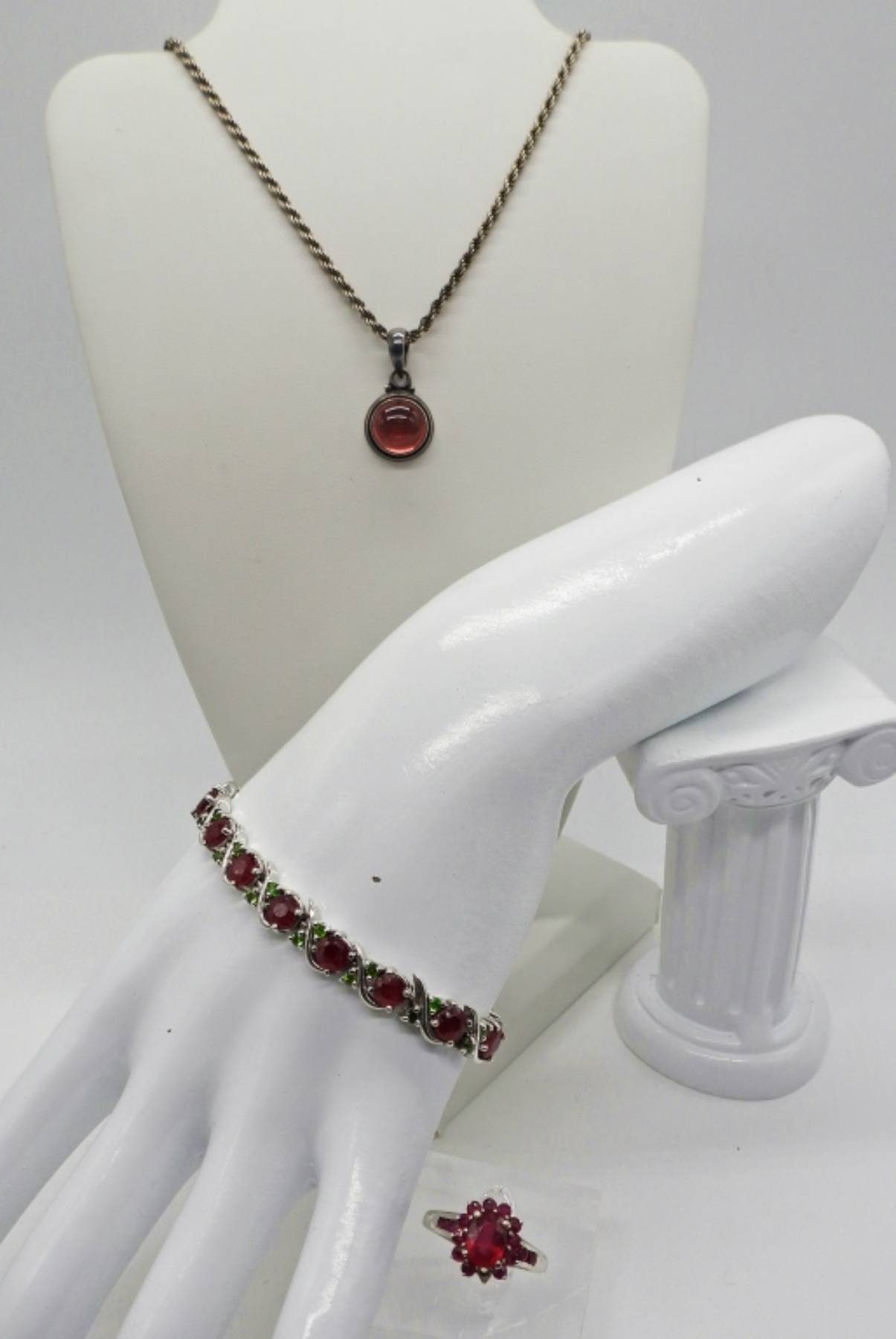 Sterling Ruby Gemstone Ring Size 8, Matching 7″ Bracelet and 20 inch Sterling Ruby Colored Gemstone Necklace. 23.6DWT