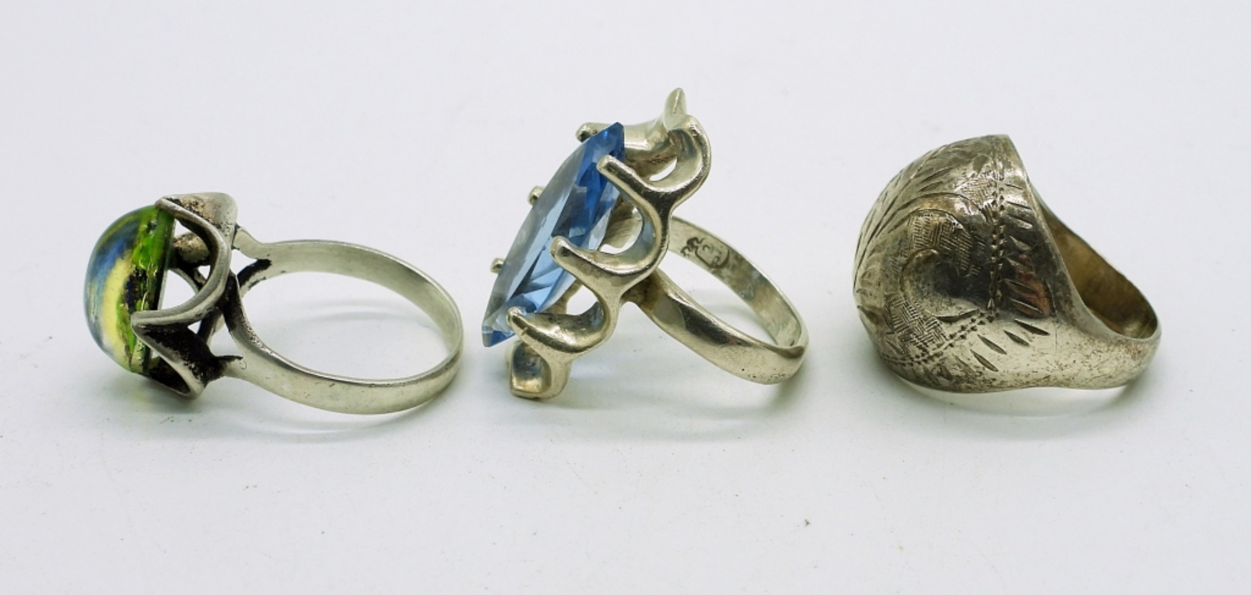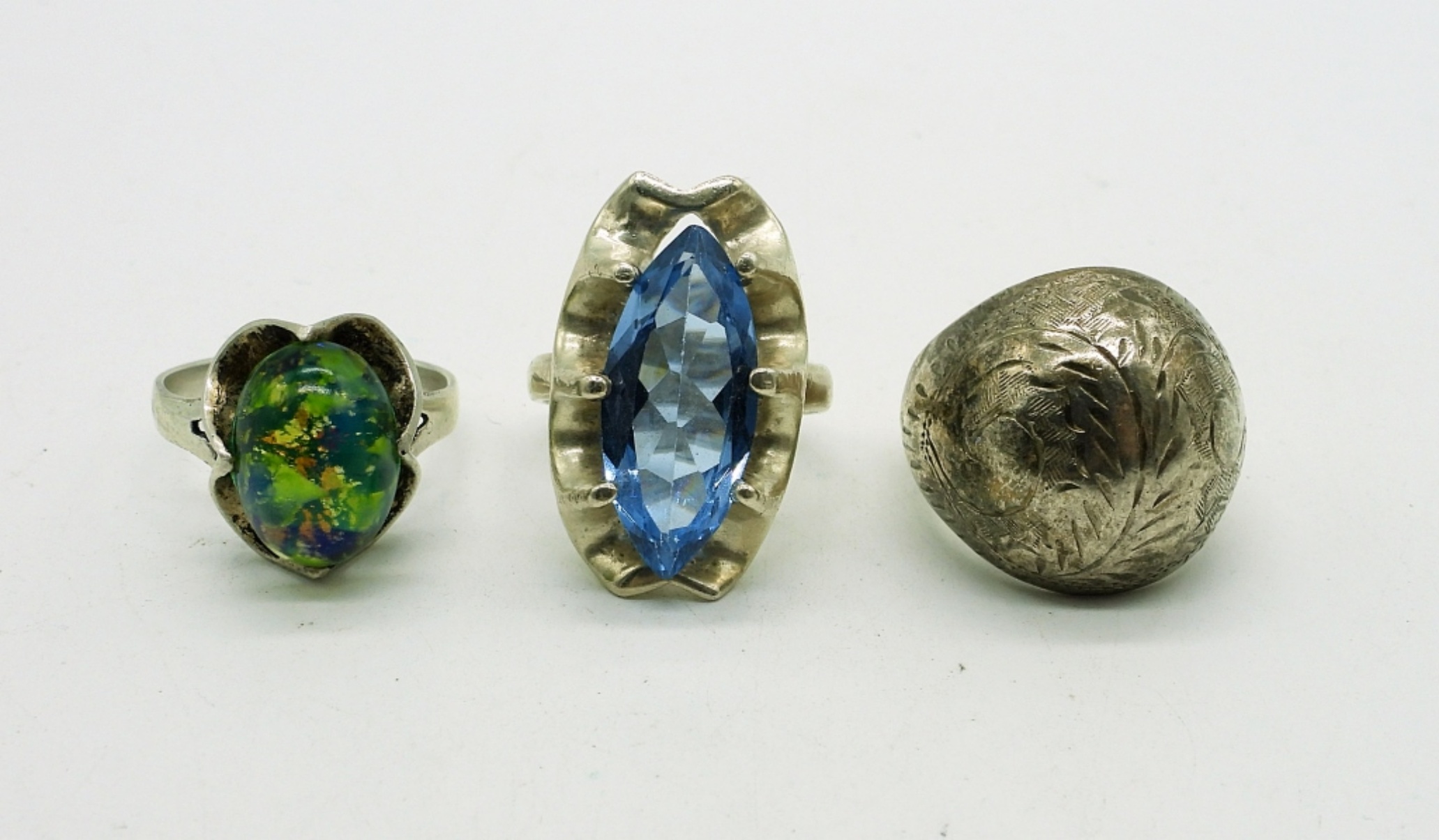 1-Mexico Sterling Silver Green Opal Art Glass Ring Size 8. 2-Vintage Thailand Sterling Silver Etched Dome Ring Size 7. 3-Mexico Sterling Silver Aquamarine Colored Gemstone Ring Size 5. 12DWT