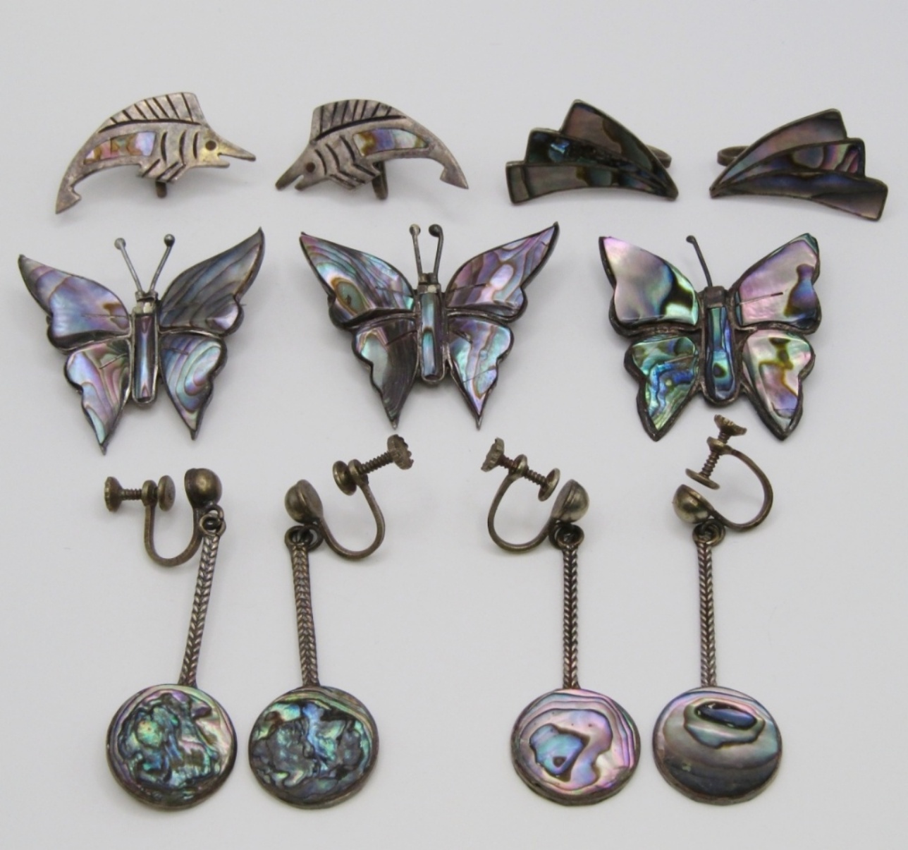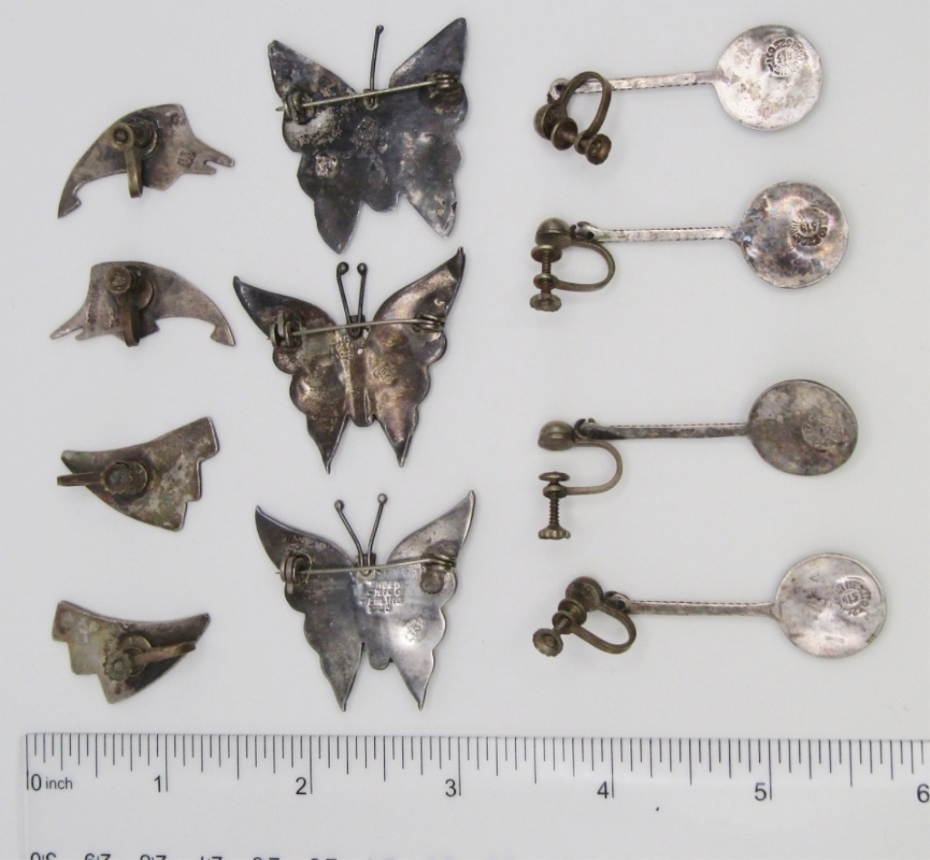24 DWT. (3) 1.25-1.5″ BUTTERFLY PINS & (4) PAIRS OF SCREWBACK EARRINGS. ALL STAMPED ON BACKS.
