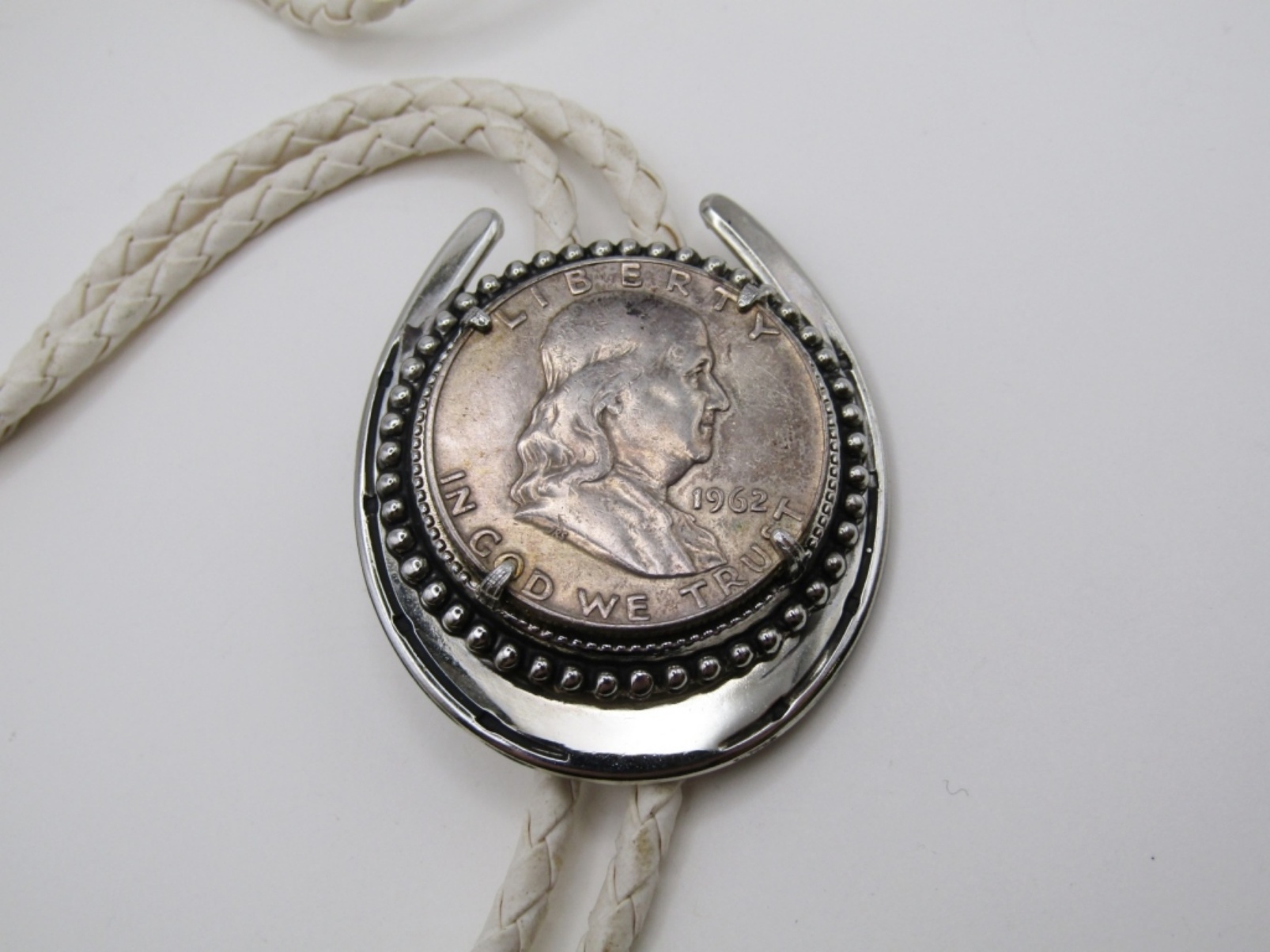 24 DWT. 1962-D FRANKLIN HALF DOLLAR SET IN SLIDE OF 36″ BEIGE WOVEN BOLO TIE