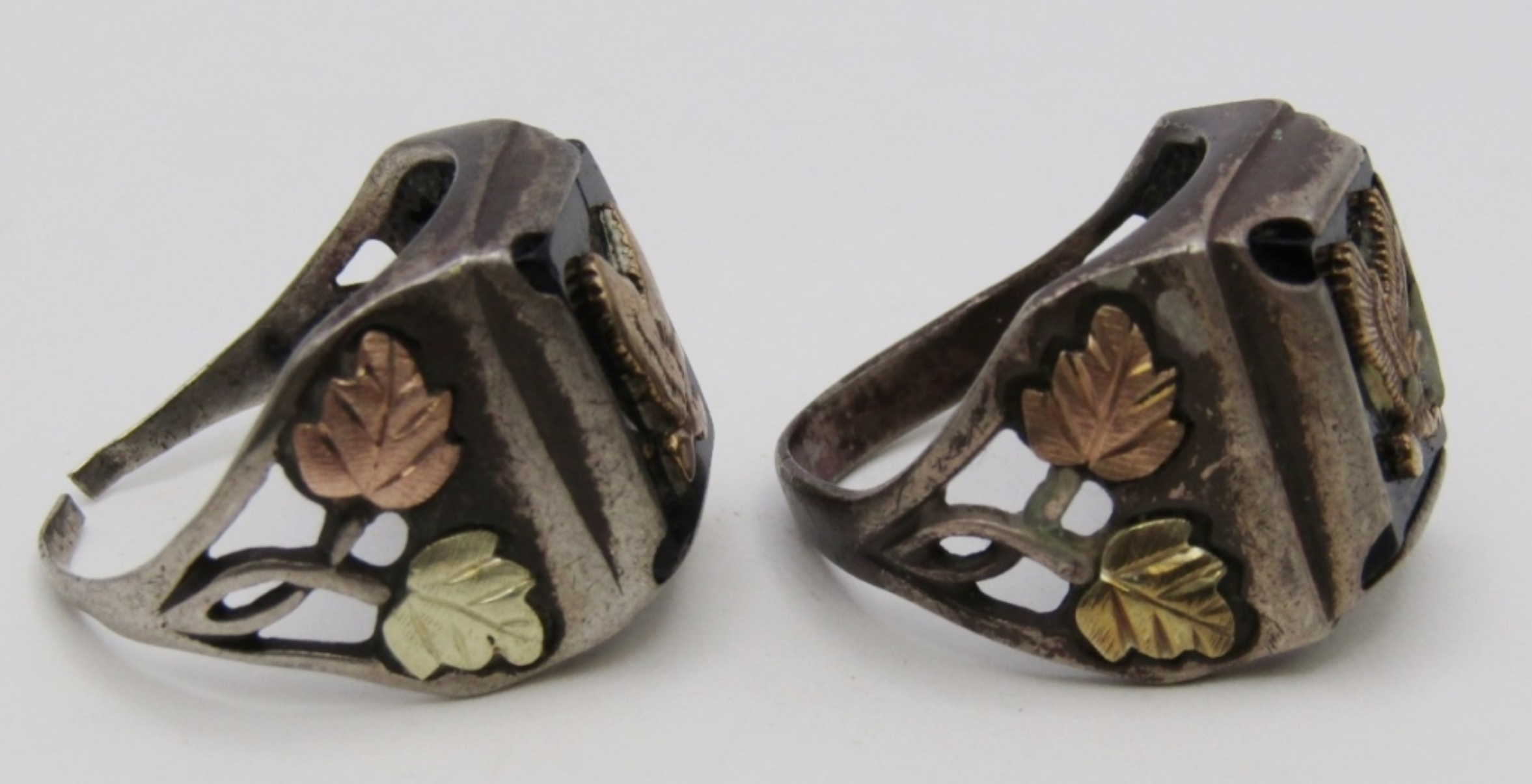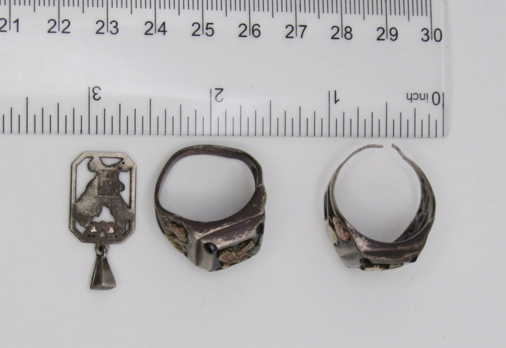 11 DWT. STERLING .75″ PENDANT & (2) RINGS SIZES: 9.5, 10 ALL STAMPED. ONE RING’S BAND IS CUT OPEN.