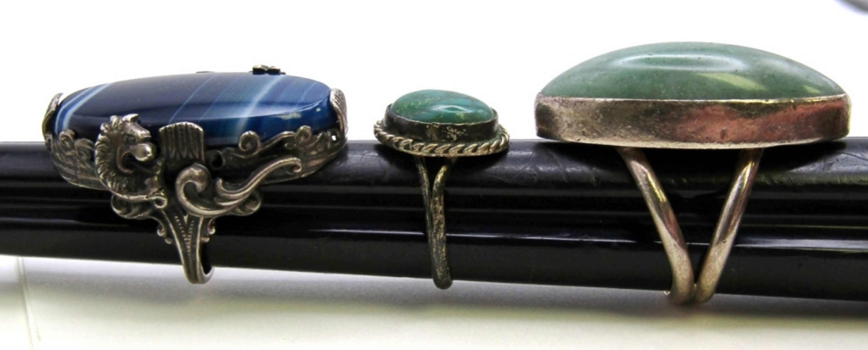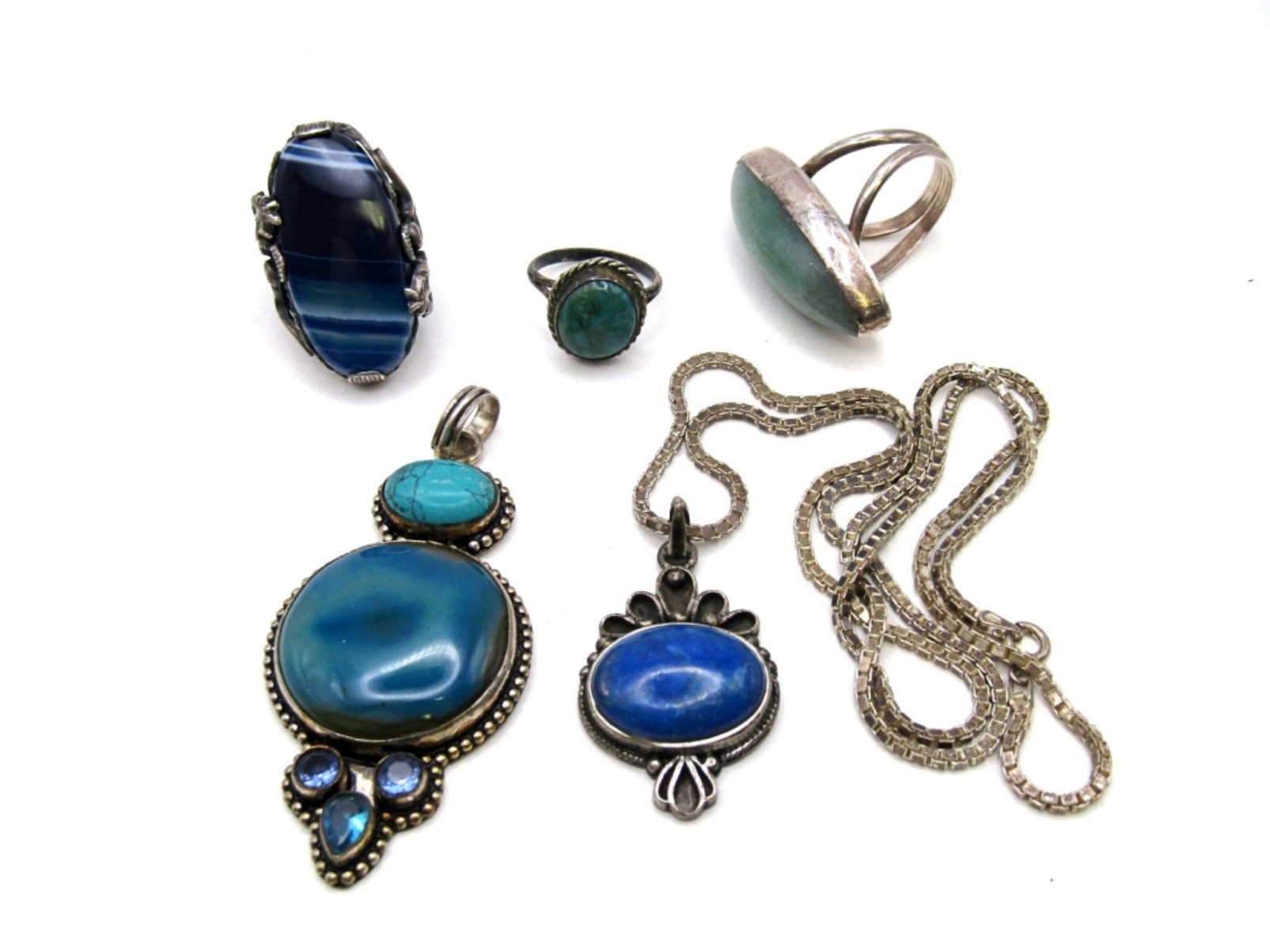 46 DWT. 23″ NECKLACE, PENDANT & (3) RINGS SIZES: 6.25, 5, 8.25 ALL BUT (2) RINGS STAMPED.