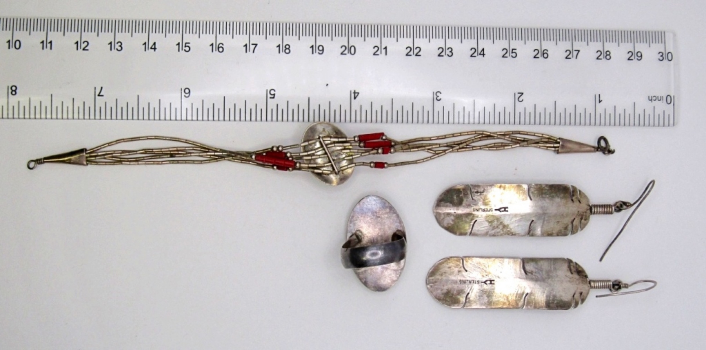 15 DWT. 7″ BRACELET STAMPED STERLING, SIZE 6.75 RING, & 2.5″ DANGLE PIERCED EARRINGS SIGNED “HY STERLING”.