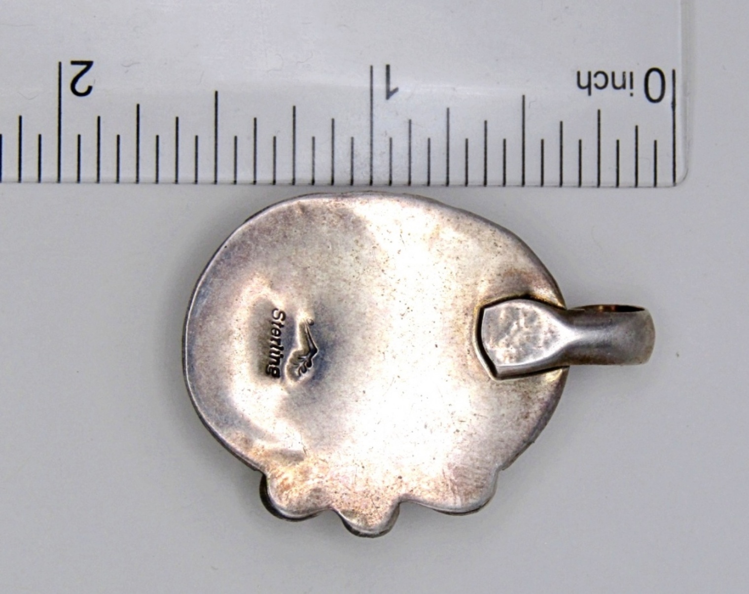 6 DWT. 1.5″ PENDANT WITH LARGE STONE. STAMPED STERLING ON BACK WITH PICTO MARK SYMBOL SIGNATURE.