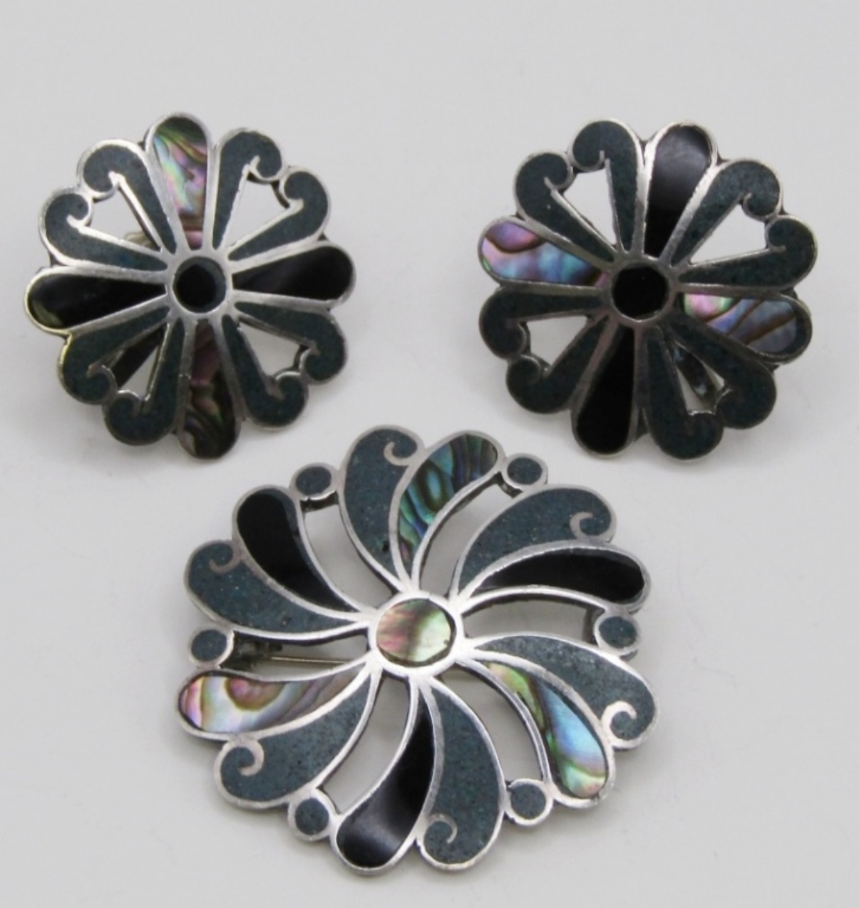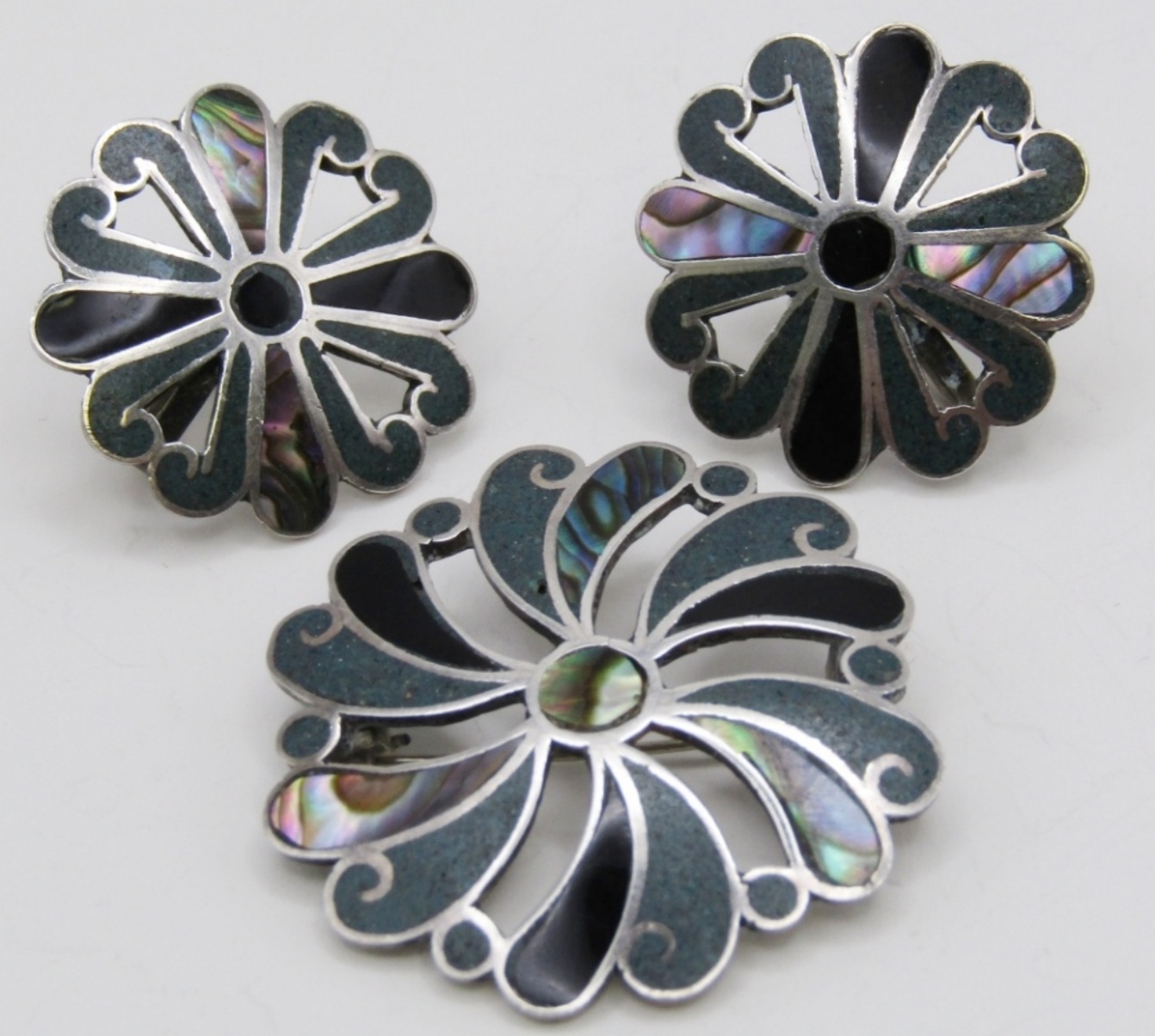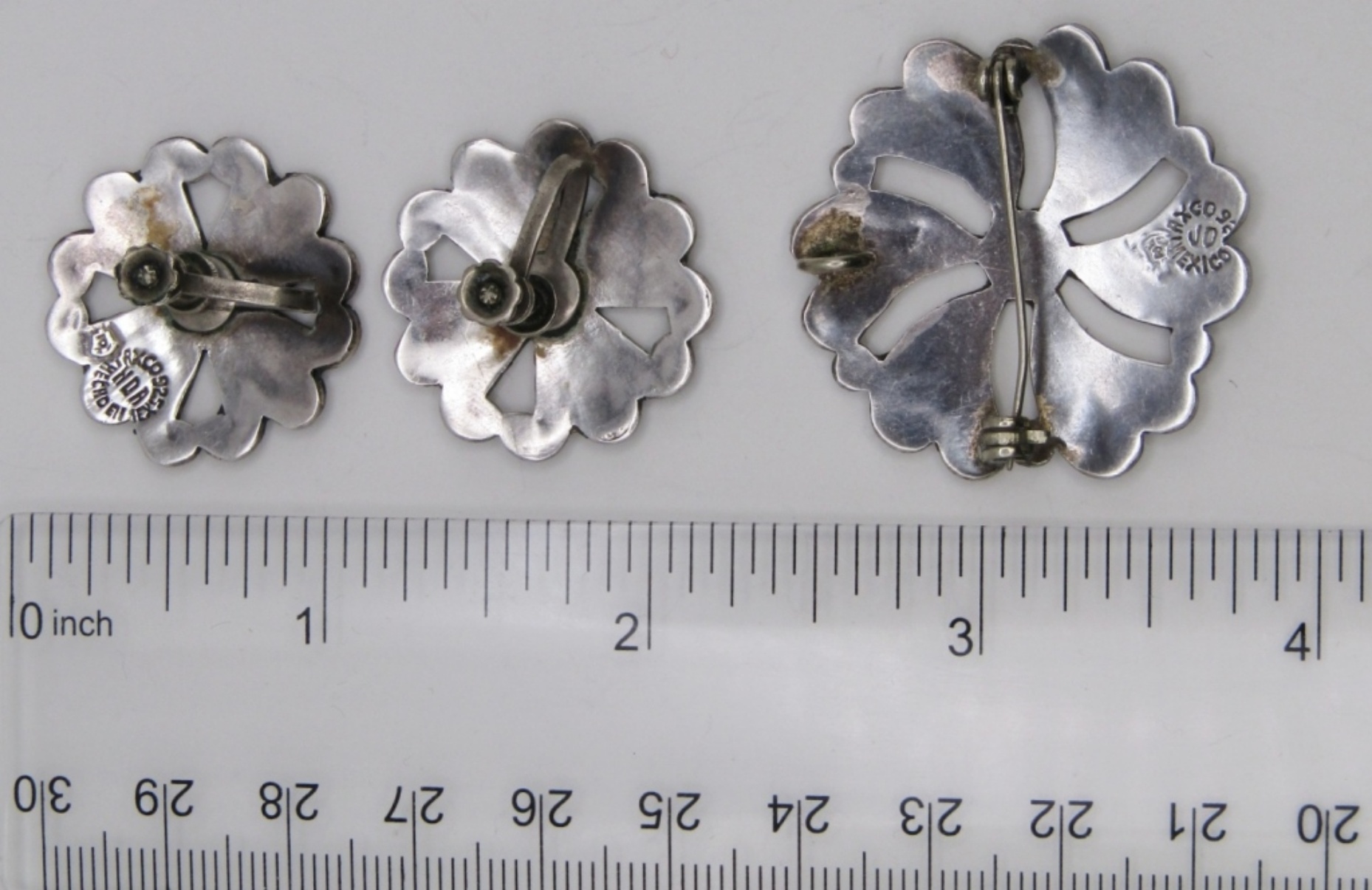 7 DWT. 1.5″ BROOCH PIN WITH PENDANT LOOP & 1″ SCREWBACK EARRINGS. BOTH STAMPED 925
