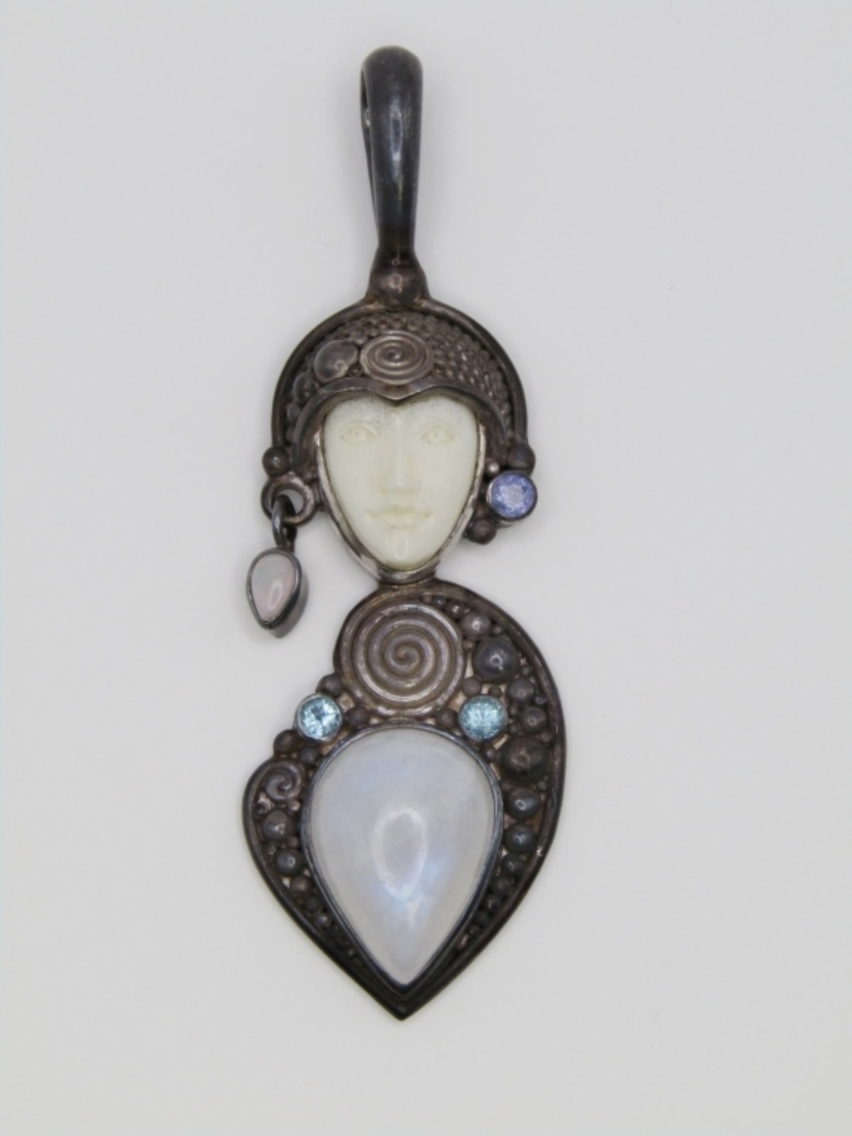 12 DWT. 2.75″ PENDANT WITH MOONSTONE, & GEMS. STAMPED “SAJEN 925”