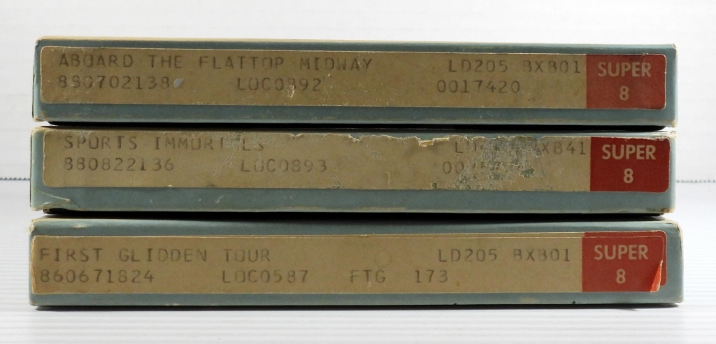 8mm REEL MOVIES IN ORIGINAL BOXES – “ABOARD THE FLATTOP MIDWAY”, “FIRST GLIDDEN TOUR”, “SPORTS IMMOR.”