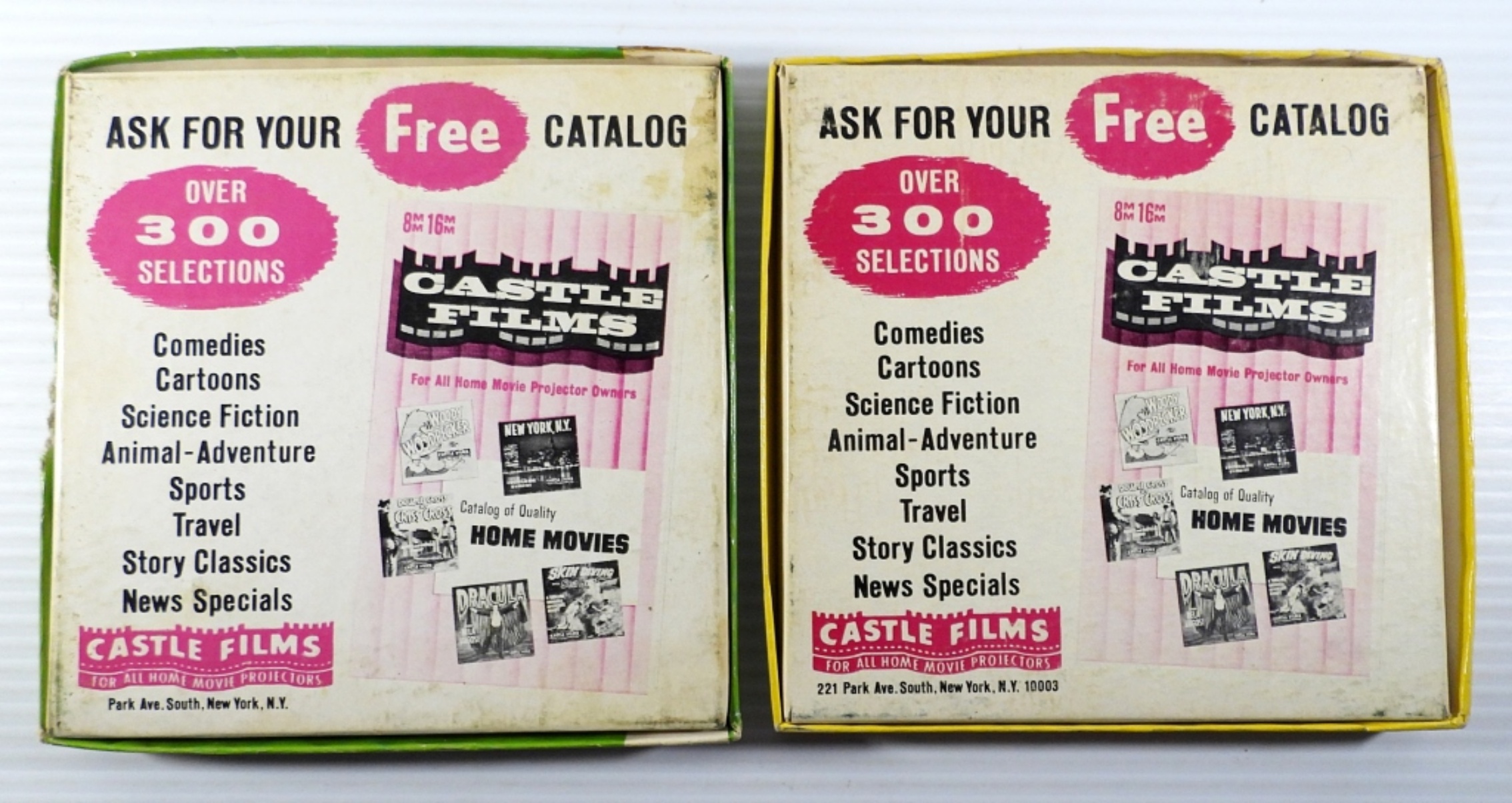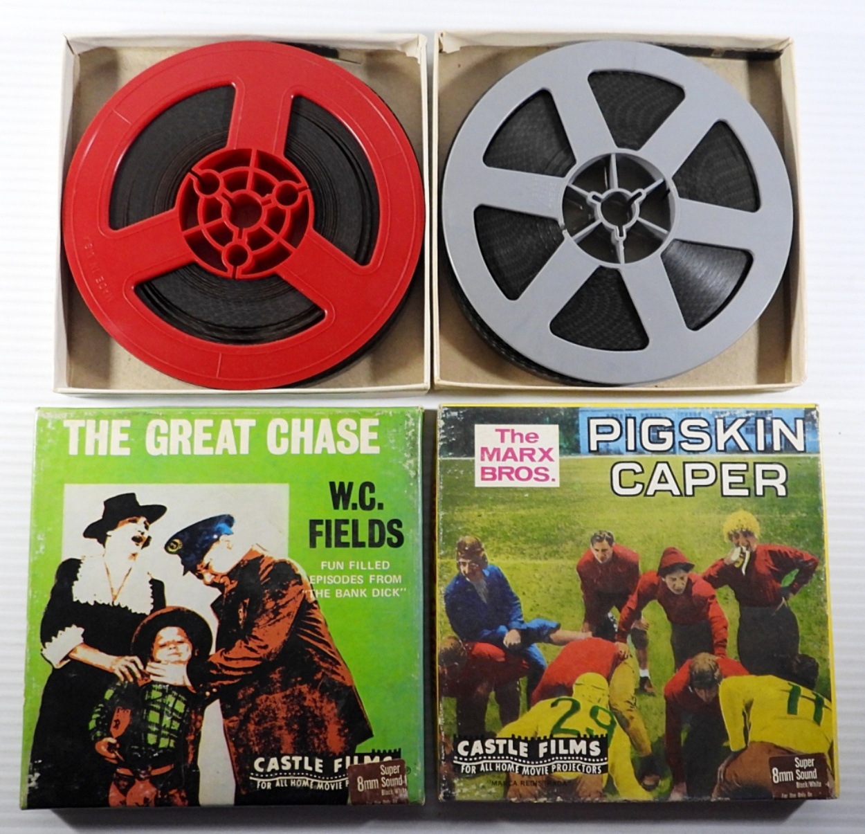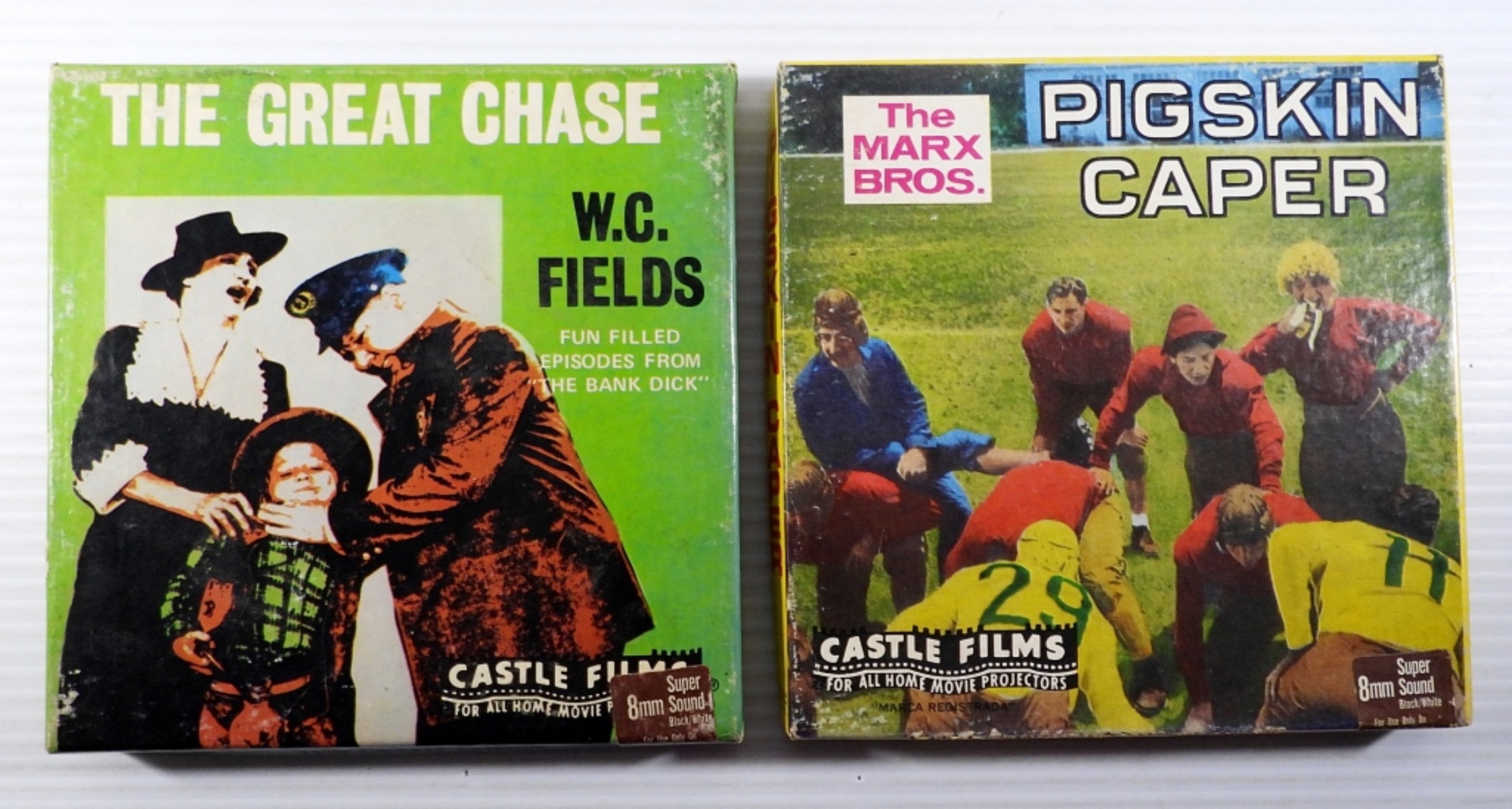 STOCK FILMS IN ORIGINAL BOXES, BLACK & WHITE – “THE GREAT CHASE” & “PIGSKIN CAPER” – SUPER SOUND / COMPLETE EDITION