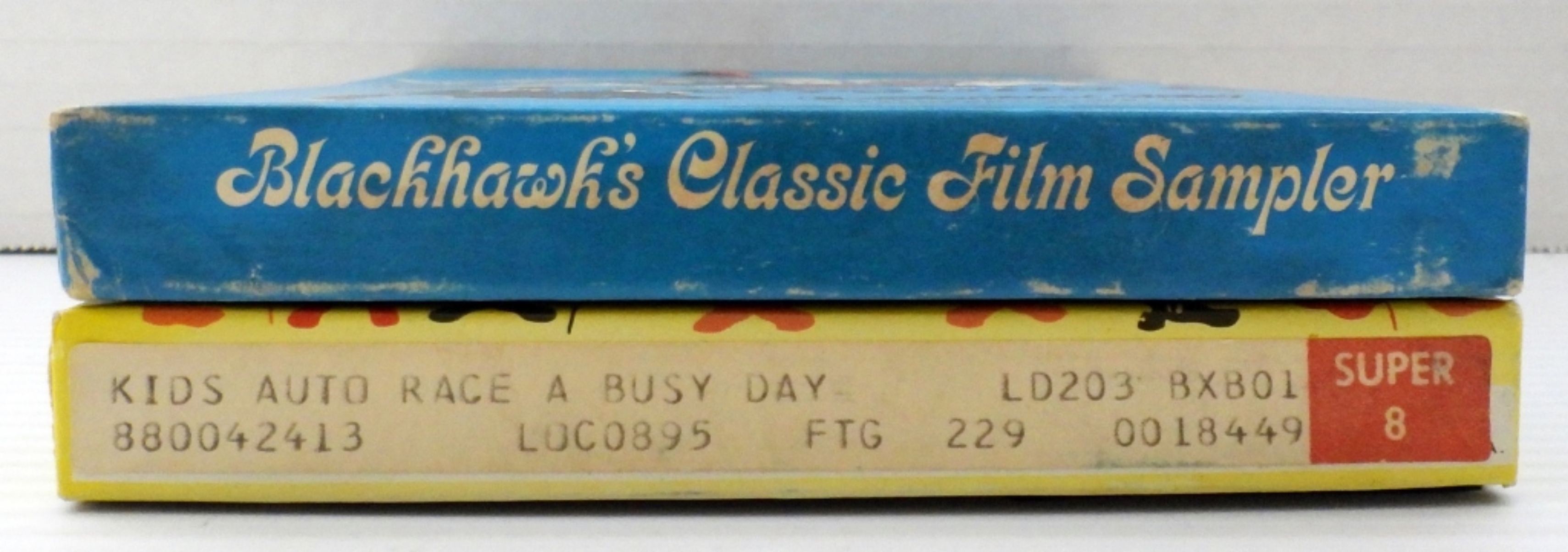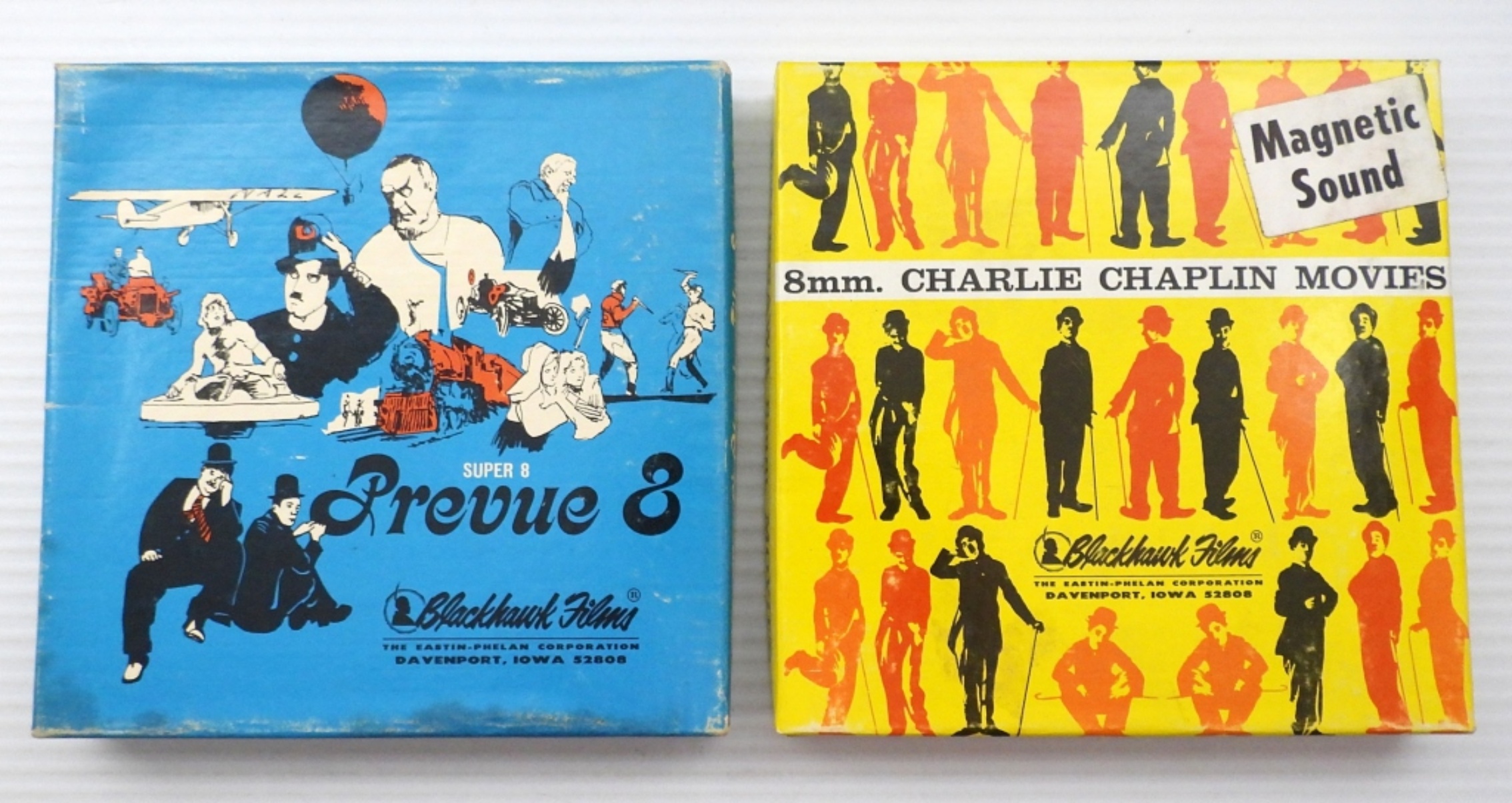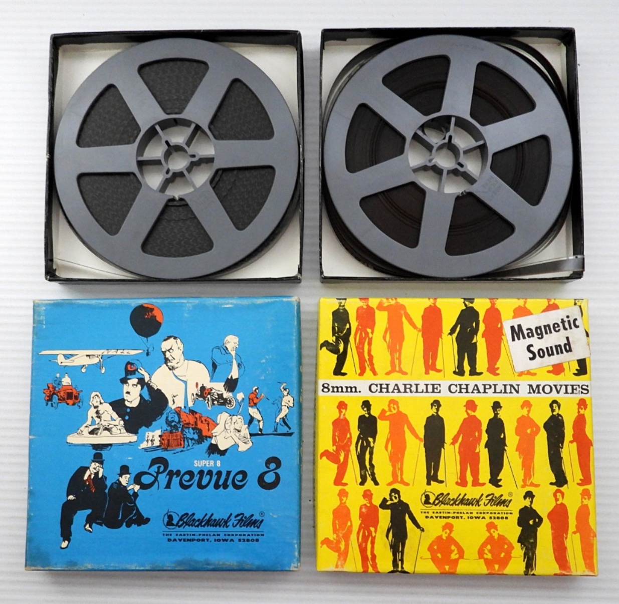 STOCK FILMS IN ORIGINAL BOXES, BLACK & WHITE – 8mm CHARLIE CHAPLIN MOVIES, MAGNETIC SOUND – SUPER 8 PREVUE BLACKHAWK’S CLASSIC FILM SAMPLER