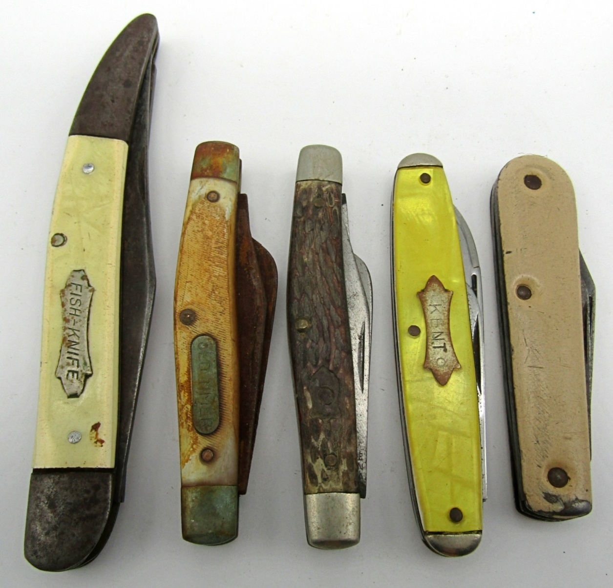 2-Blade Fish Knife, 3-Blade Old Timer Schrade USA, 2-Blade USA, 2-Blade Kent NY City, 3-Blade Schrade Walden NY USA; Used Conditions.