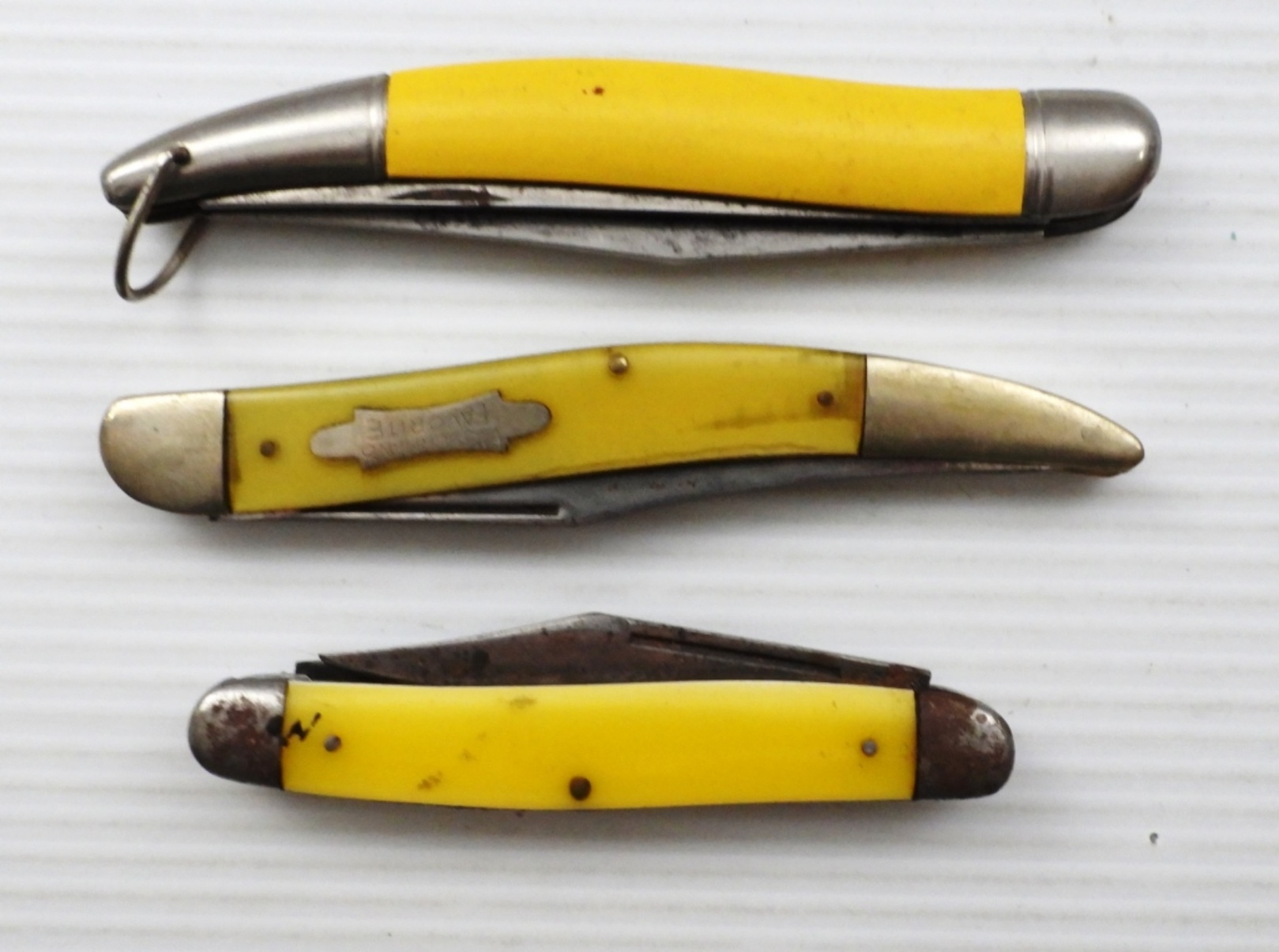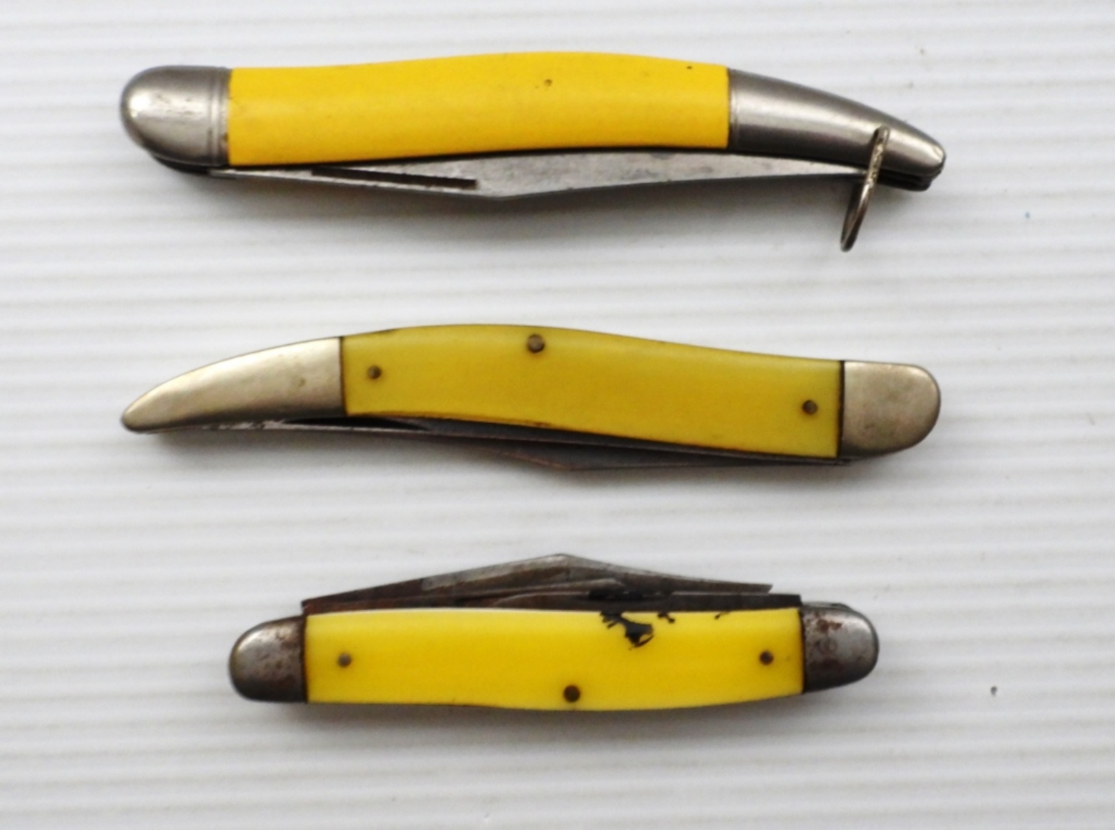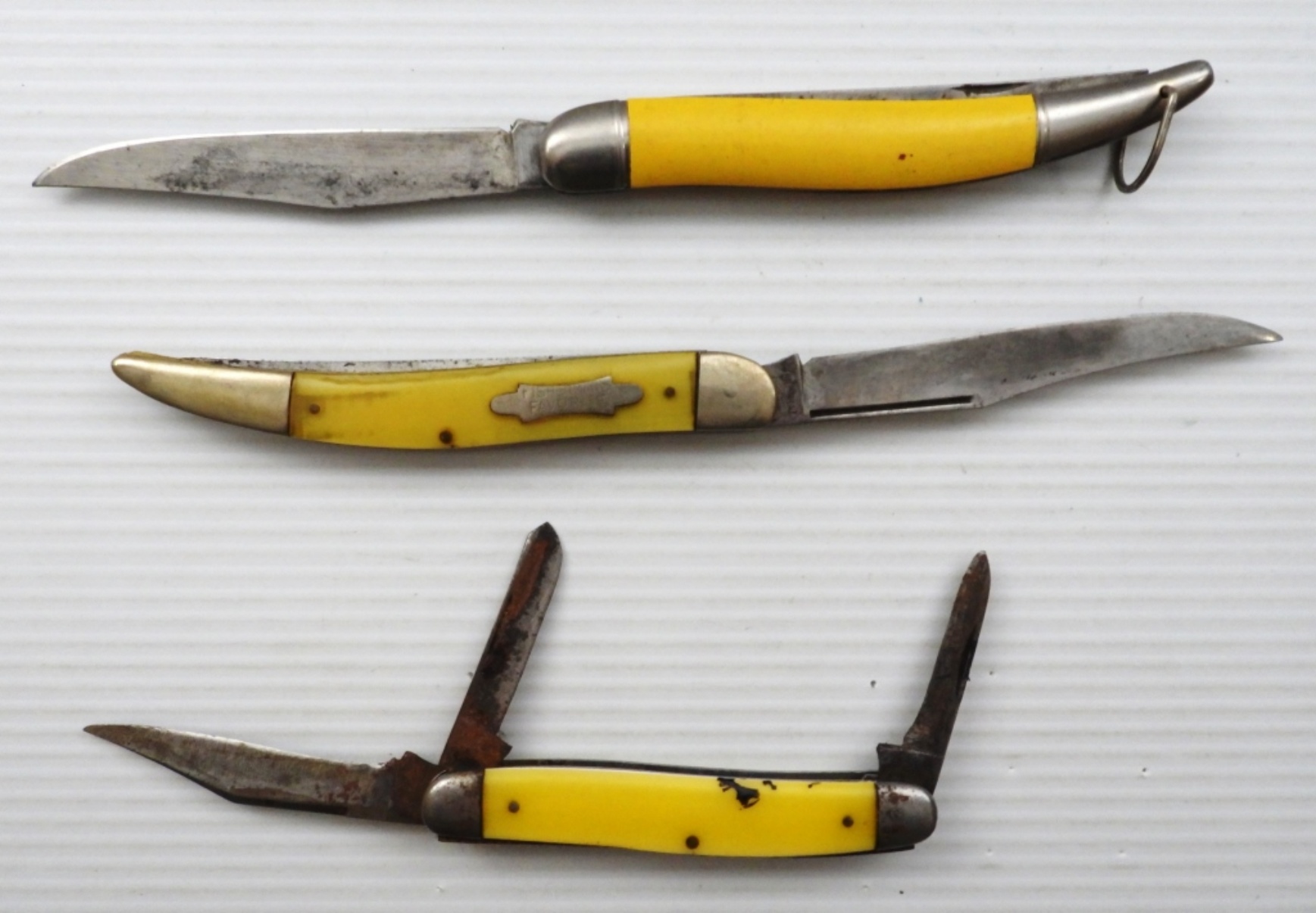 YELLOW HANDLE THREE BLADE KNIFE for repair – FISHING KNIVES USED but NICE