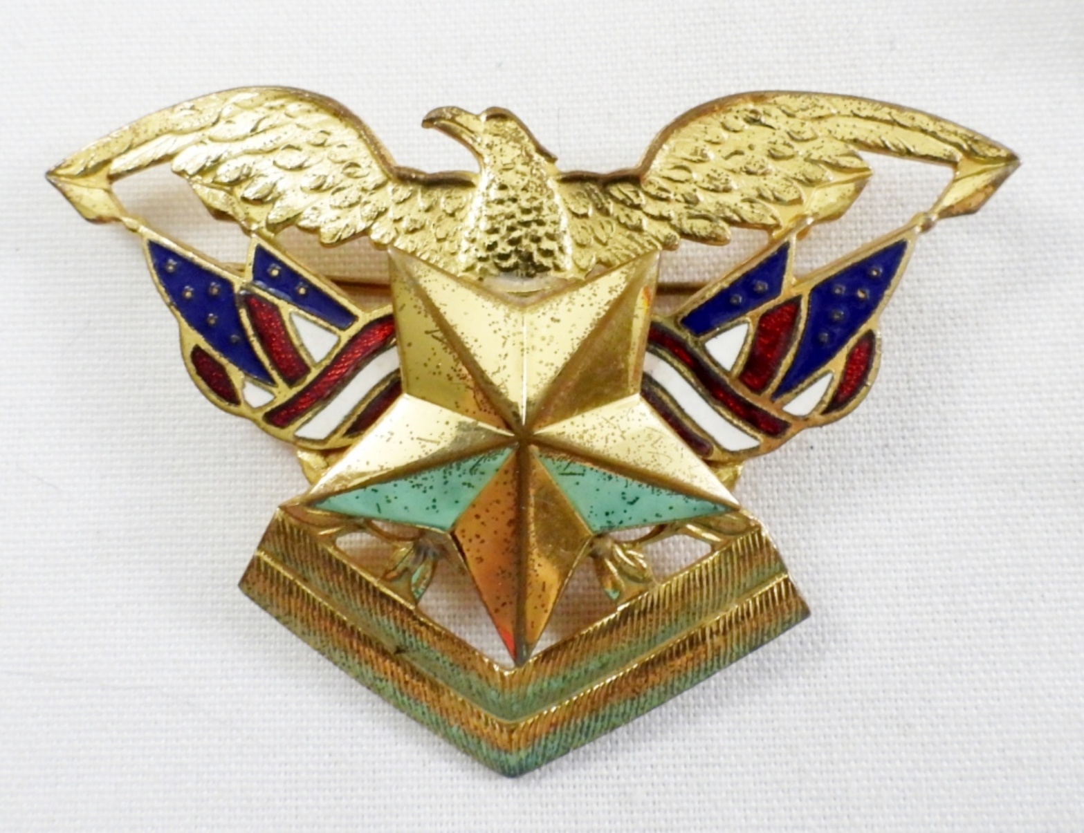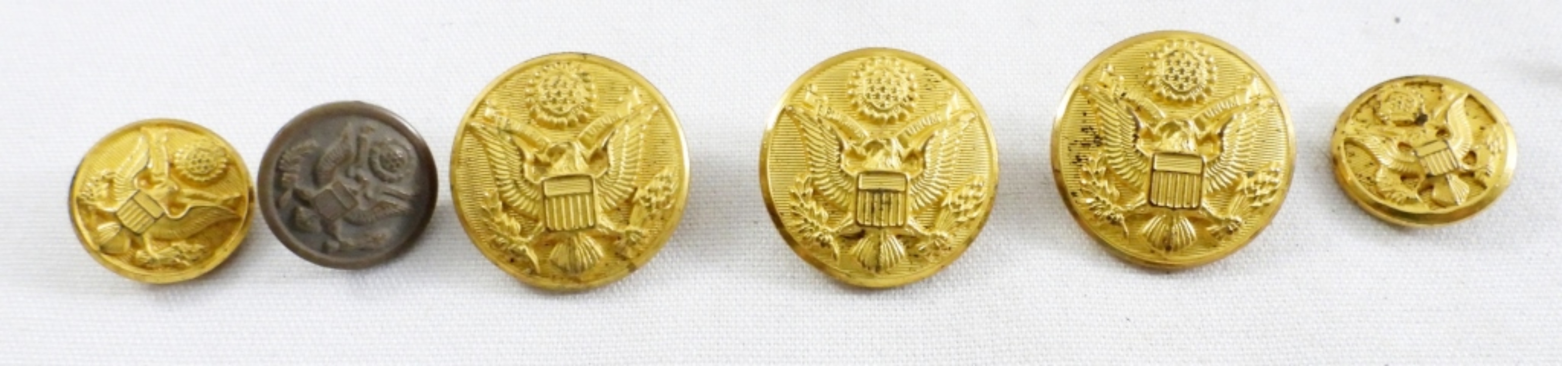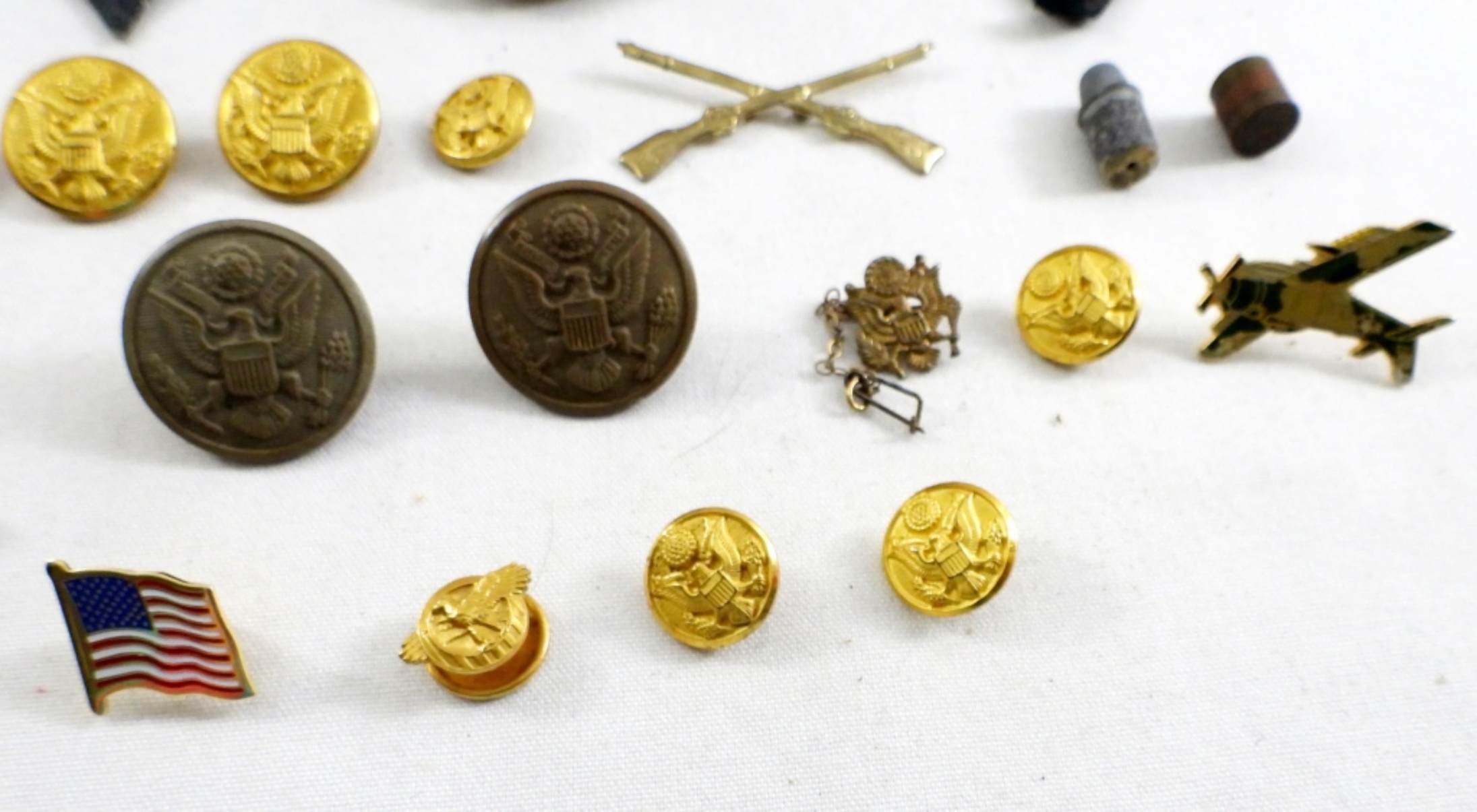 (12) BUTTONS, (3) PATCHES, LARGE EAGLE PIN, EAGLE COLLAR BUTTON & MORE