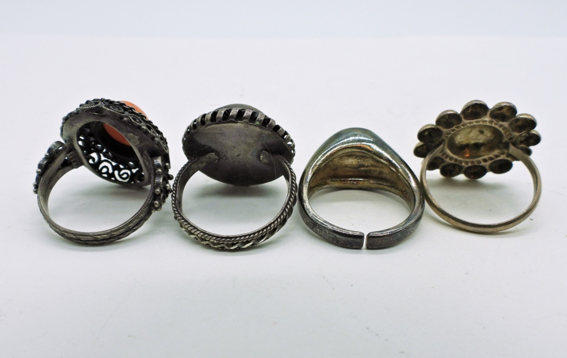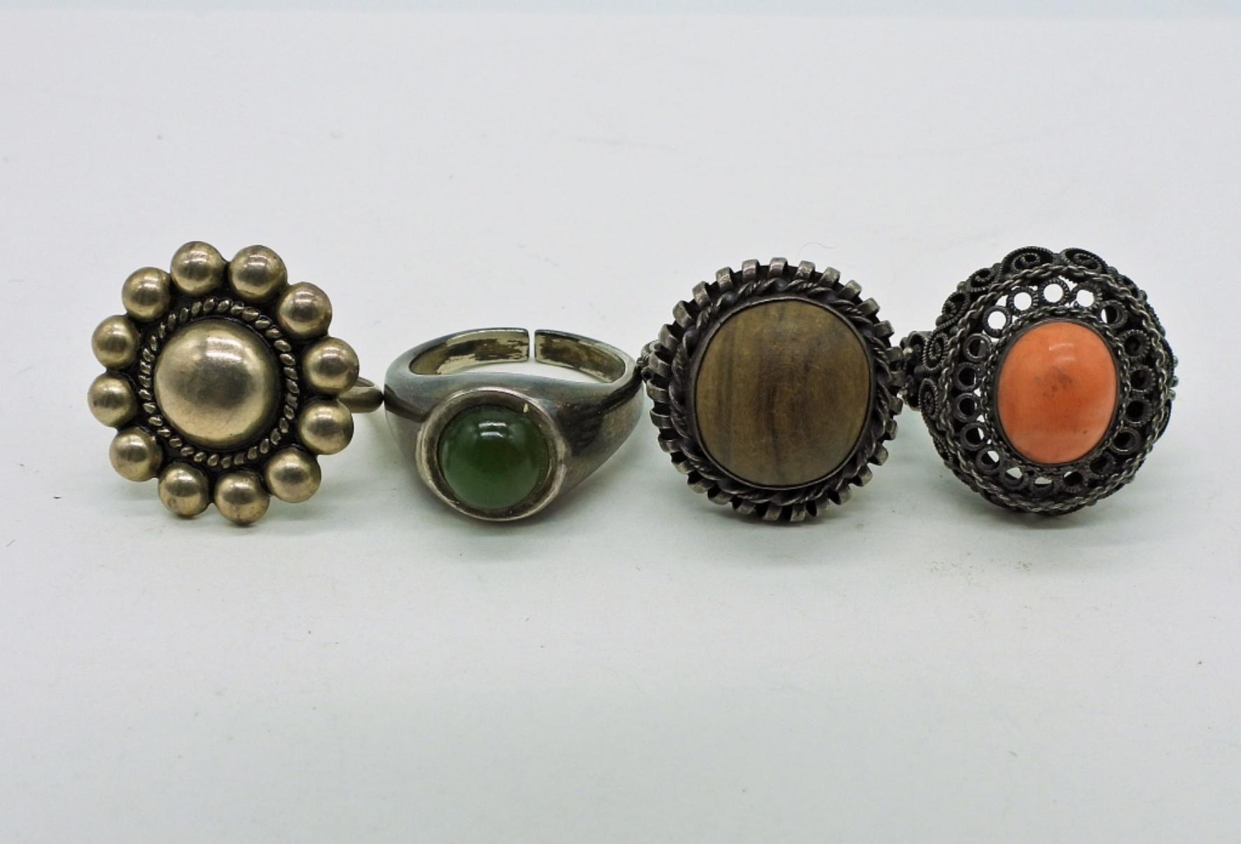 Four Sterling Silver Vintage Rings with Gemstones and Wood. Sizes 5 and 6. 12.7 DWT