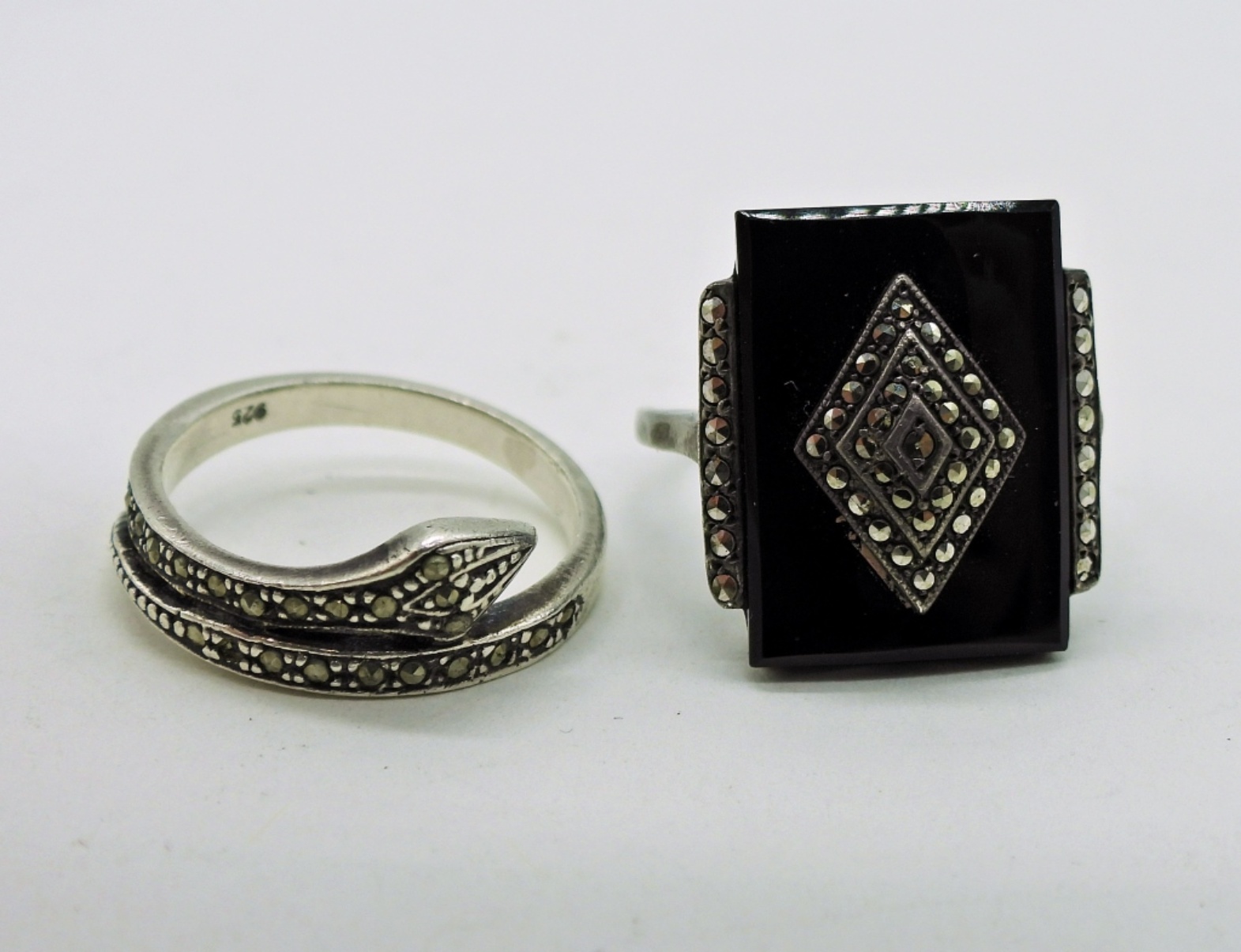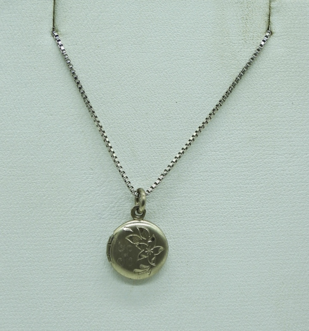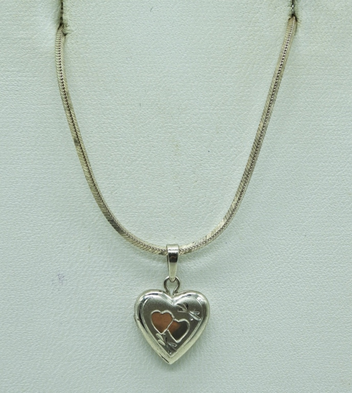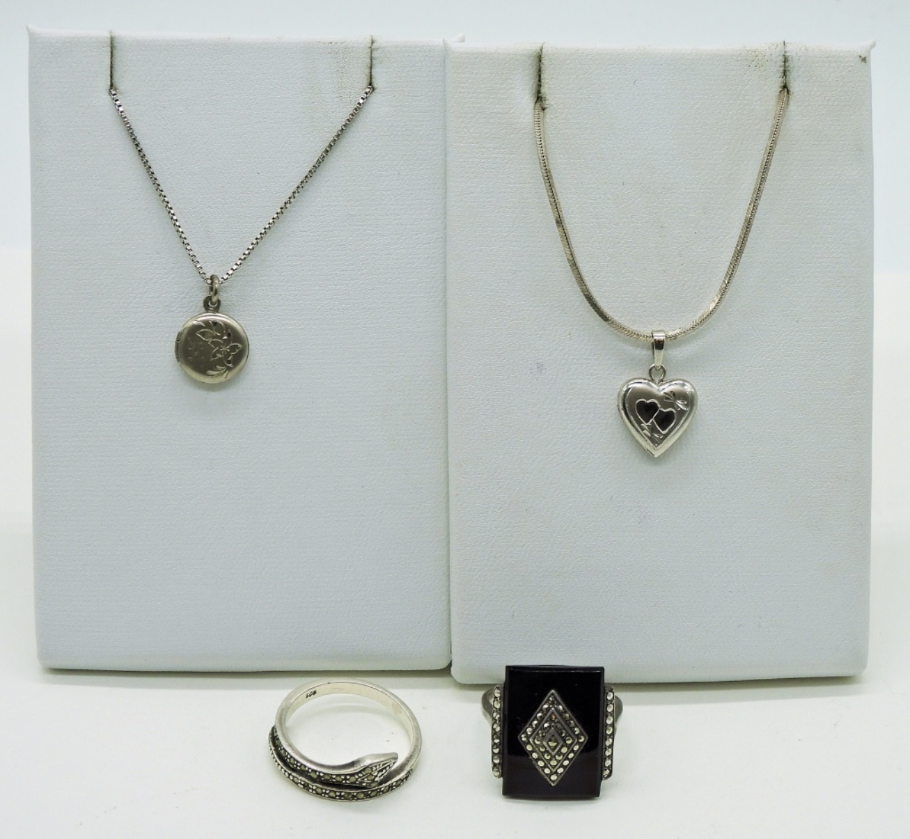 Two Tiny Sterling Lockets on 18″ & 20″ chains. Two Sterling Rings Size 7. 10.4 DWT