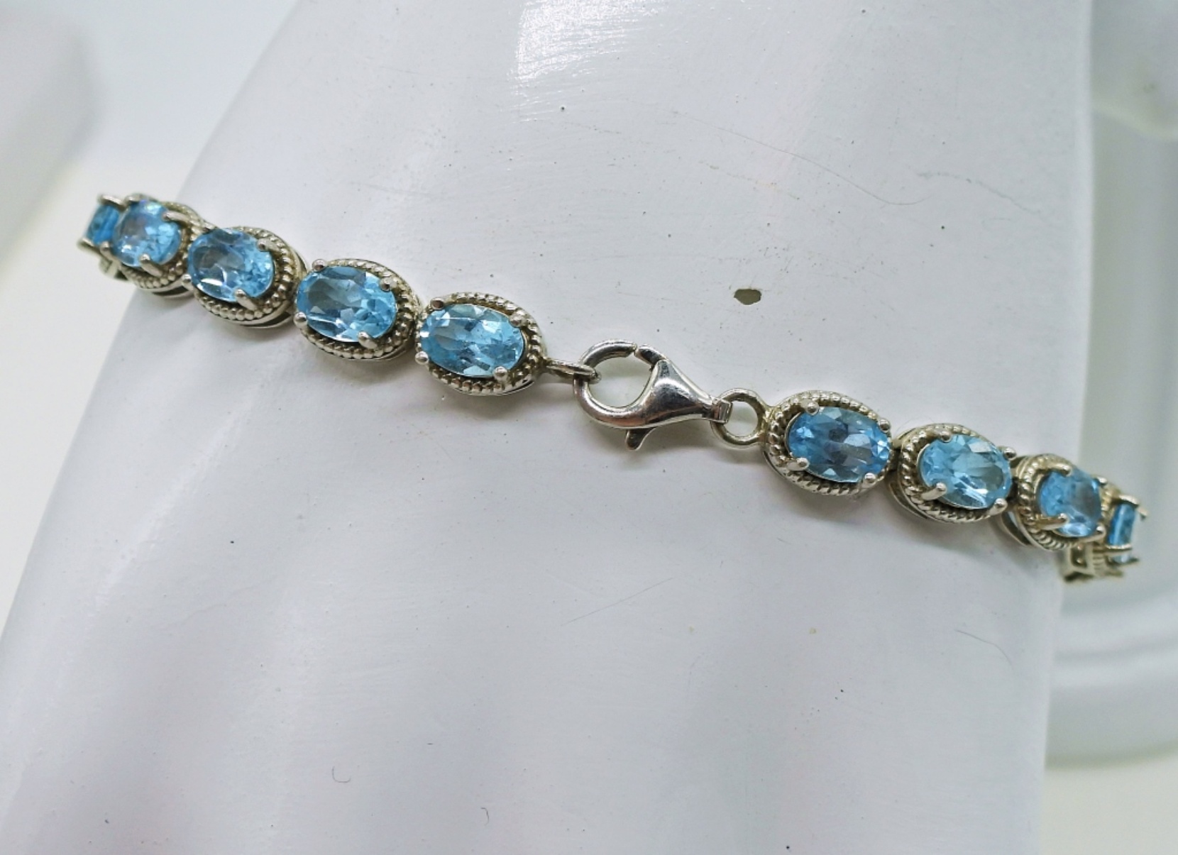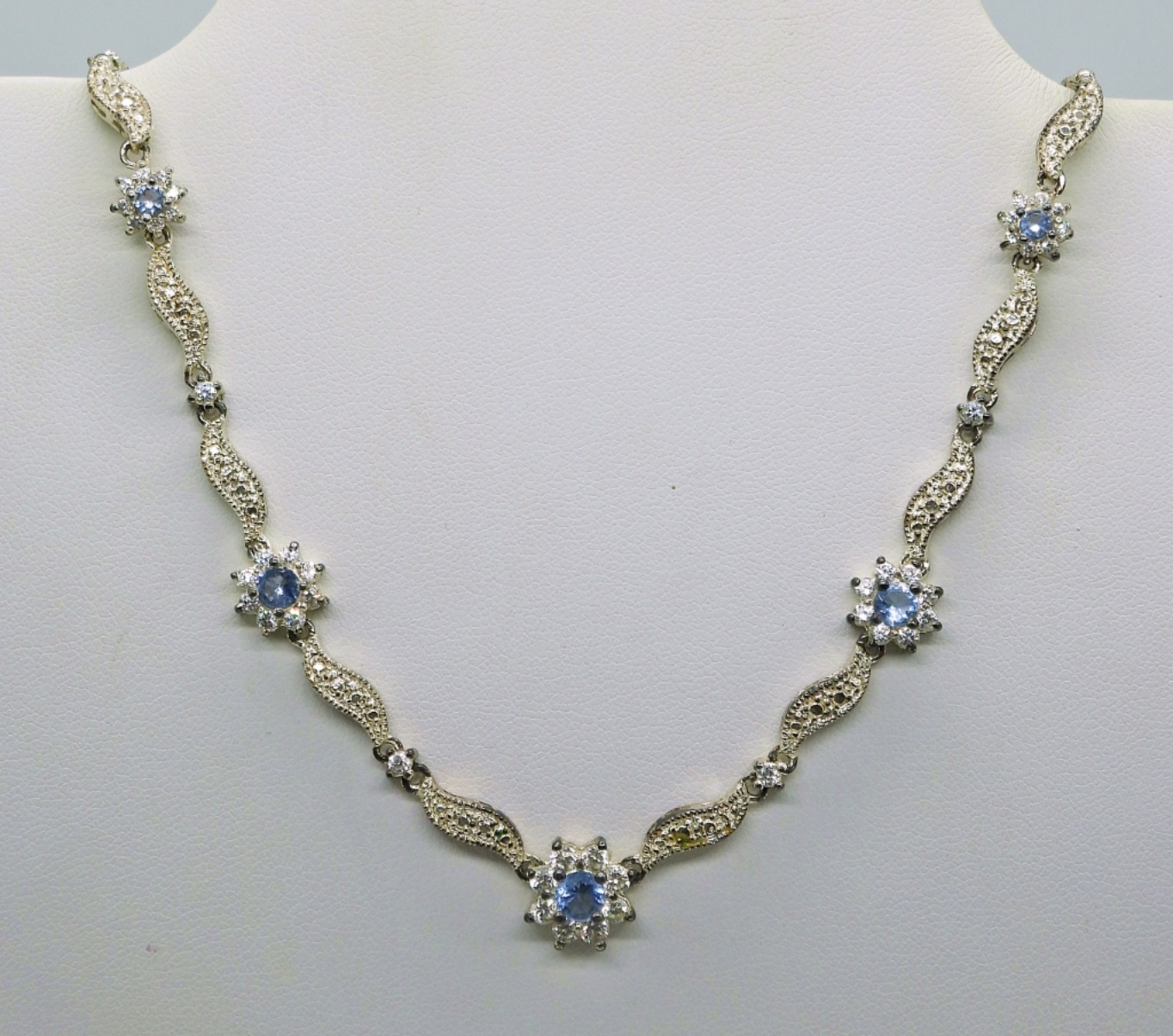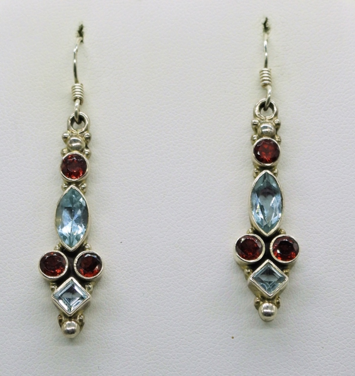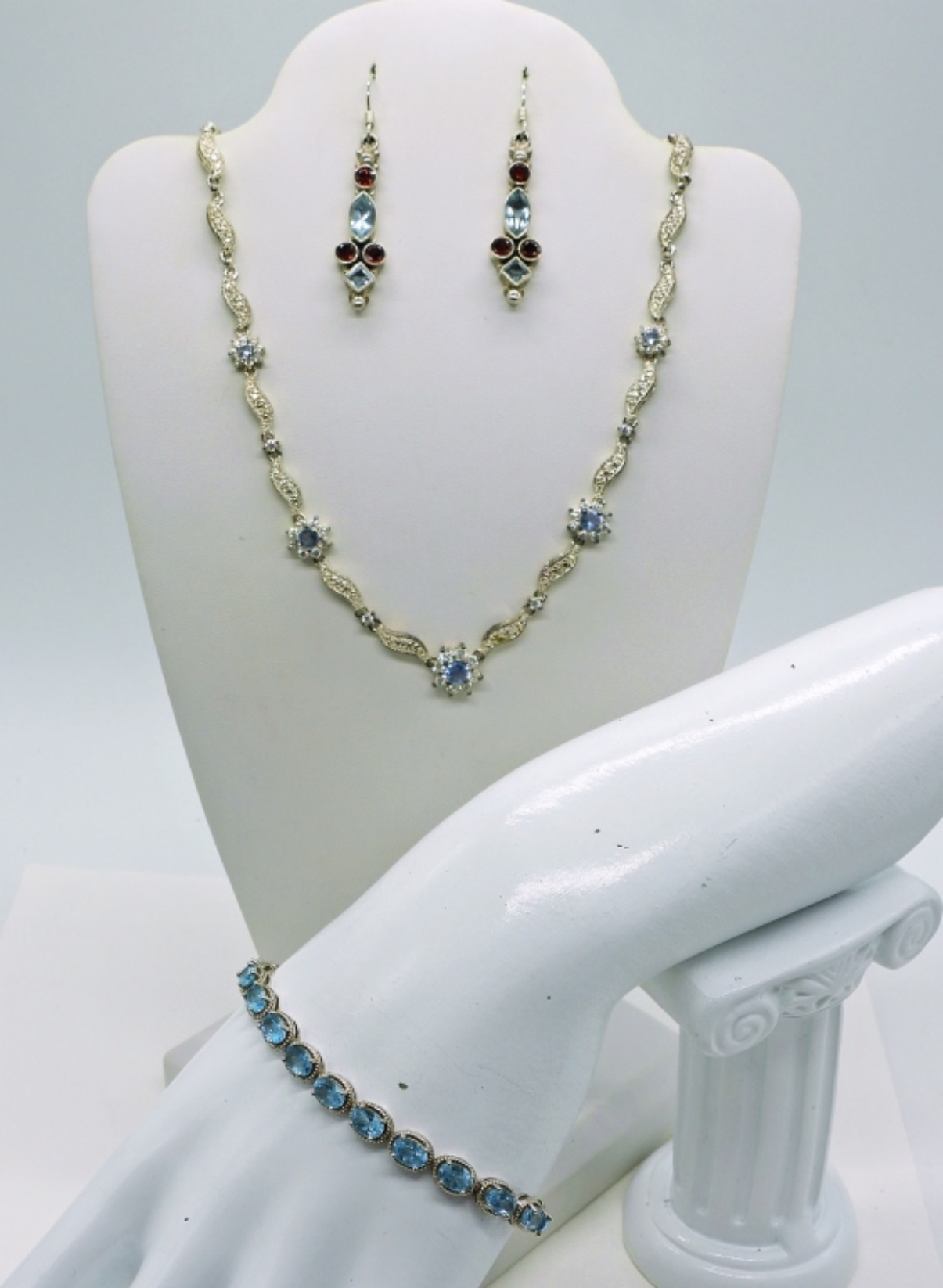 Sterling 17″ Necklace with Aquamarine colored gemstones. Sterling 7″ Aquamarine Colored Gemstones Bracelet. Gemstone Earrings, 2″ long. 25.3 DWT
