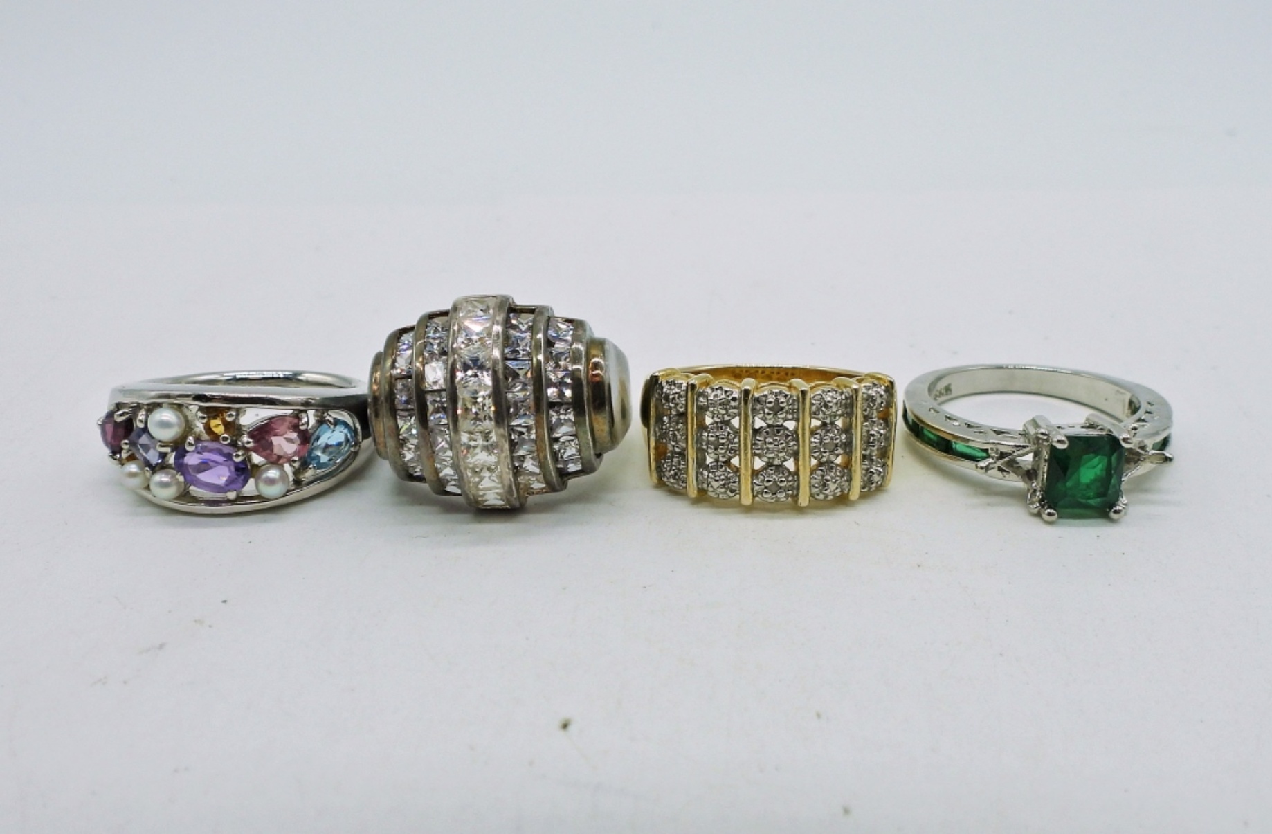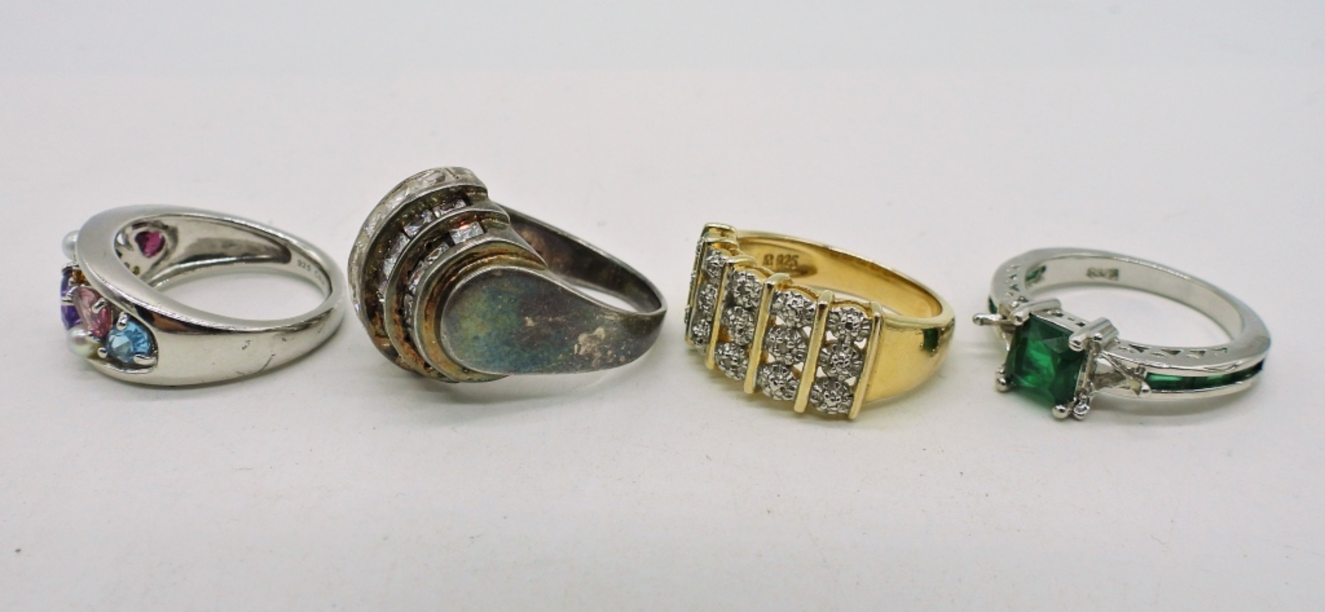 Four Sterling & Gemstone Rings. Multi Gemstone Ring is Size 7 & Marked “925 CNA Thailand”. Emerald Colored Gemstone Ring Size 8, Marked 925. Diamond Like Ring, Size 8, Marked 925 (This is Tarnished and needs to