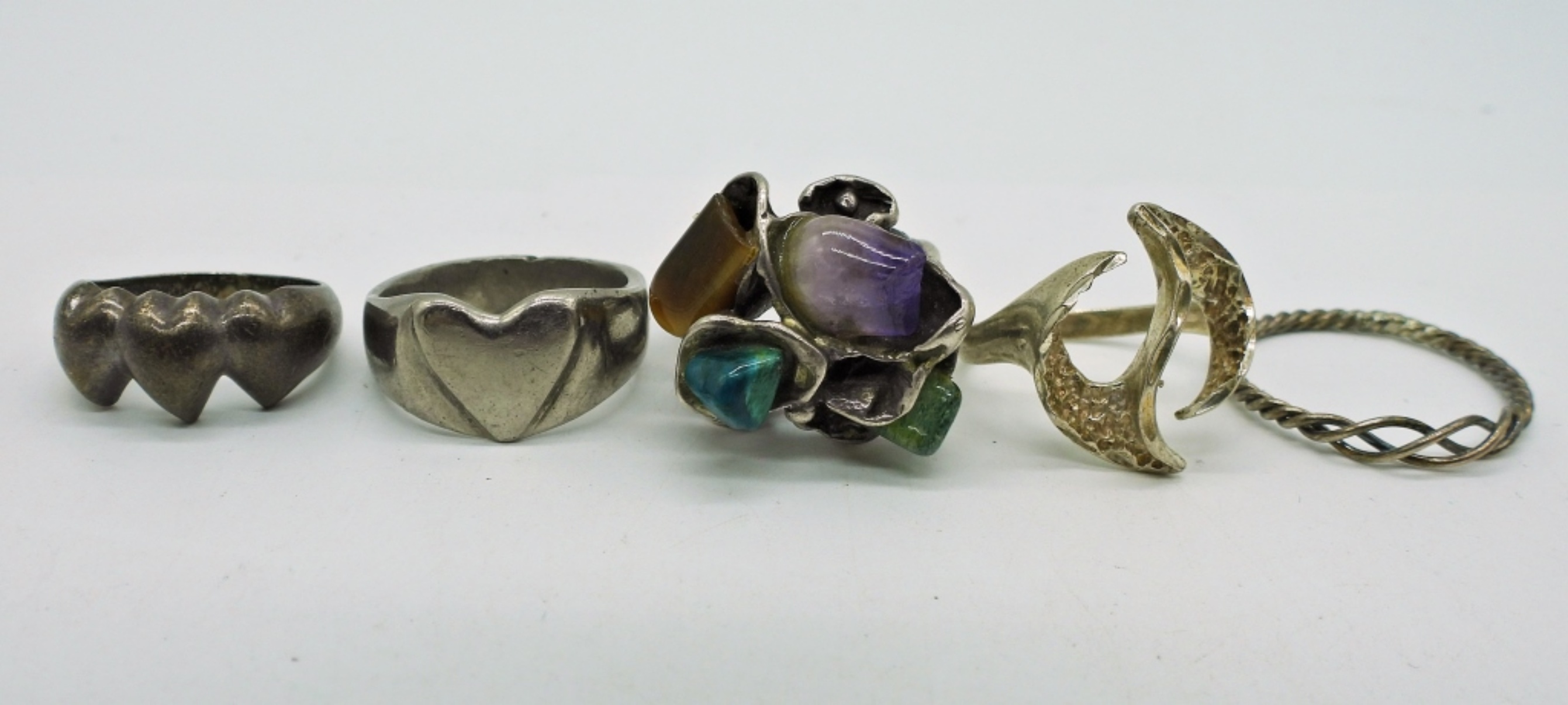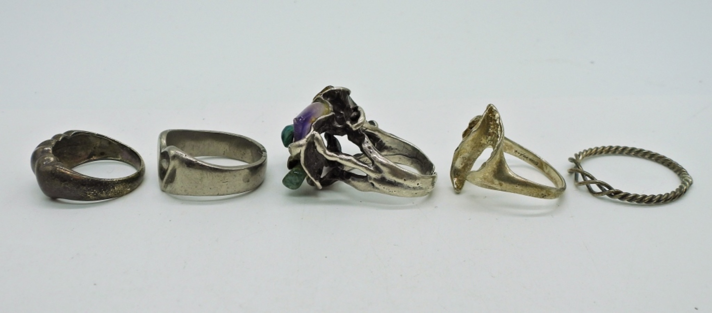 Five Sterling Rings, One with natural gemstones. Sizes 6, 7, 10. 16 DWT