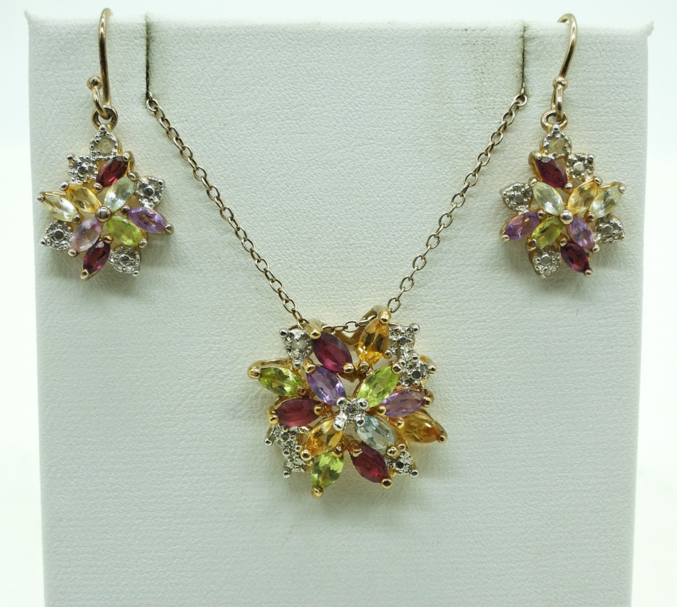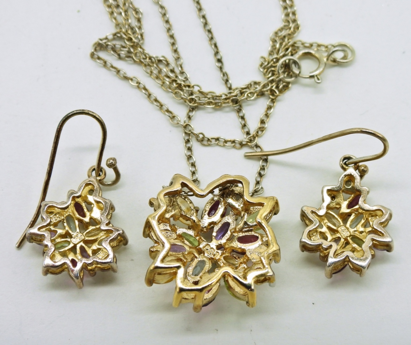 Gold Tone Necklace with Several Gemstones and matching Earrings. Marked 925. Chain is 18″. 4 DWT