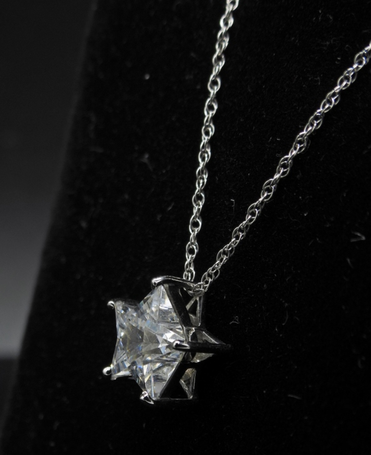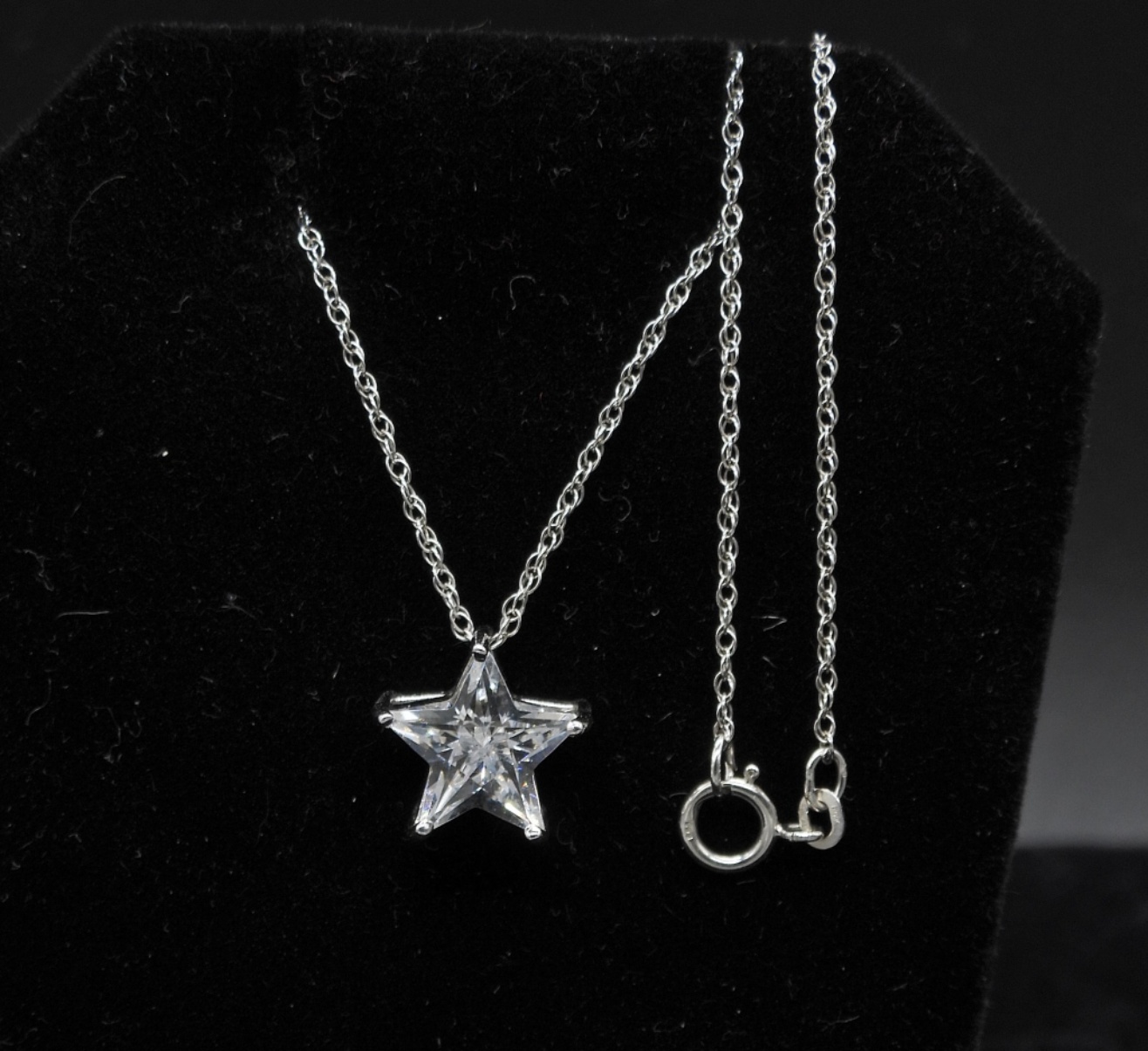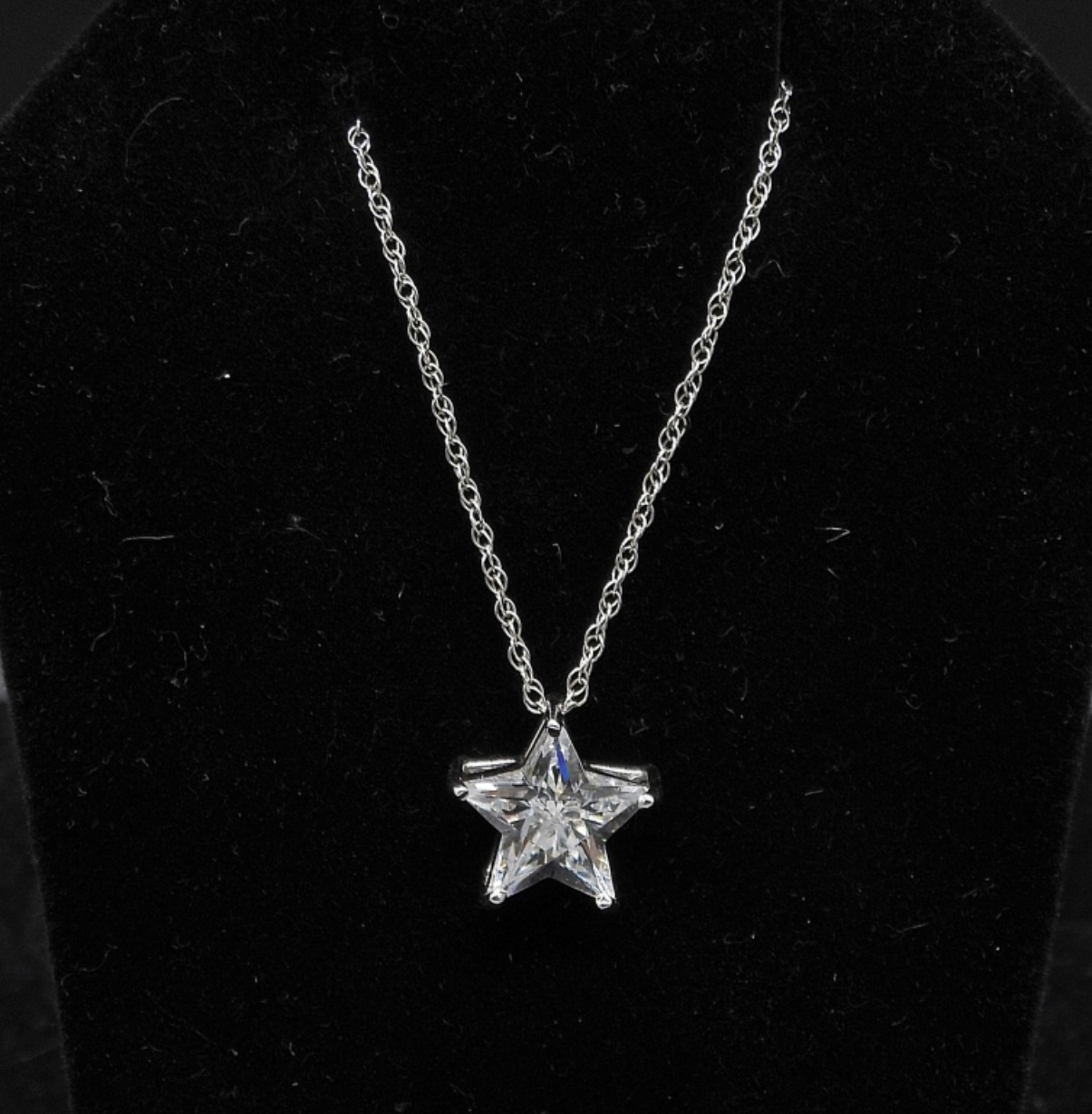 14K White Gold Star Shaped Cubic Zirconia Necklace. Gold Weight is .8 DWT. Chain Length 18″.