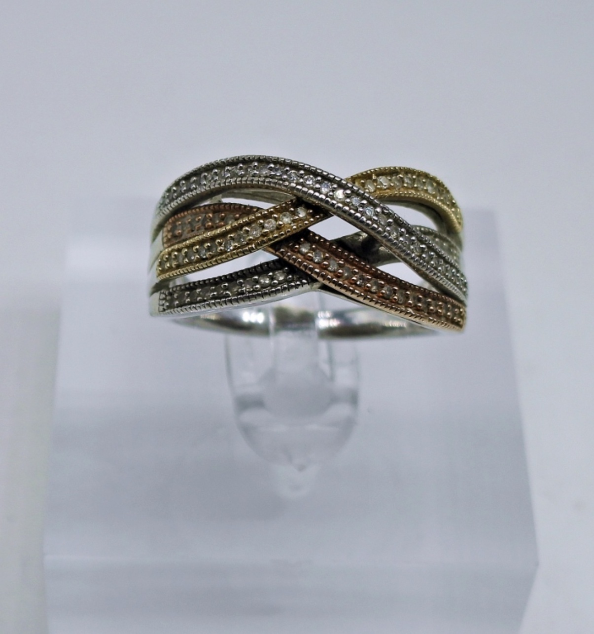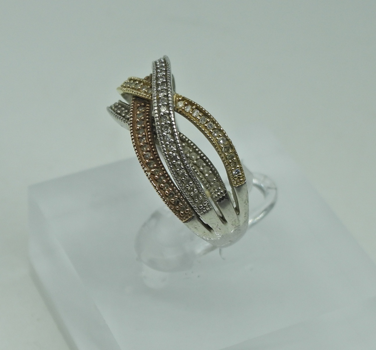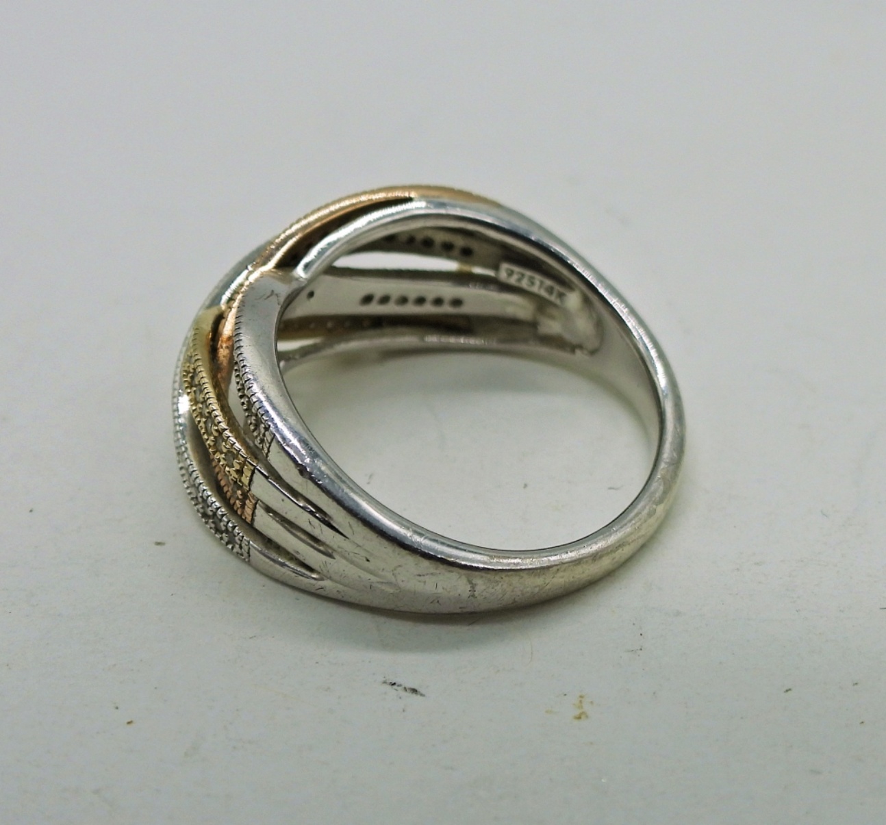 Beautiful Sterling Silver and 14K Gold Criss Cross Ring with Moissanite Gemstones. Size 8, Marked 925/14KG. 3.1 DWT