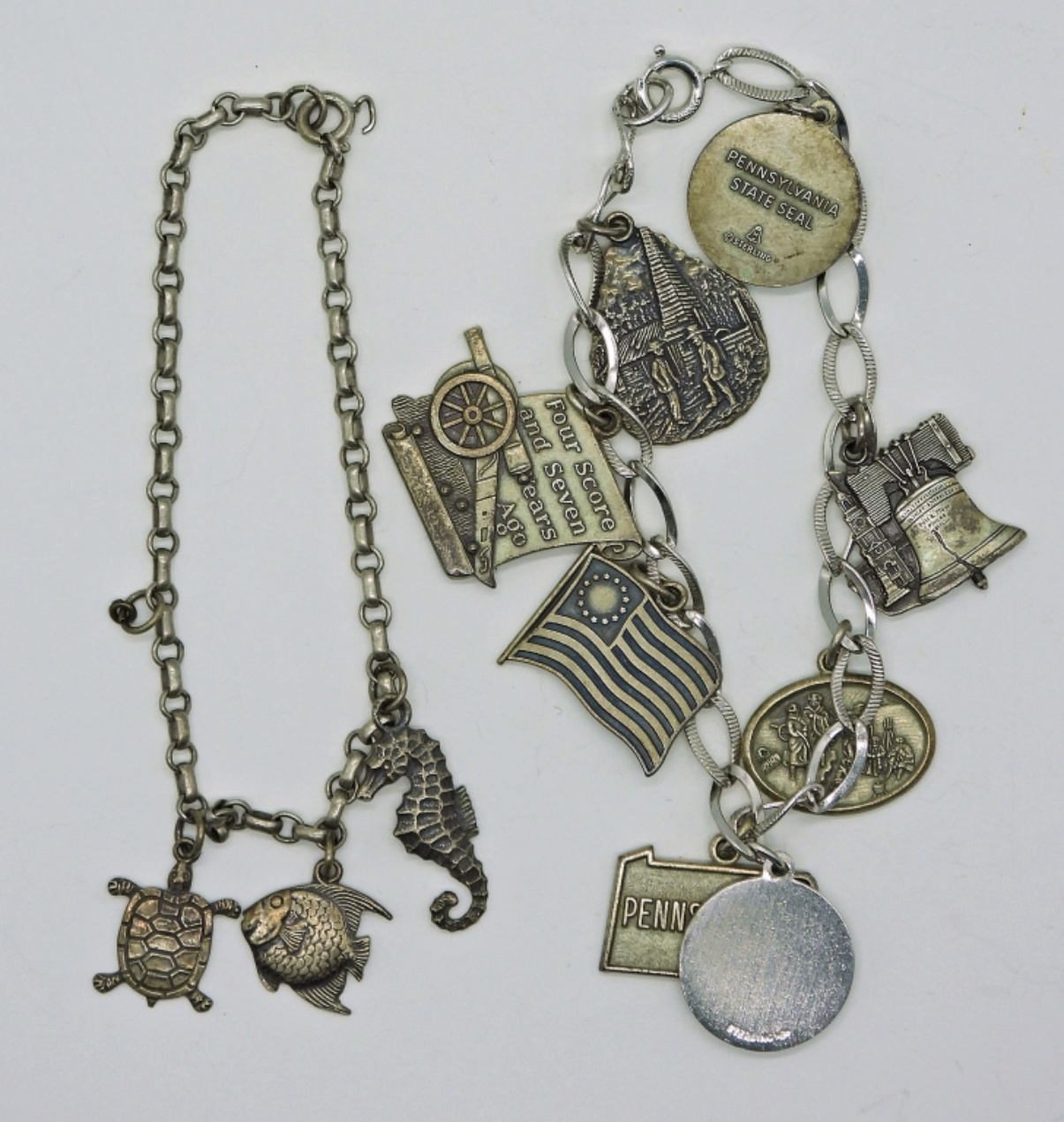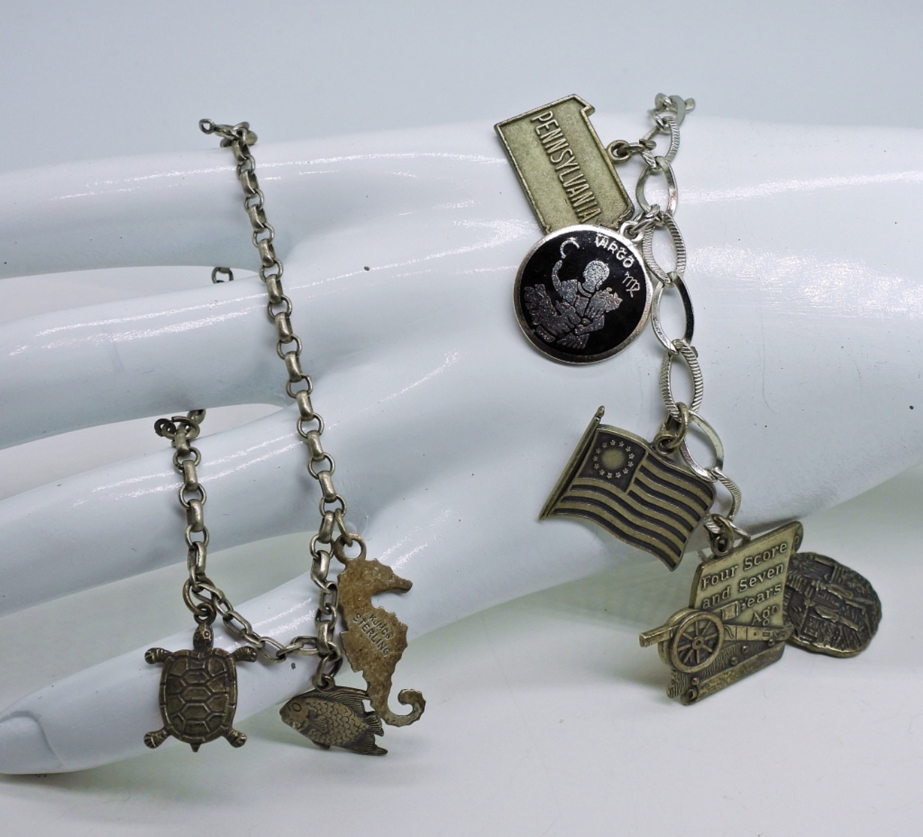 Two Vintage Sterling Charm Bracelets. 6″ & 7″, Eleven Charms. 23.5 DWT