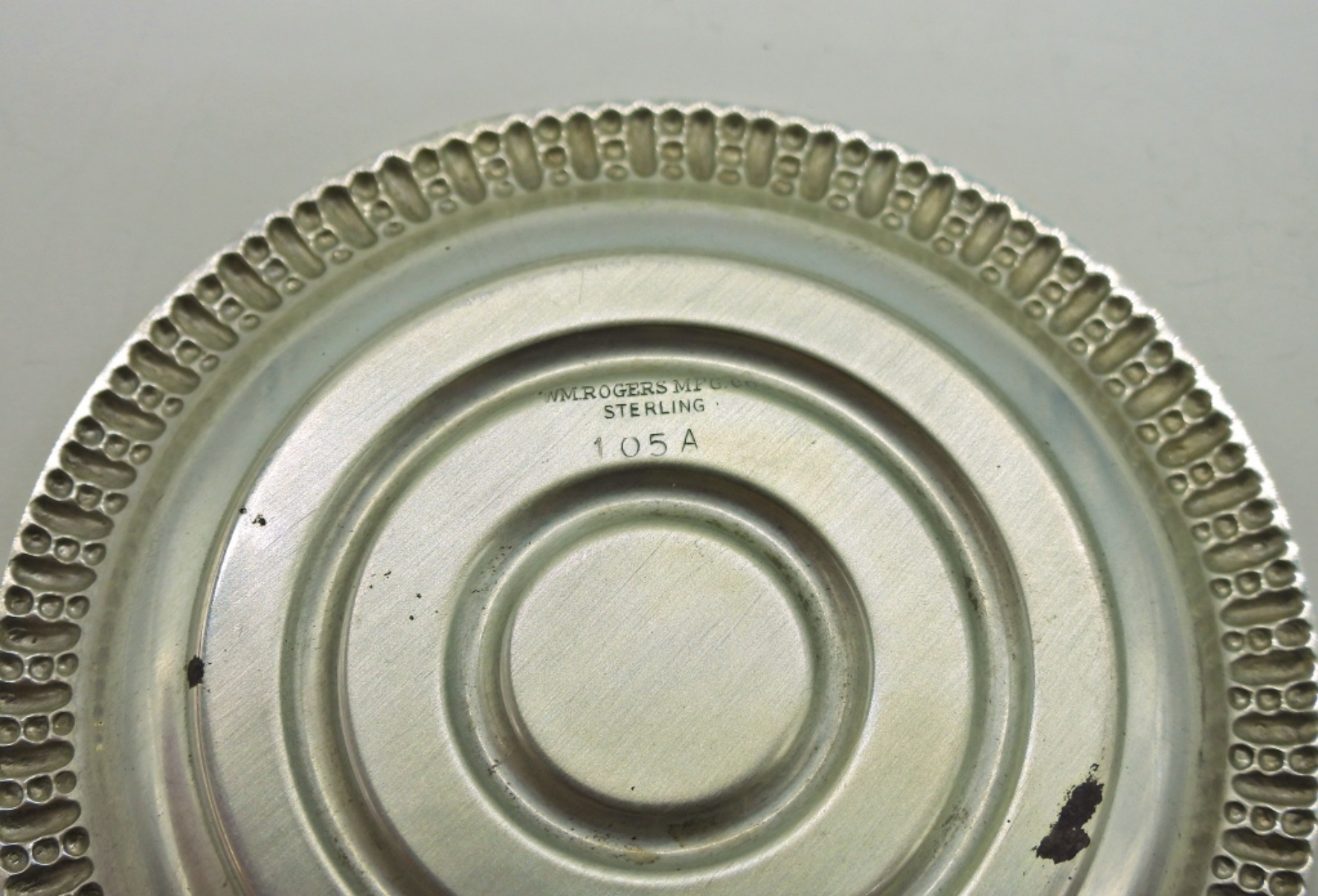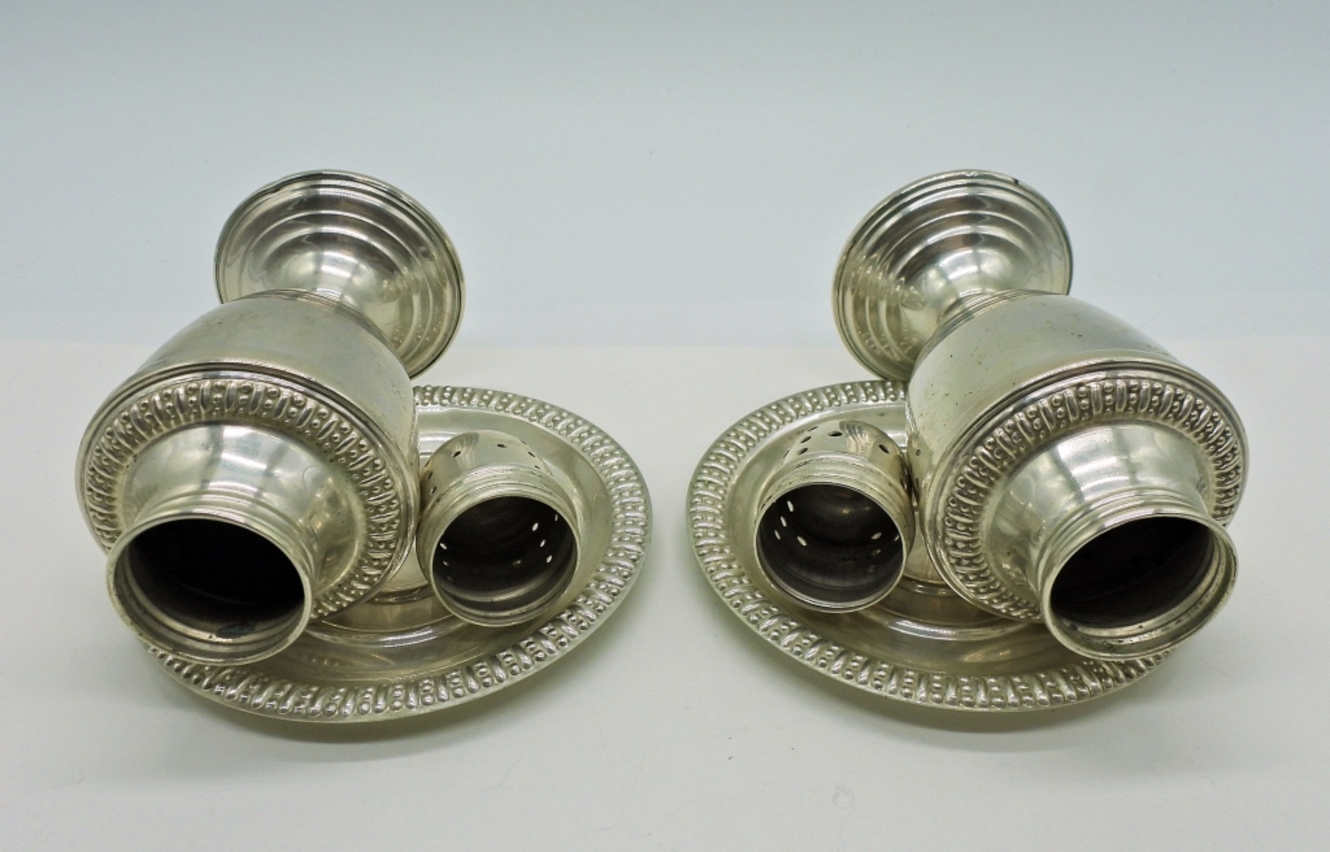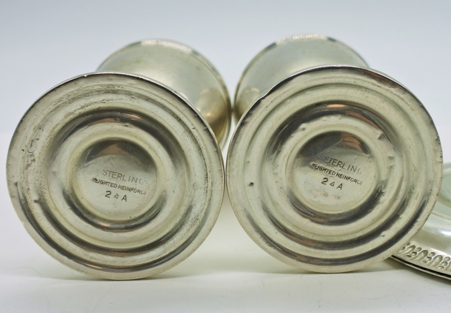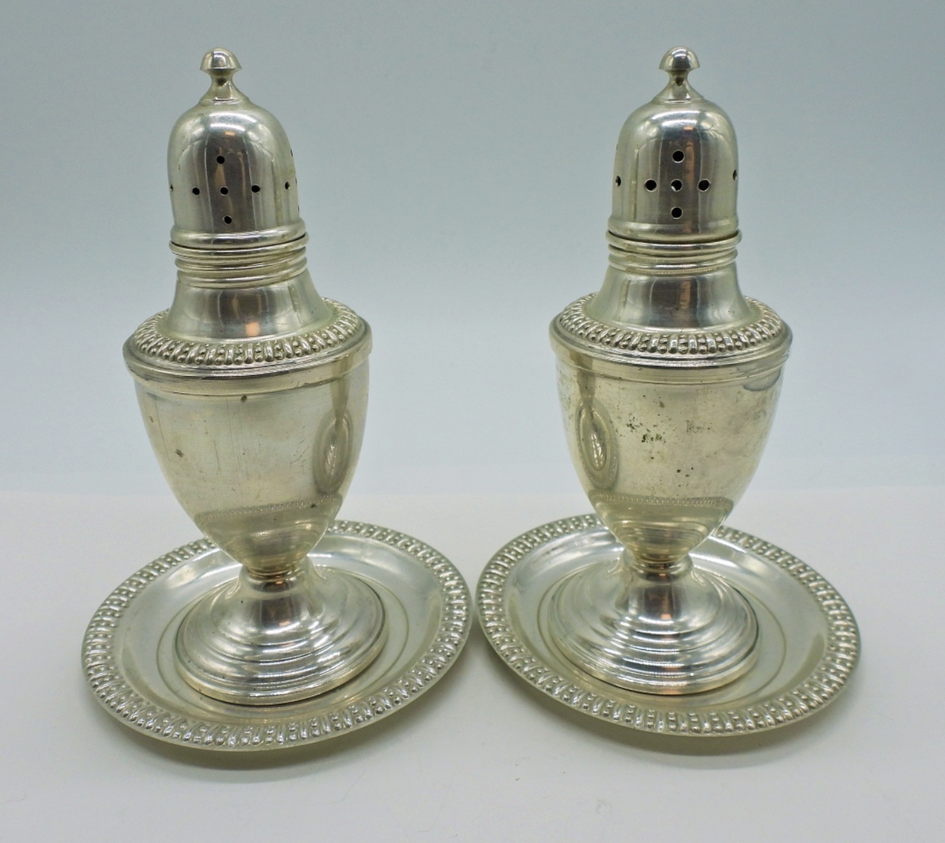 Vintage Sterling Set of Salt & Pepper Shakers with little plates to set on. Shakers are 4.5″ tall. See photos for more measurements. 89.3 DWT
