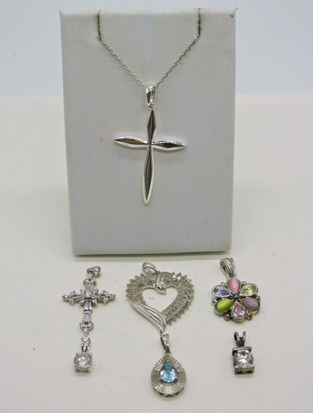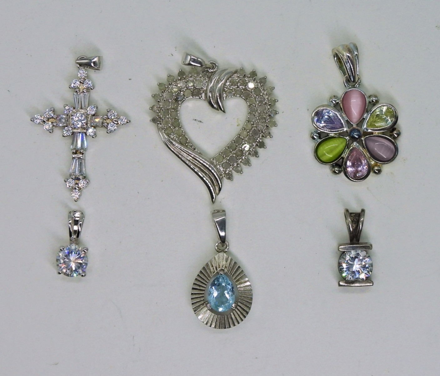 Seven Sterling Pendants with Various Gemstones and an 18″ adjustable chain. 11 DWT