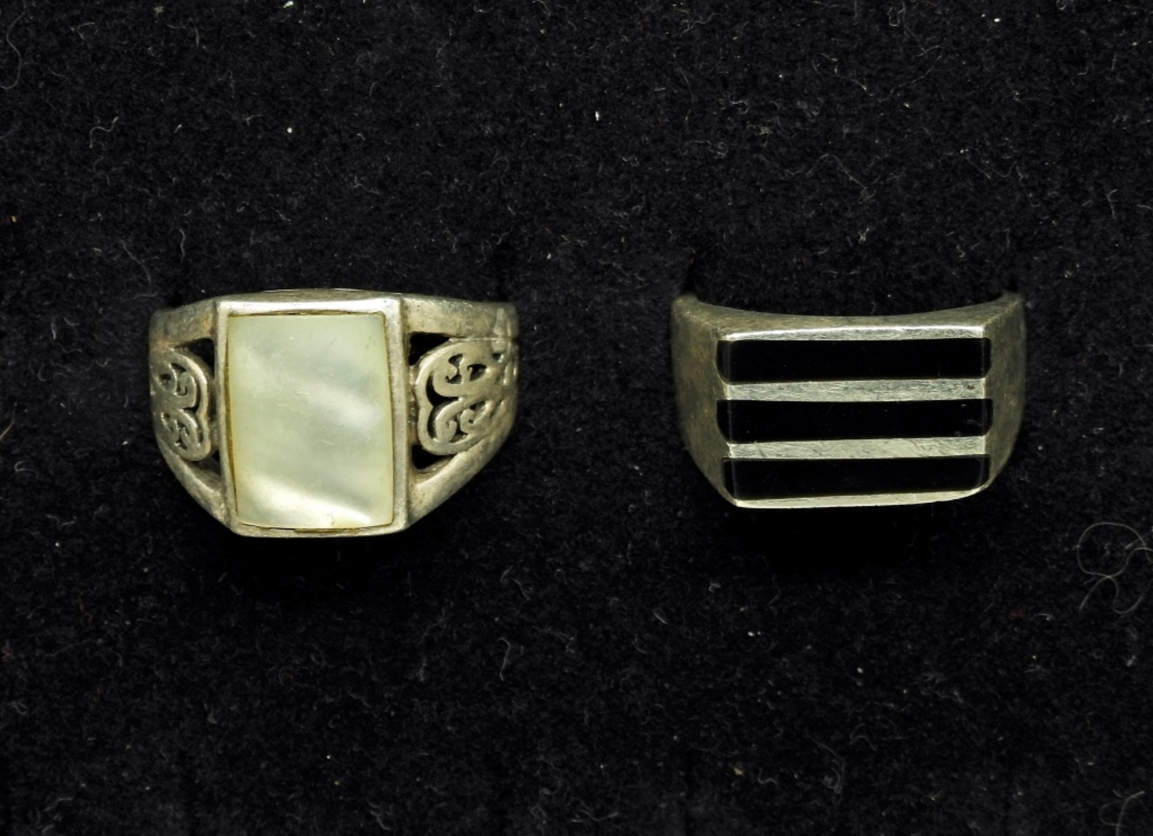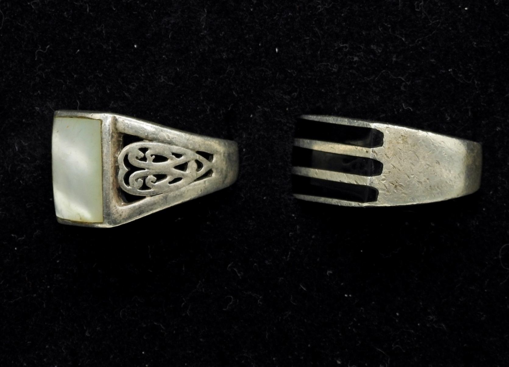 Two Sterling Rings, One wit Mother of Pearl, One with an Onyx Inlay. Sizes 6 & 6.5. Marked 925 9DWT