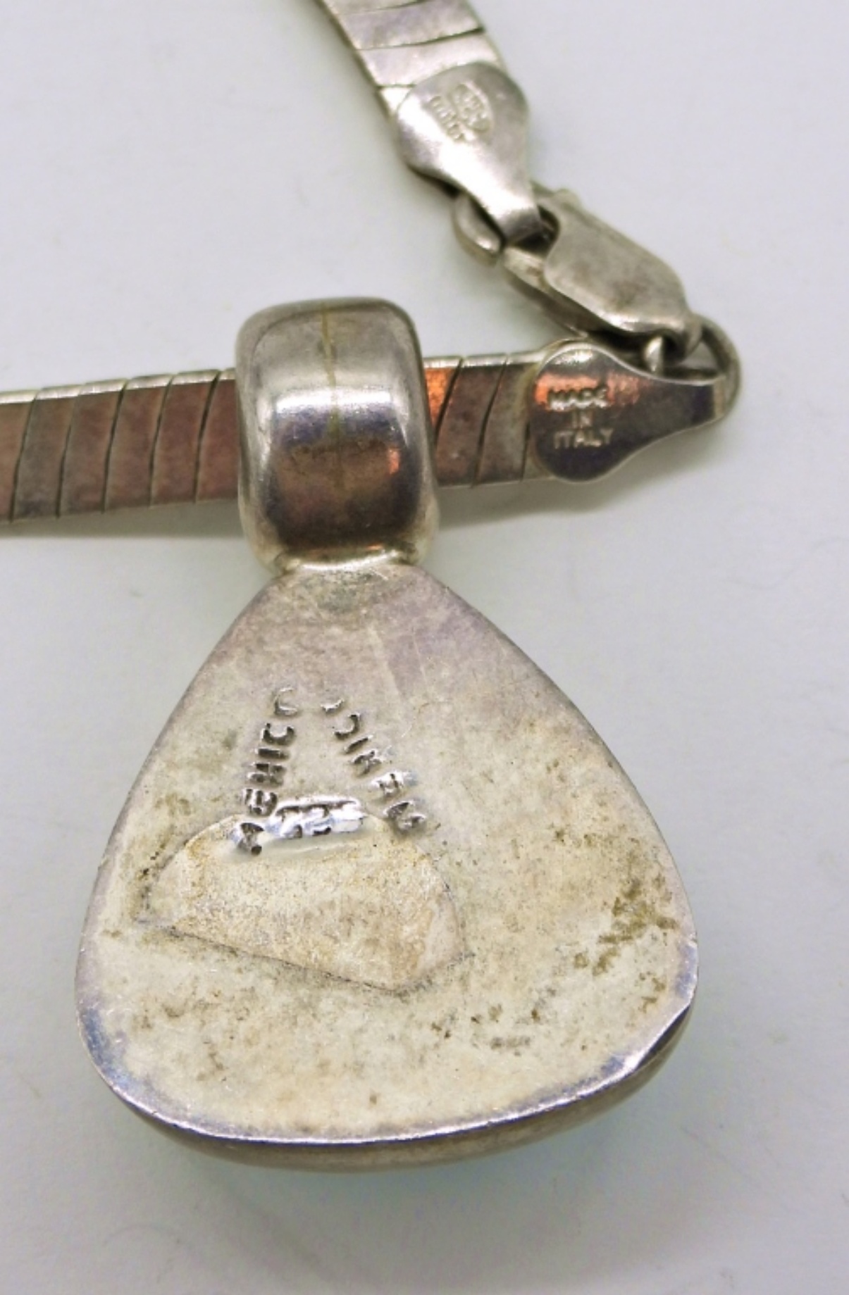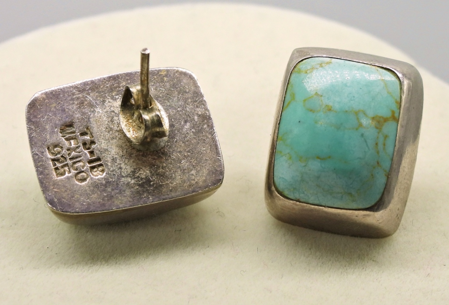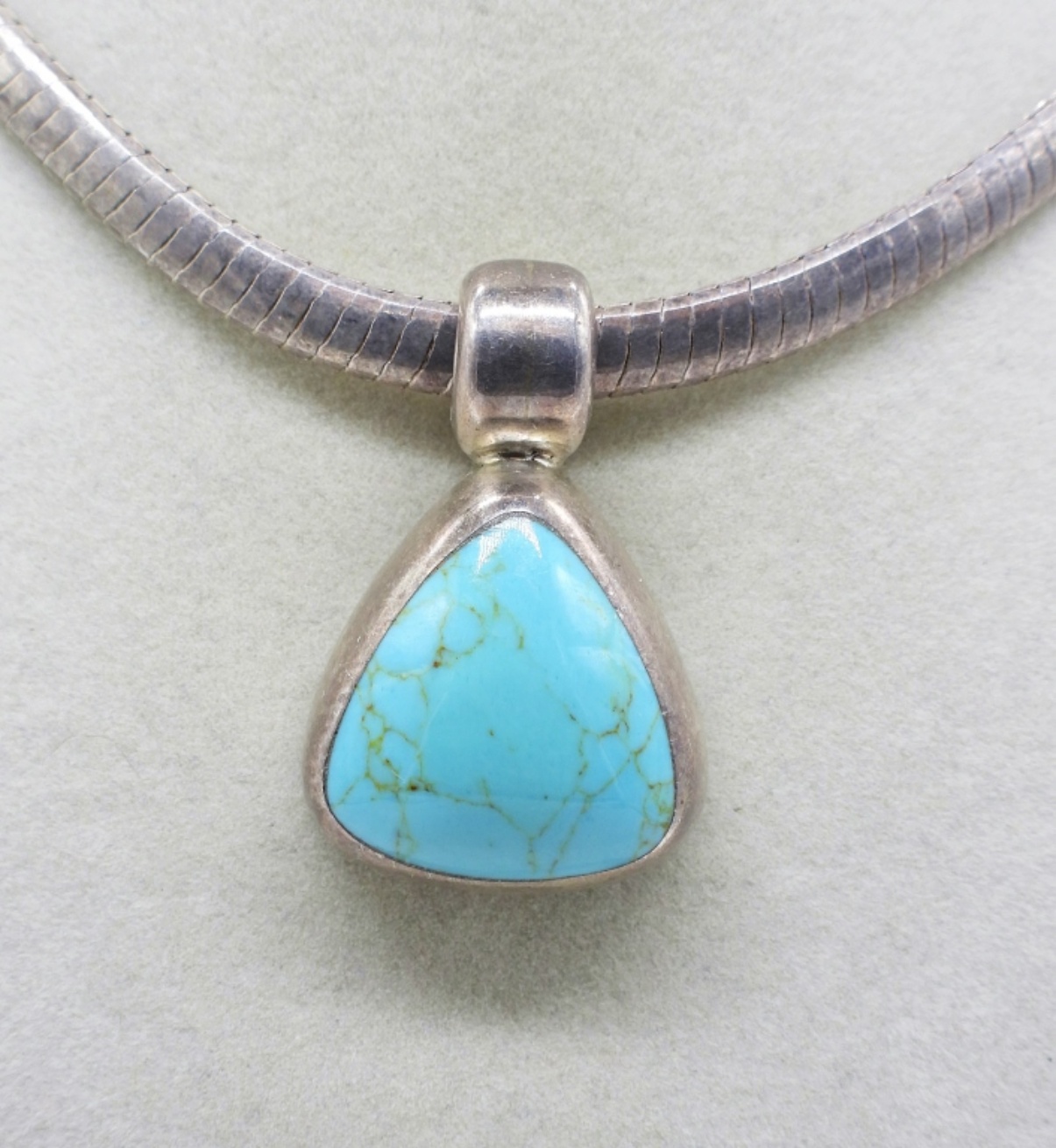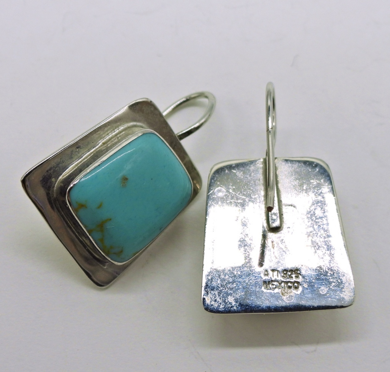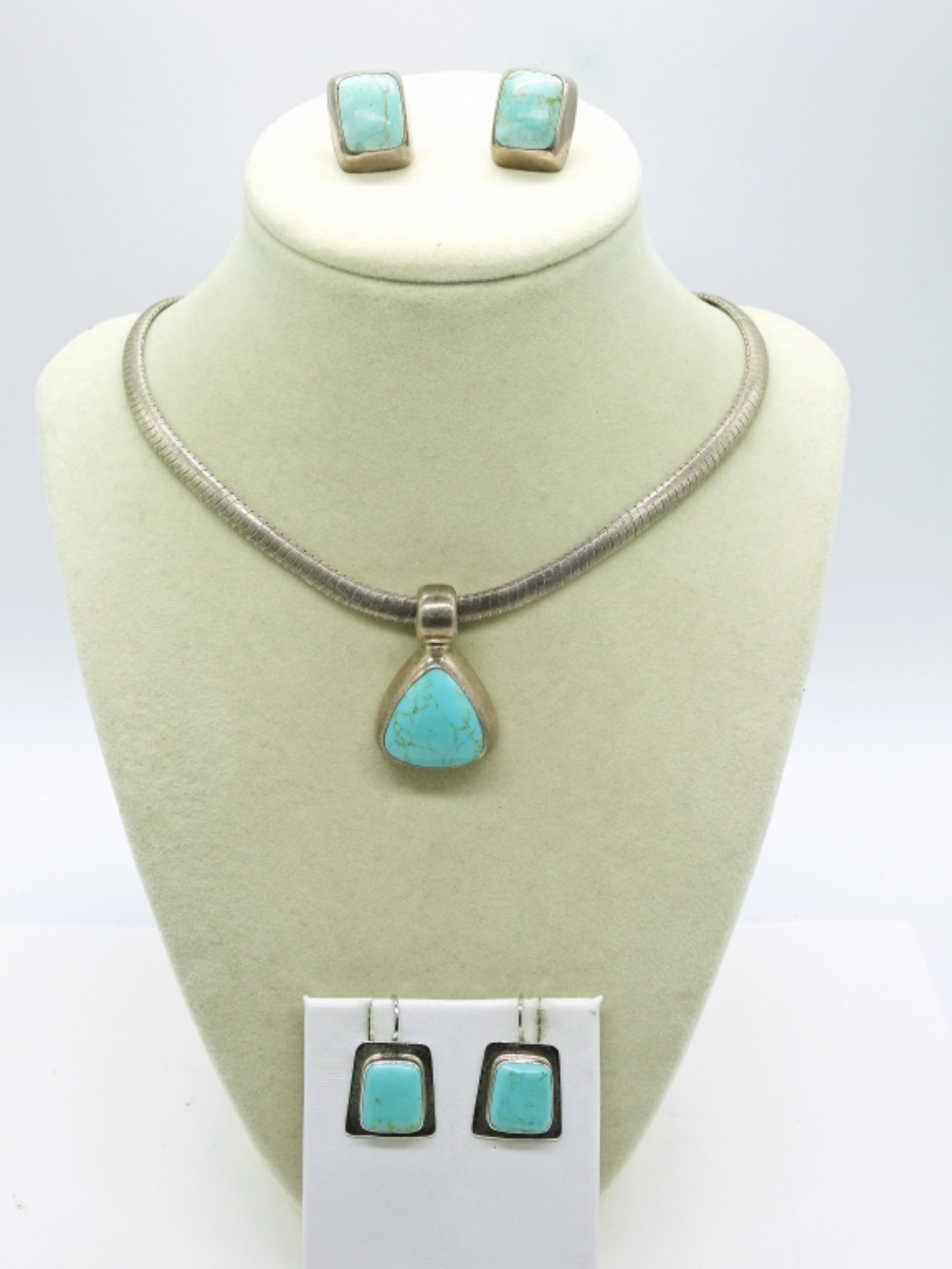 Vintage Sterling & Turquoise Gemstone Necklace and Two Pair of Matching Earrings. 16″ Necklace, Pendant measures 1″x 1.5″. All marked “925 Mexico”.