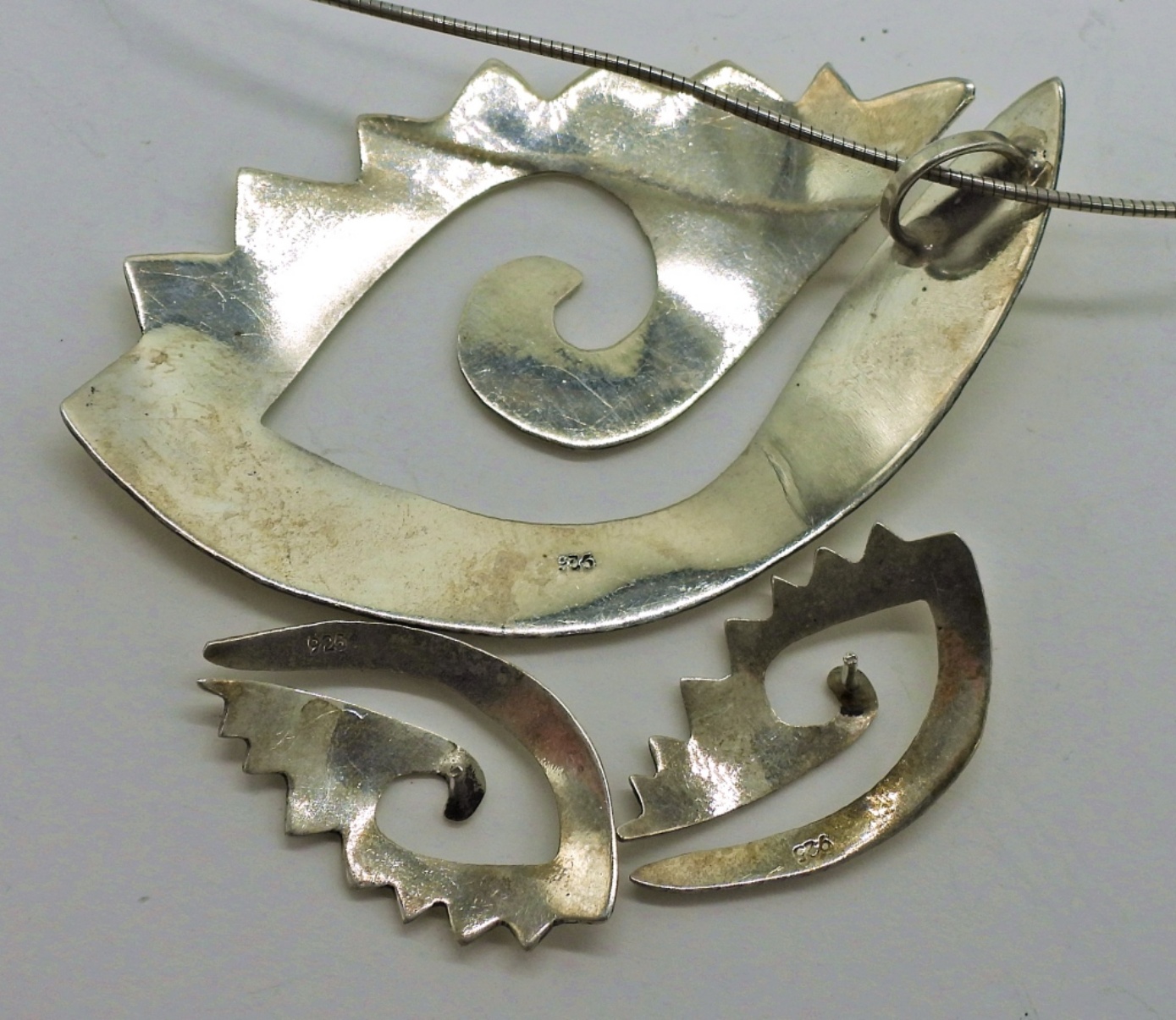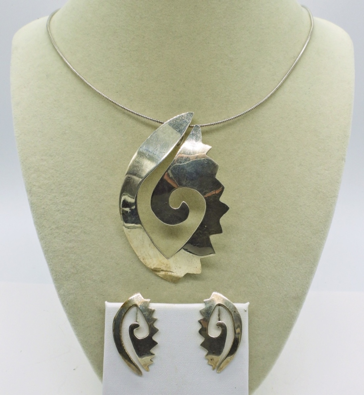 Matching Vintage Sterling Necklace and Earrings. 18″ Wire Chain with Pendant is 3″x 2″. Earrings are 1.5″ x 1″. 14.8 DWT