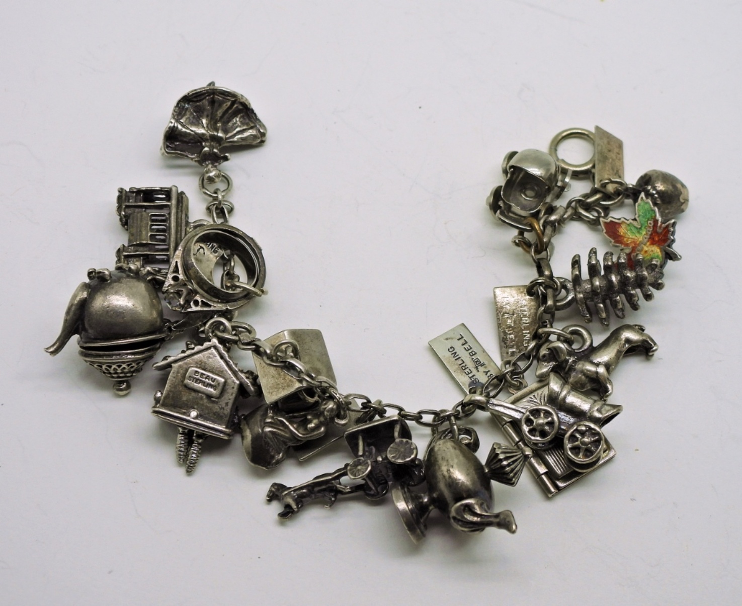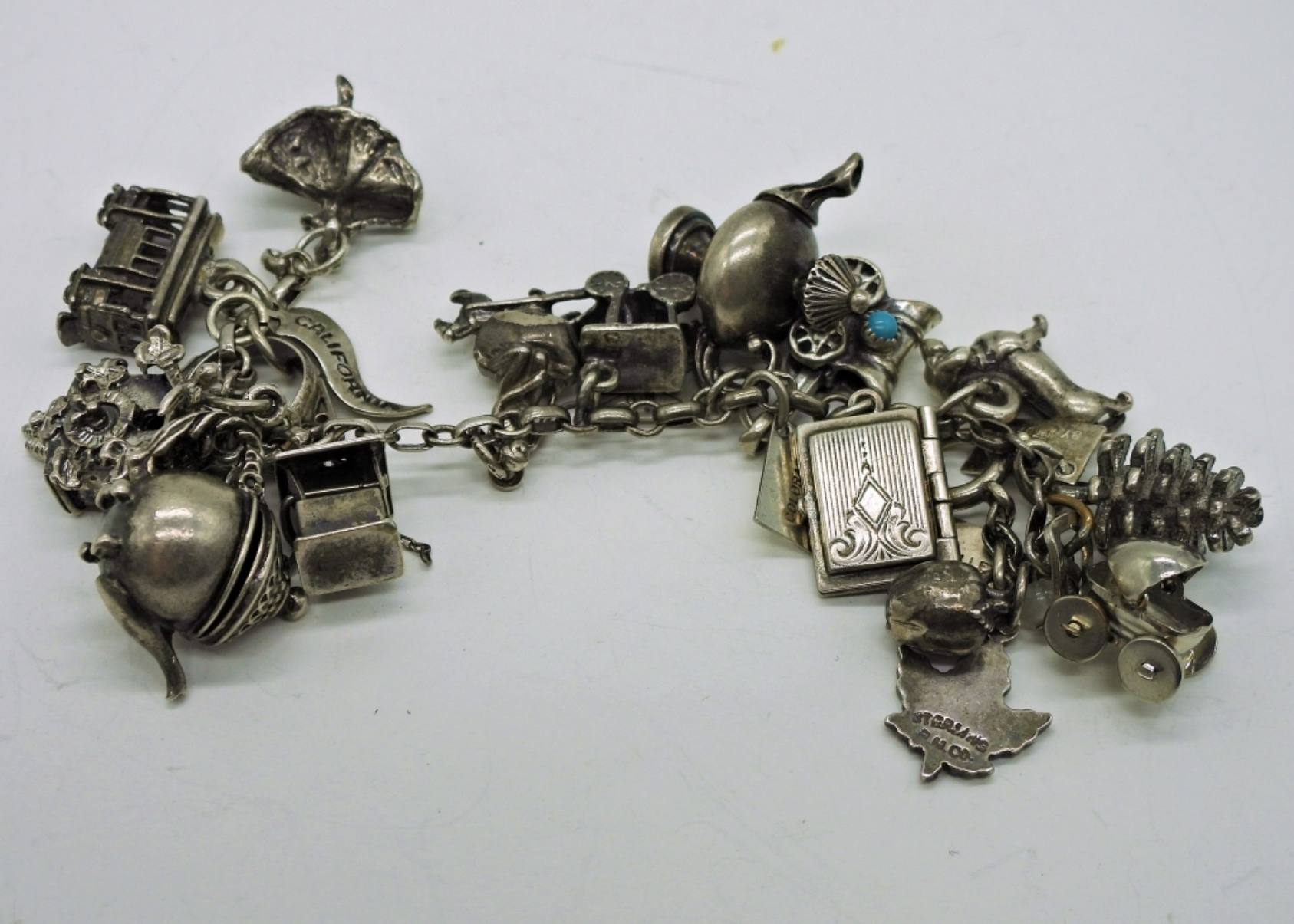 Vintage Sterling Charm Bracelet, 5″ with 16 Sterling Charms. 27.6 DWT