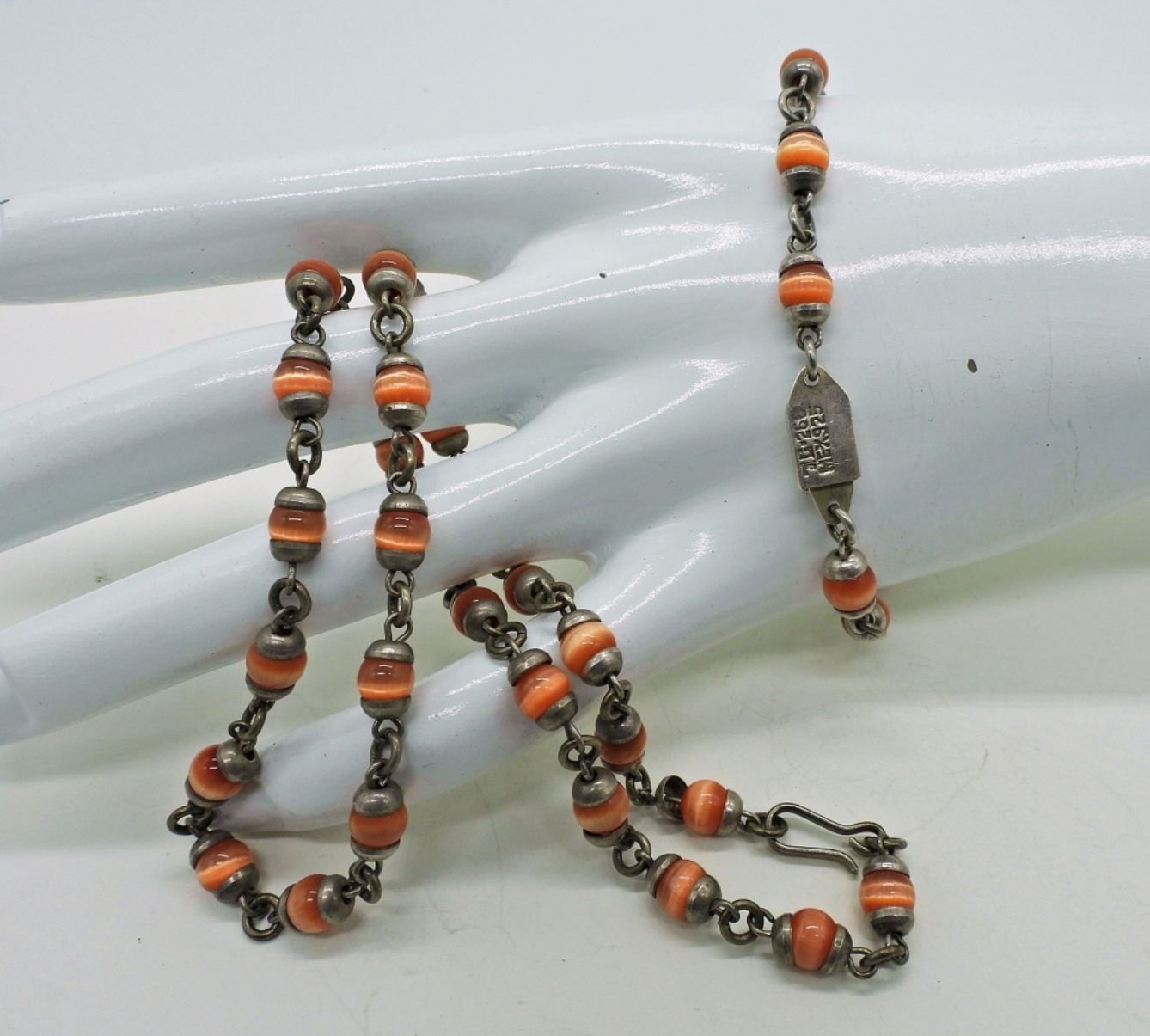Vintage Sterling “Mexico 925″ marked, Orange Cats Eye Necklace (17″) and Bracelet (8”). 24 DWT