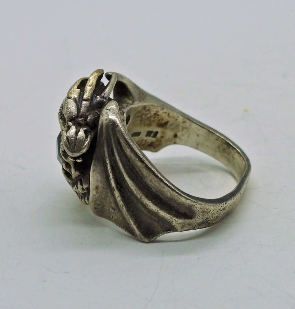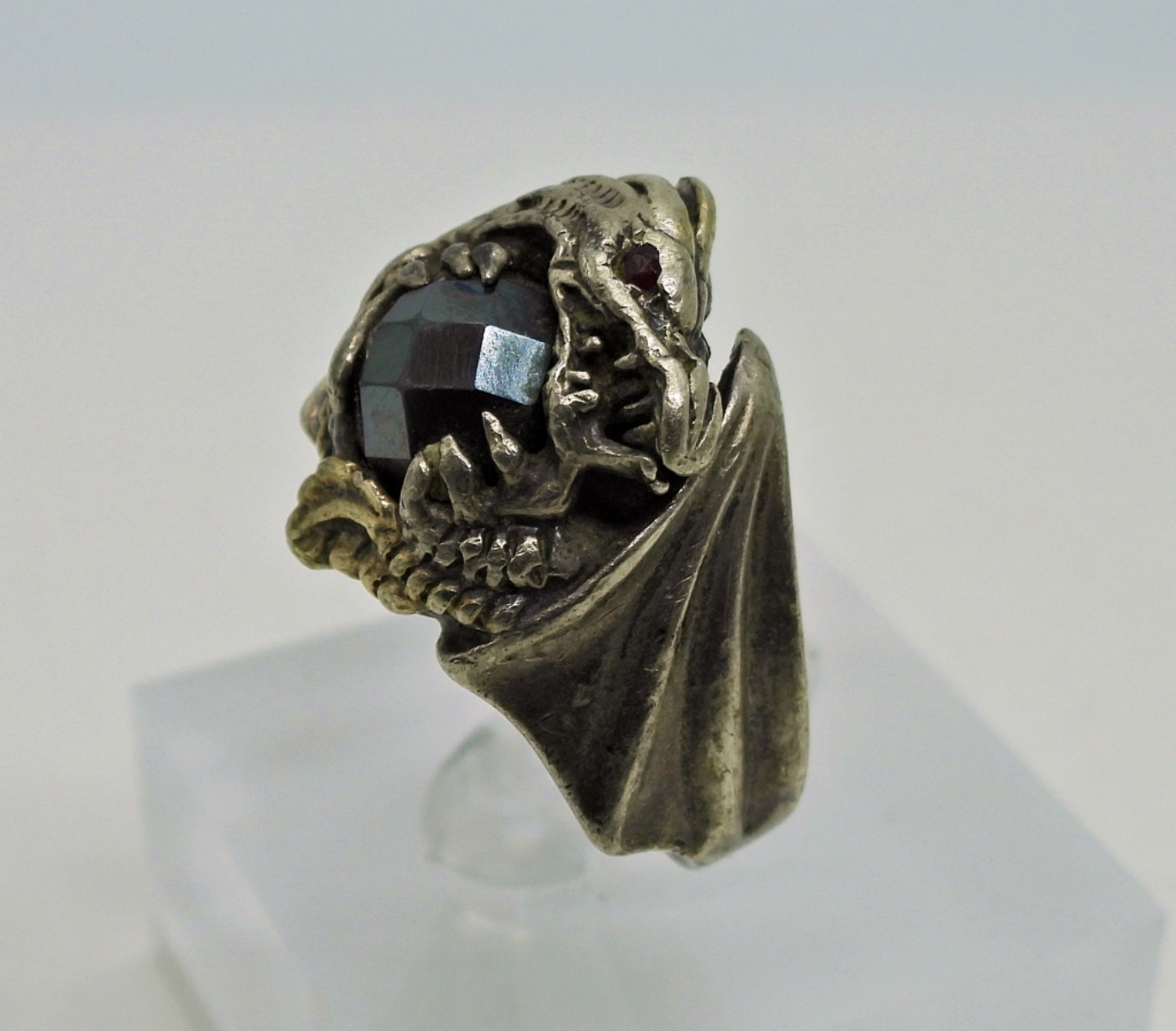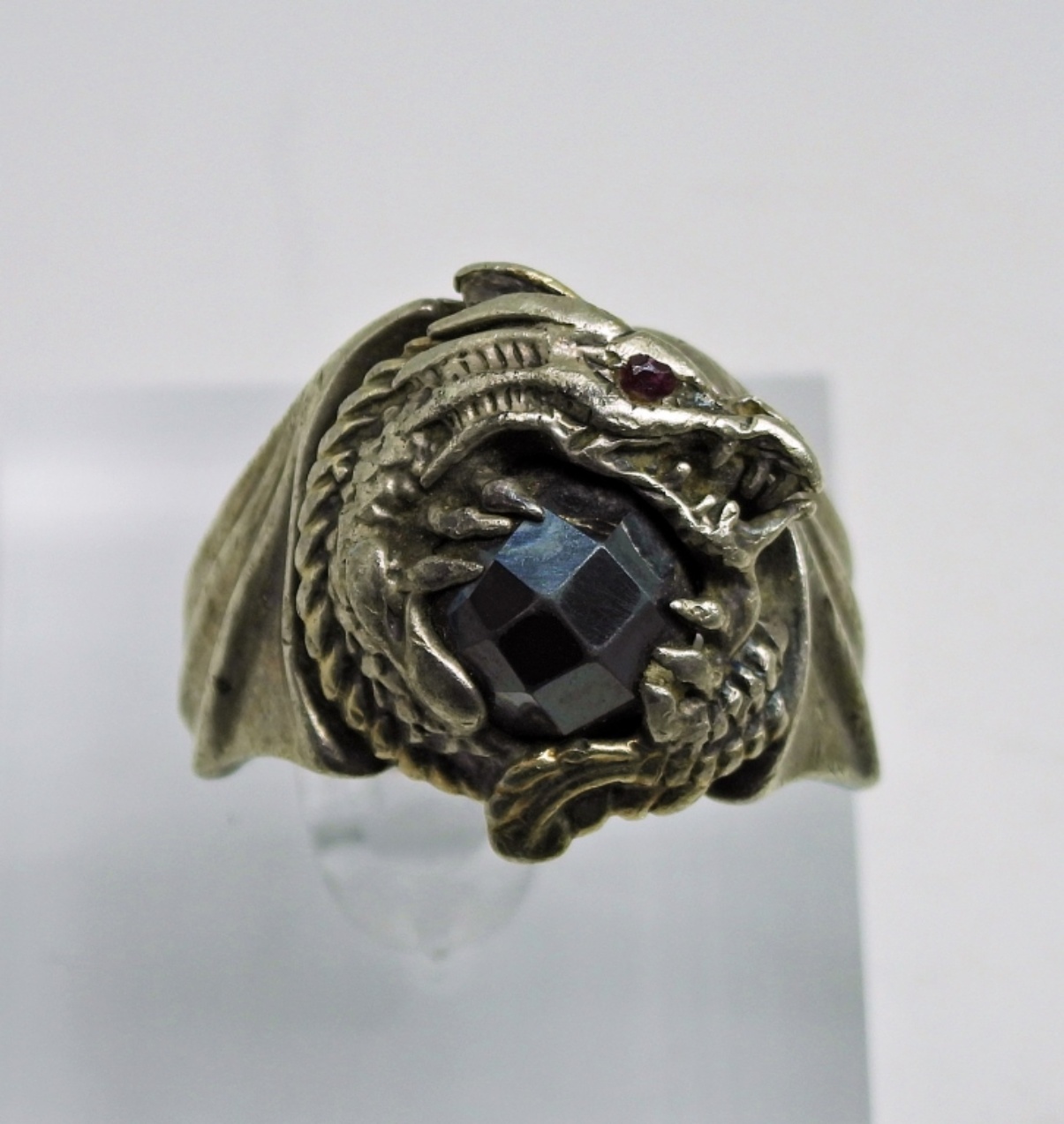 Vintage Sterling 1980’s Franklin Mint “Dragon Master” Ring with gorgeous Hematite Gemstone. Size 9-10, Band is disfigured. 11.8 DWT