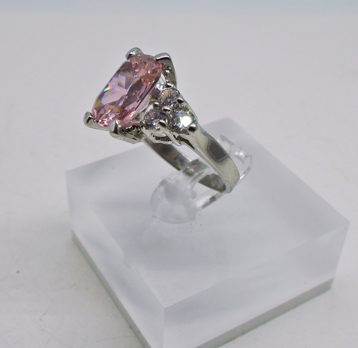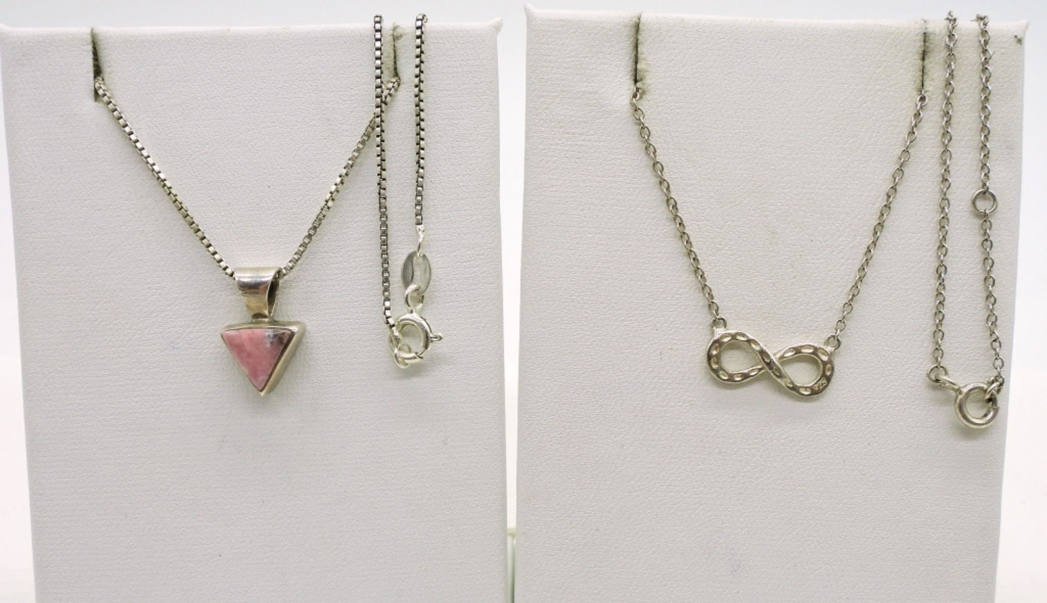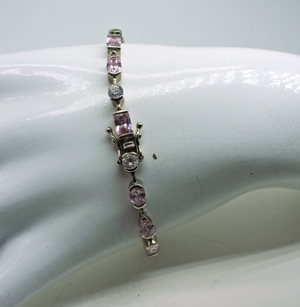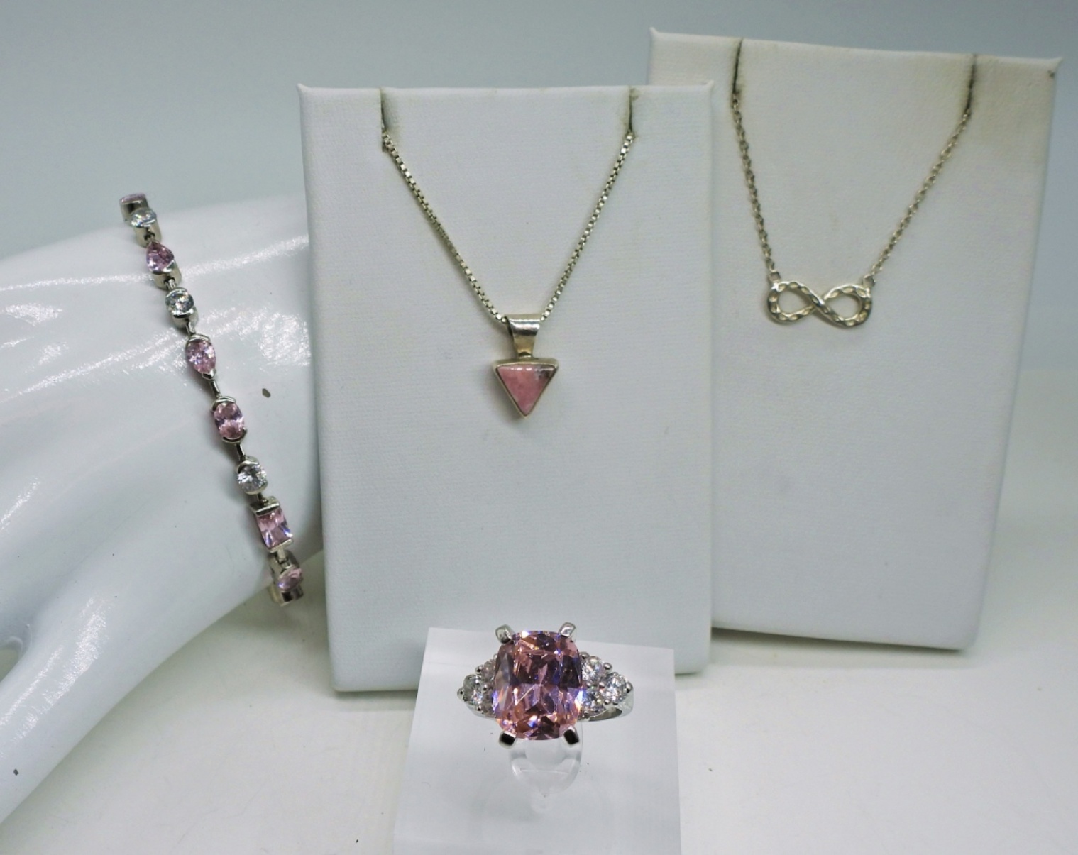 Sterling Bracelet with Pink and Clear Cubic Zirconia, Marked “ADI 925 Thailand CZ” 7.5″. Sterling Ring with Pink and Clear Gemstones, Size 6. Pink Triangle Gemstone Necklace, 18″. Sterling Infinity Necklace, 16″.